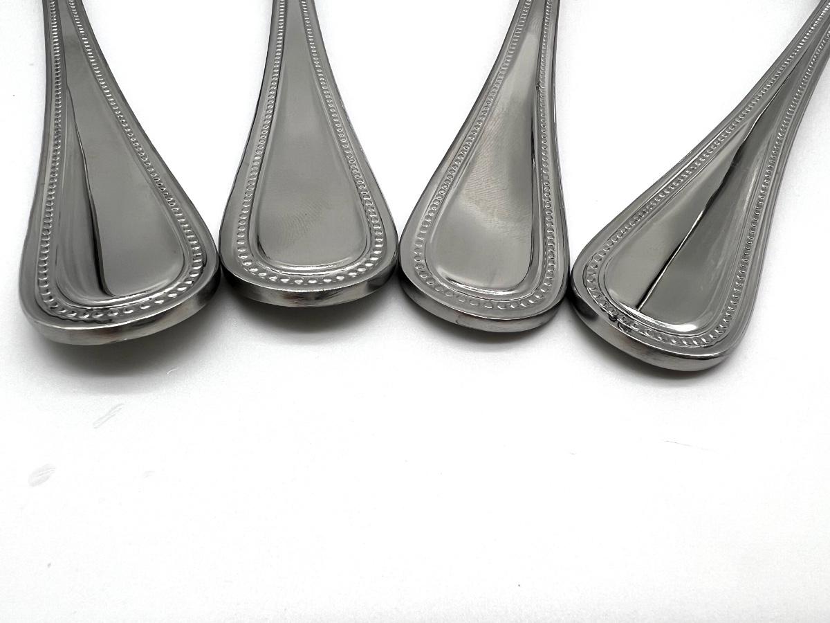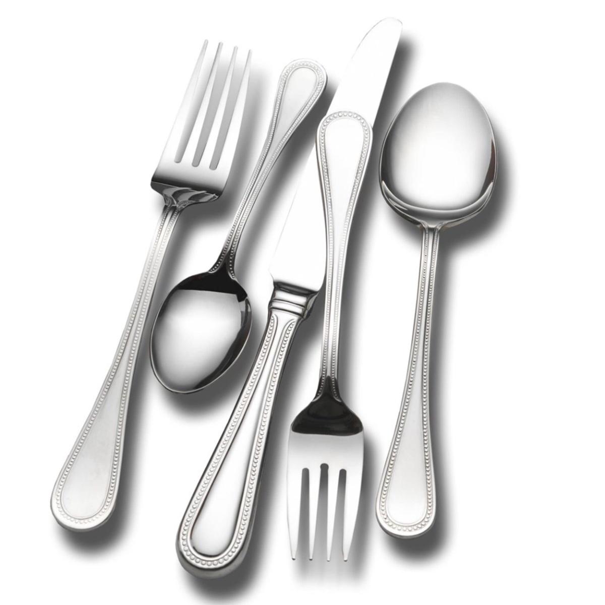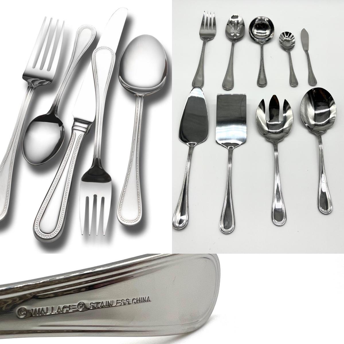 Only unwrapped for pictures. Wallace Continental Bead Stainless-Steel Flatware and hostess Set, Service for 12. Set includes 12 butter knives, 12 steak knives, 12 salad forks, 12 dinner forks, 12 dinner