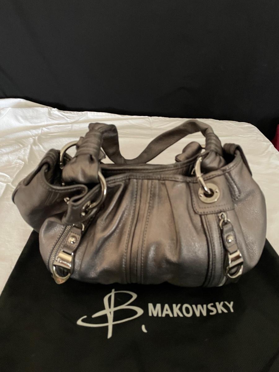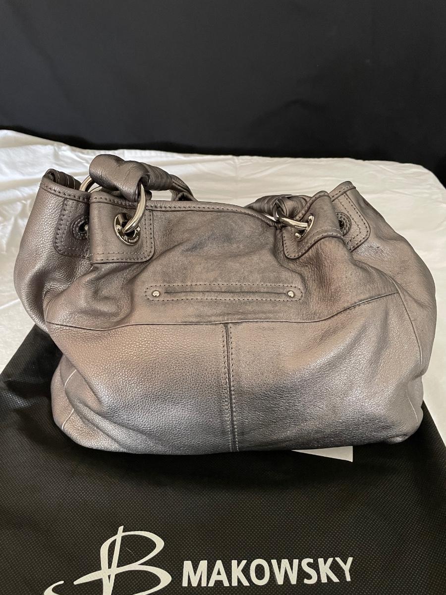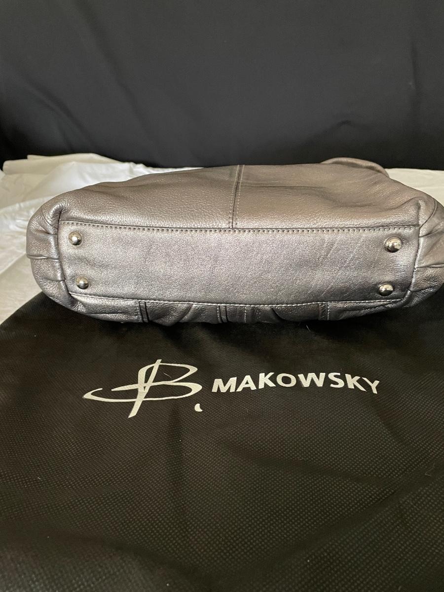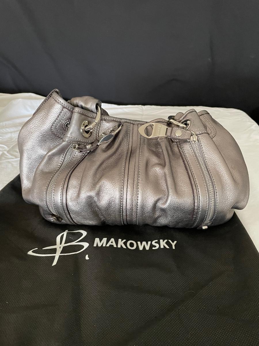 SILVER BRAND NEW B,MAKOWSKY PURSE WITH PRINTED LINING