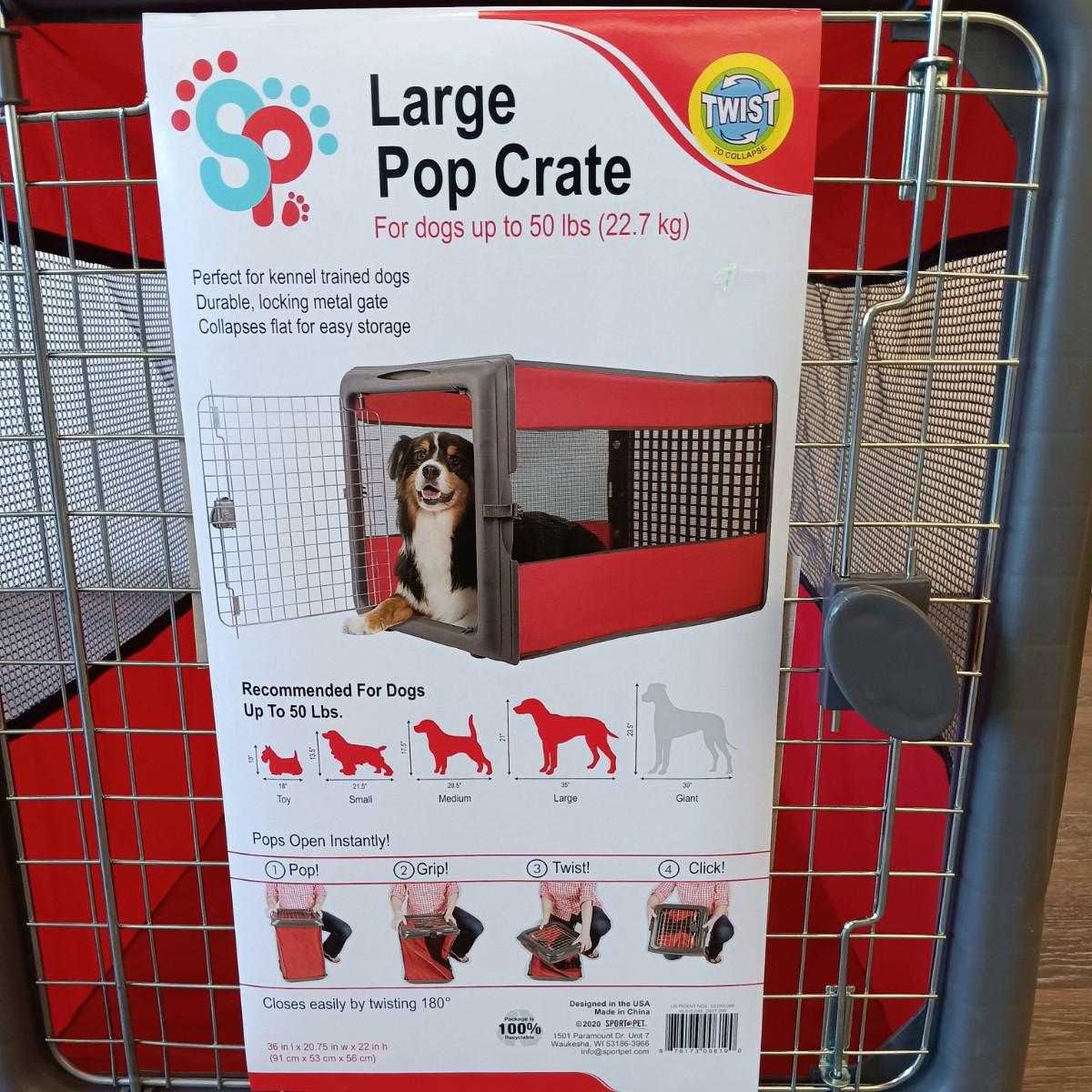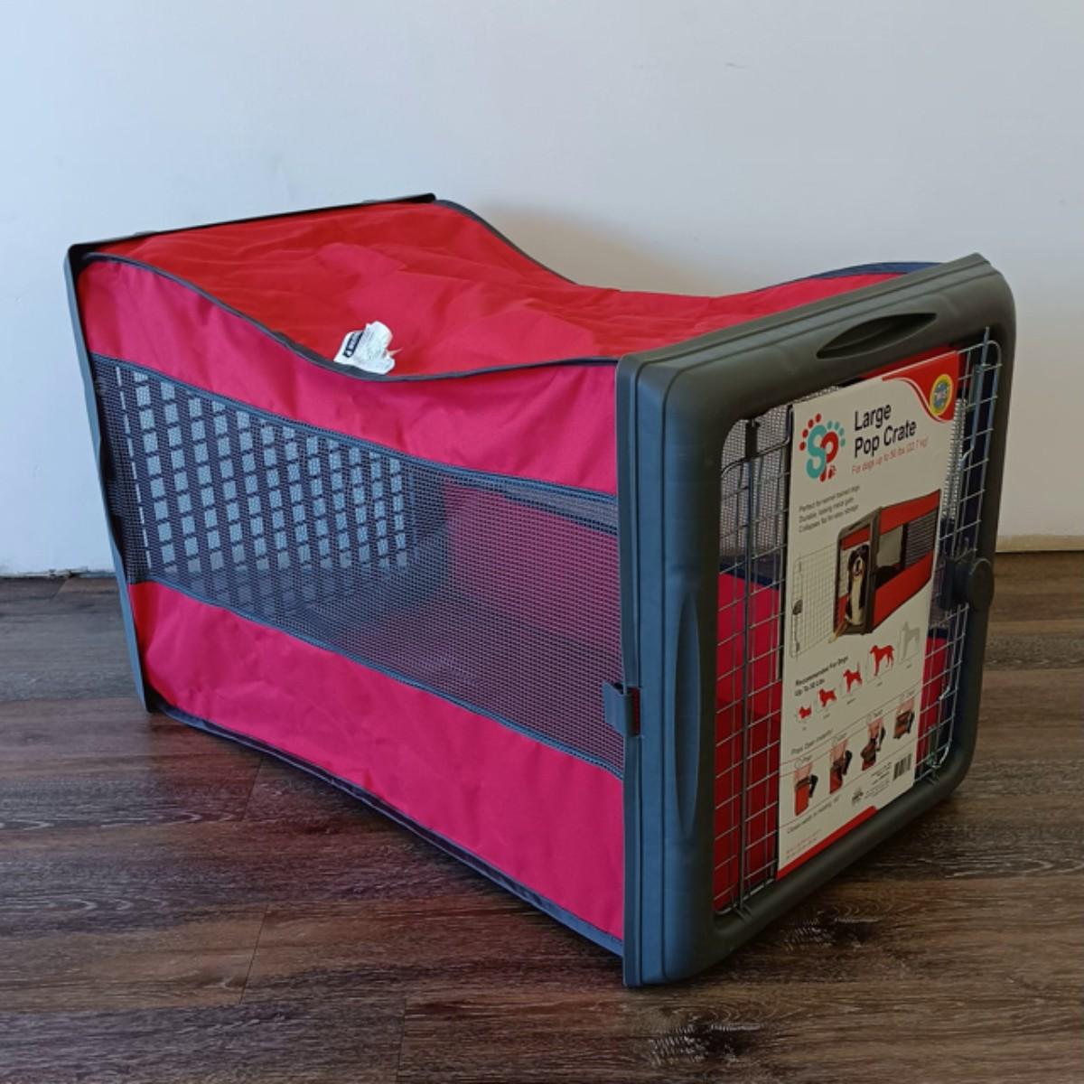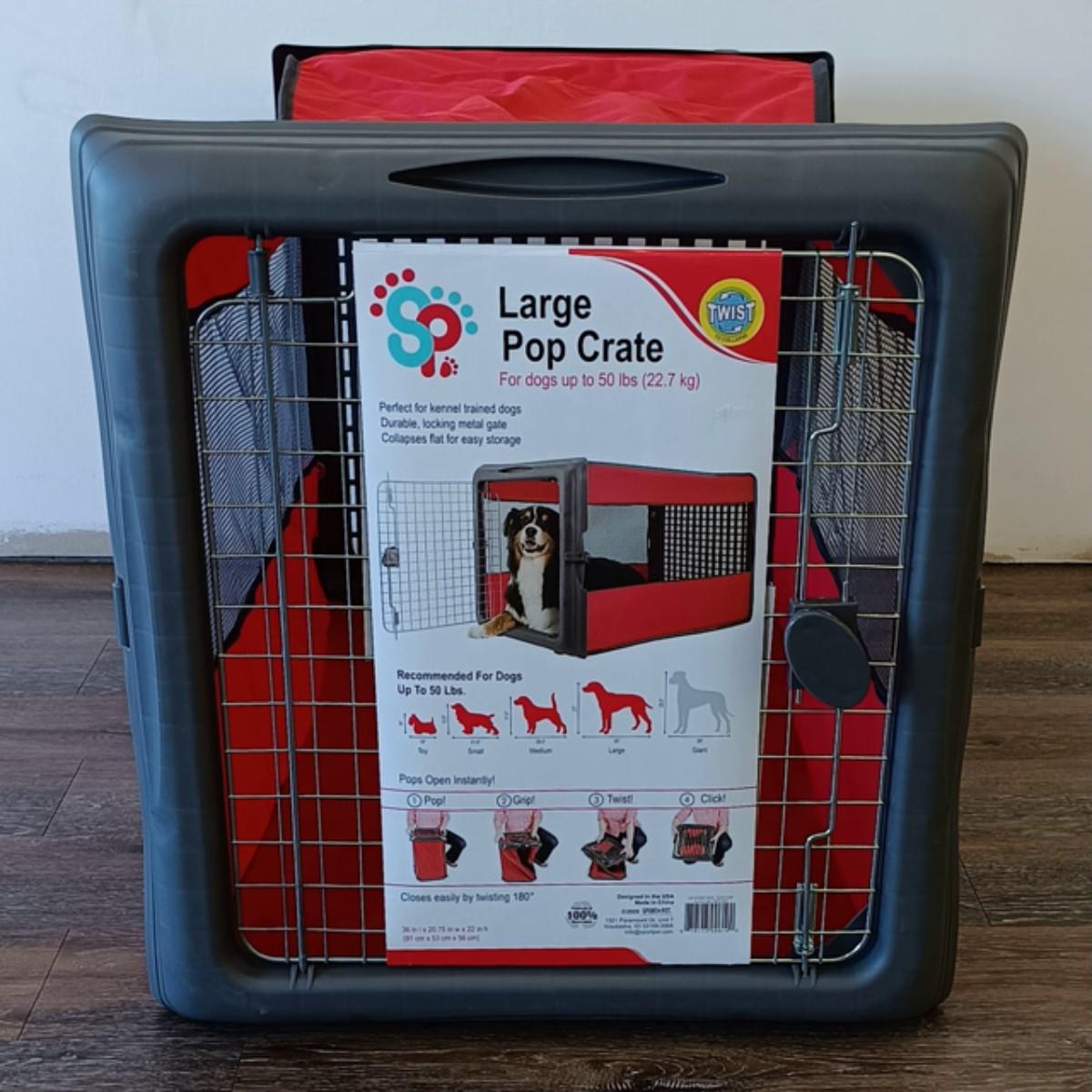 This is a brand new collapsible, pop-up style large breed dog crate. The large breed create measures approximately 34" x 20" x 20".