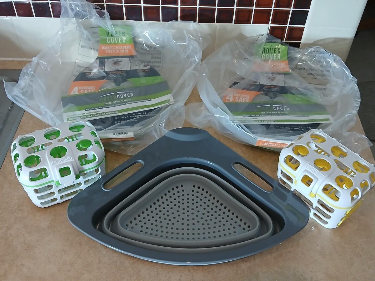 Brand new corner sink strainer with dishwasher baskets and microwave food covers
