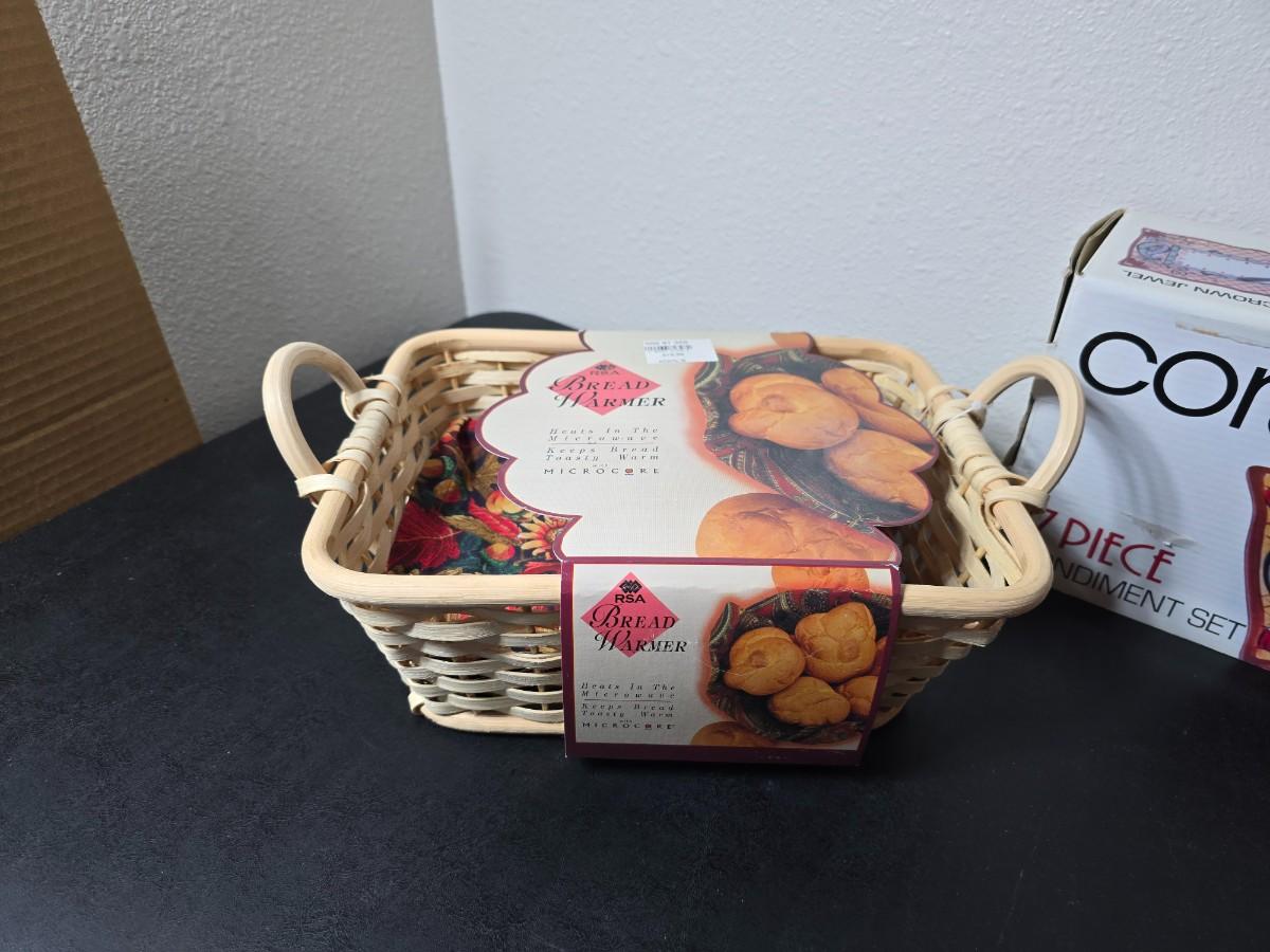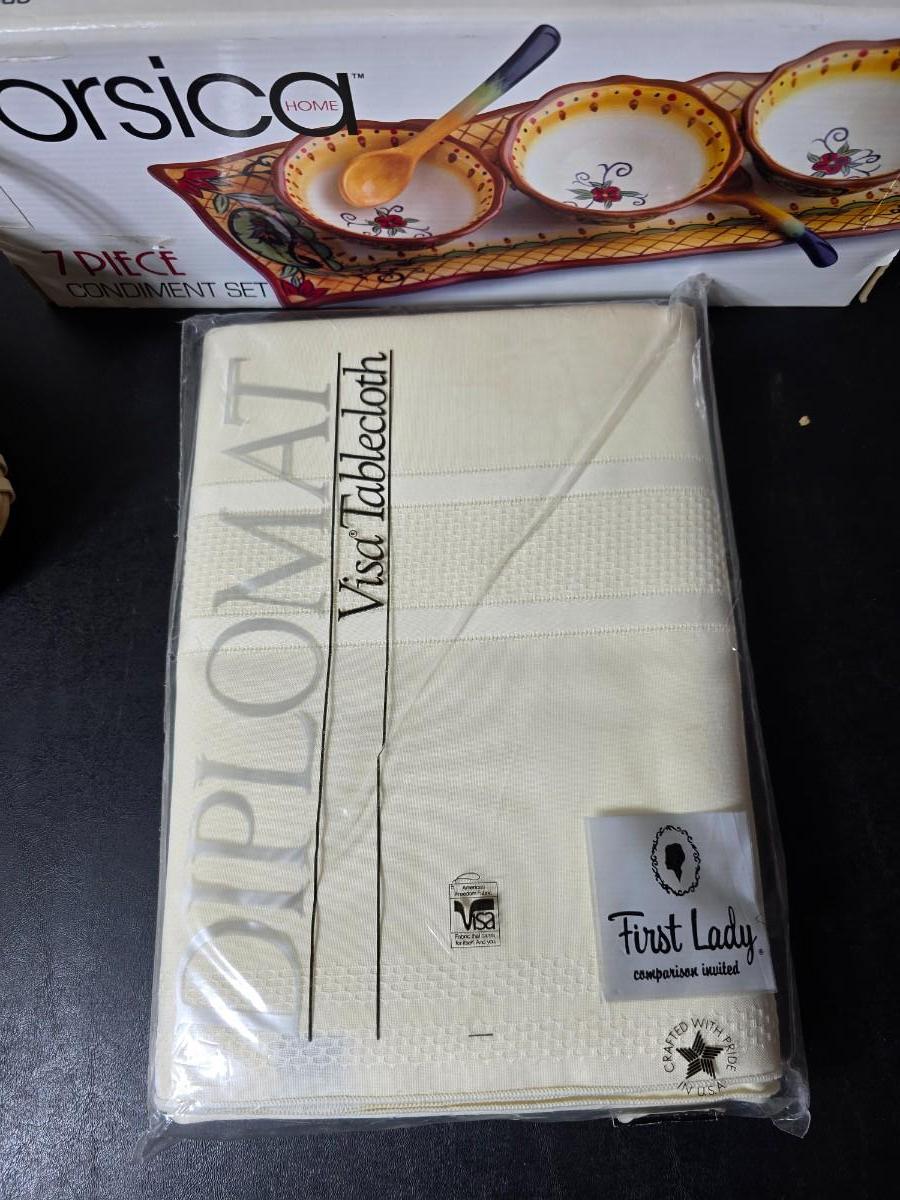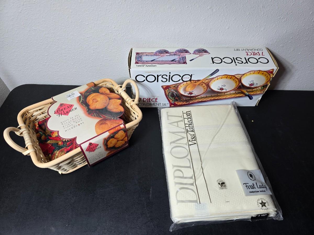 Brand new Corsica 7-piece condiment set - table cloth - and a bread warmer GREAT GIFT IDEAS!