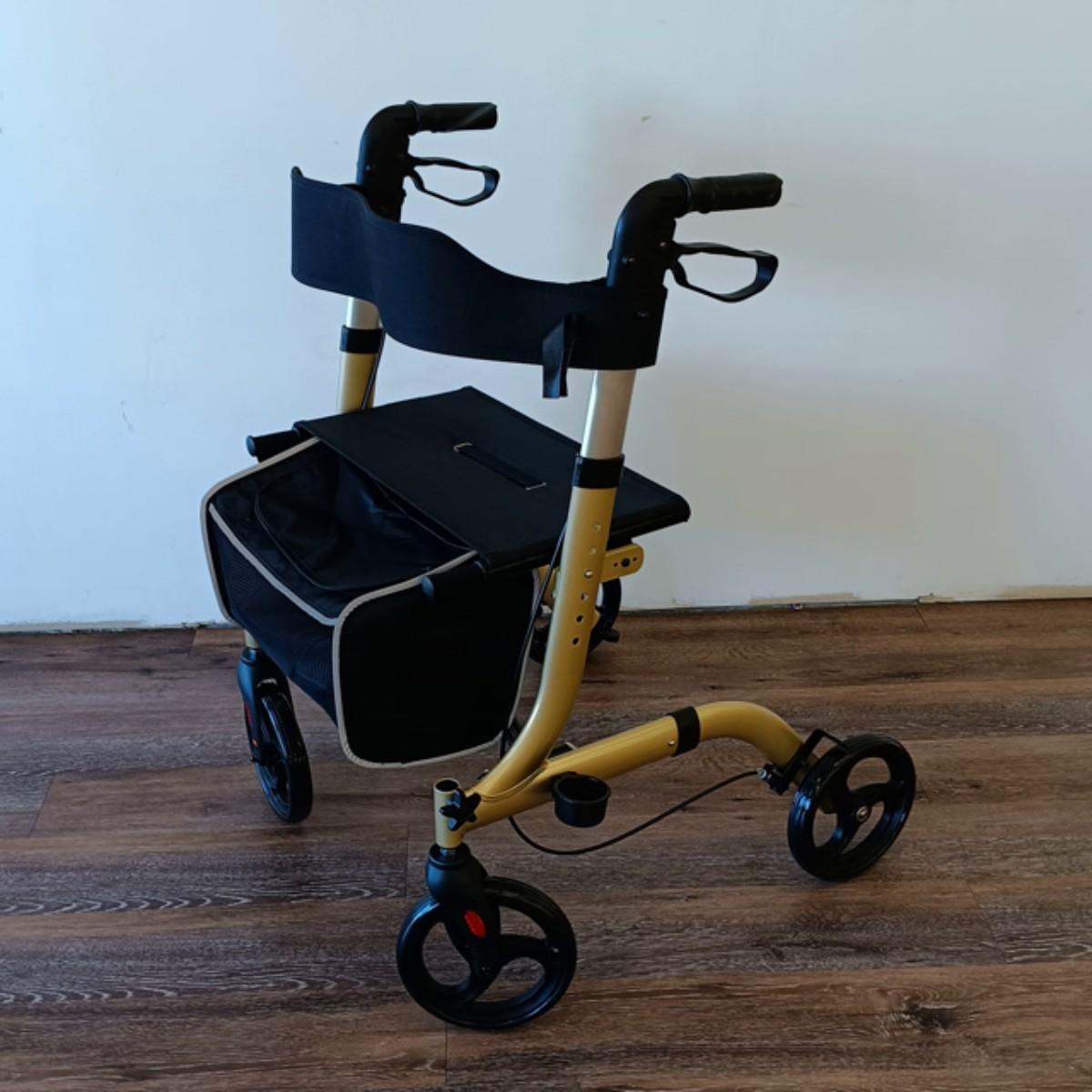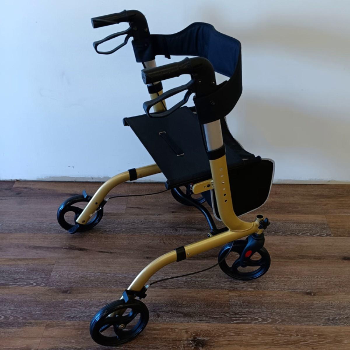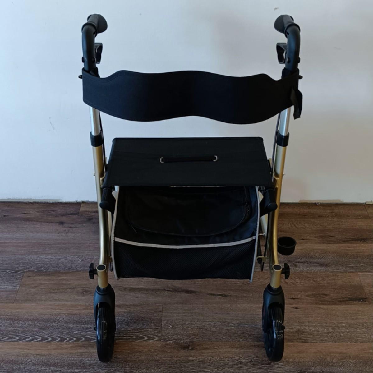 This is a brand new Medline Rollator folding walker. The walker folds up easily for storage or transport and has adjustable height handlebars. There is onboard cane storage and an additional zippered compartment for storage.