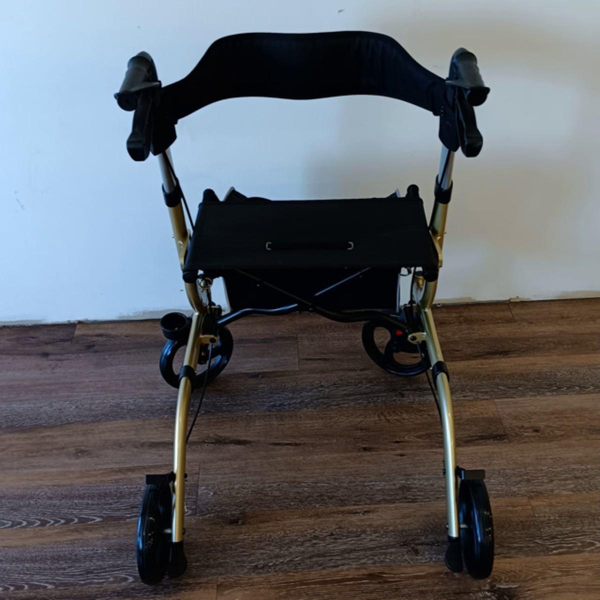 This is a brand new Medline Rollator folding walker. The walker folds up easily for storage or transport and has adjustable height handlebars. There is onboard cane storage and an additional zippered compartment for storage.