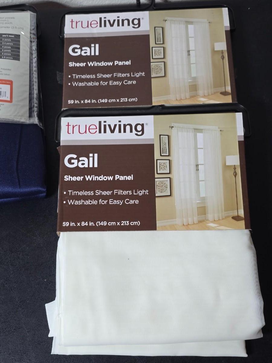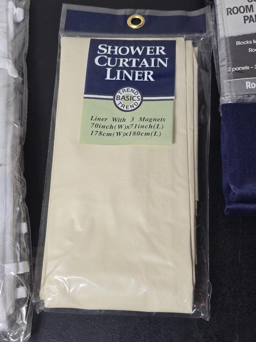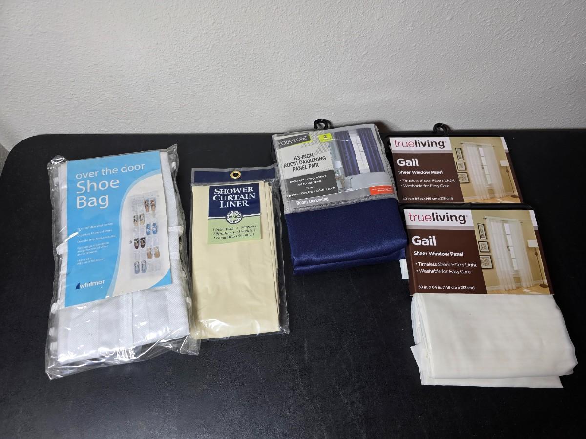 Brand new home must haves! Curtains -Sheer window panel - Shower Curtain liner - Over the door shoe bag