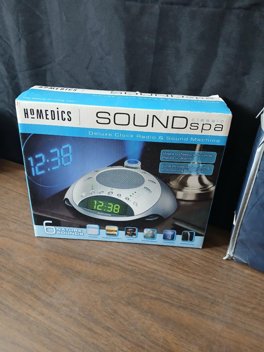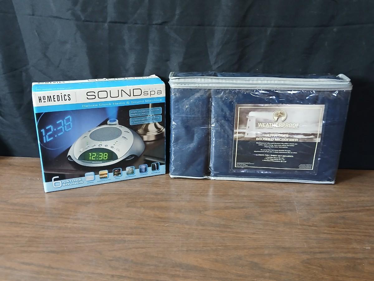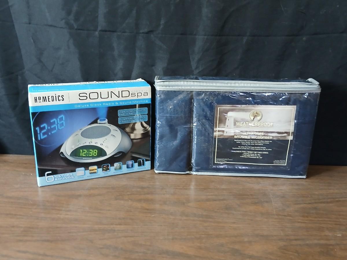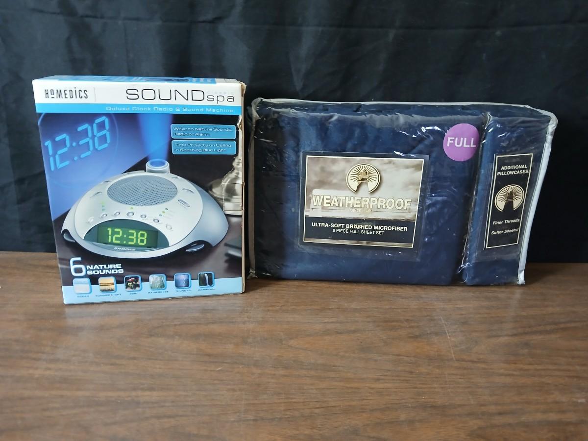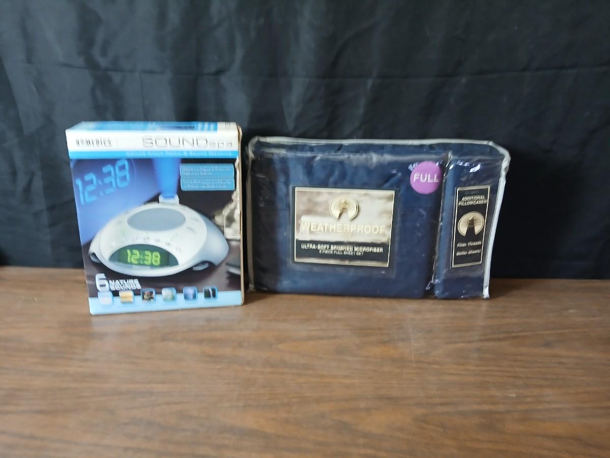 Brand new Homedics sound spa alarm clock with projectable time - and a new Full size 6-piece sheet set