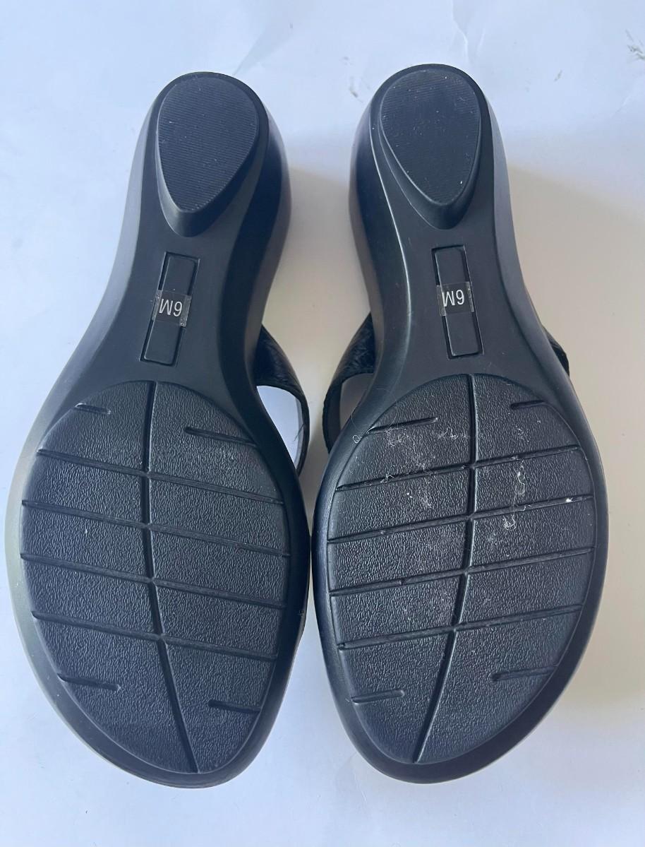 Design: These sandals boast a sleek black leather design with a stylish wedge heel that provides just the right amount of lift. The elegant yet understated look makes them versatile enough to pair with anything from casual outfits to dressier ensembles.