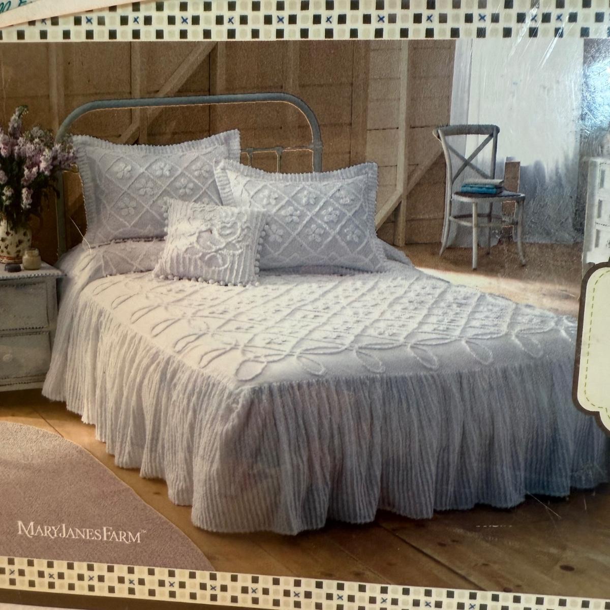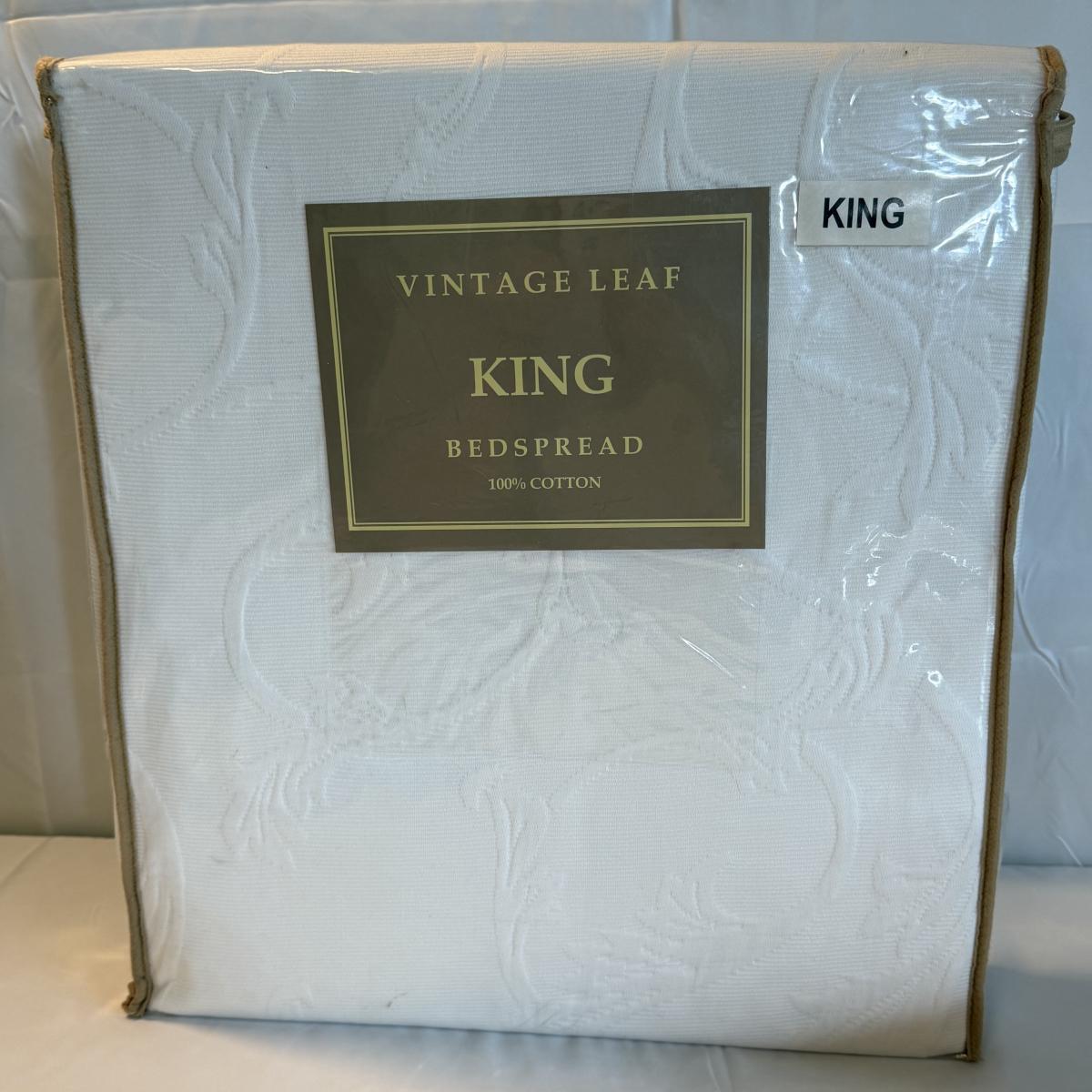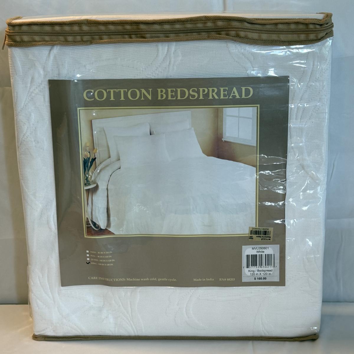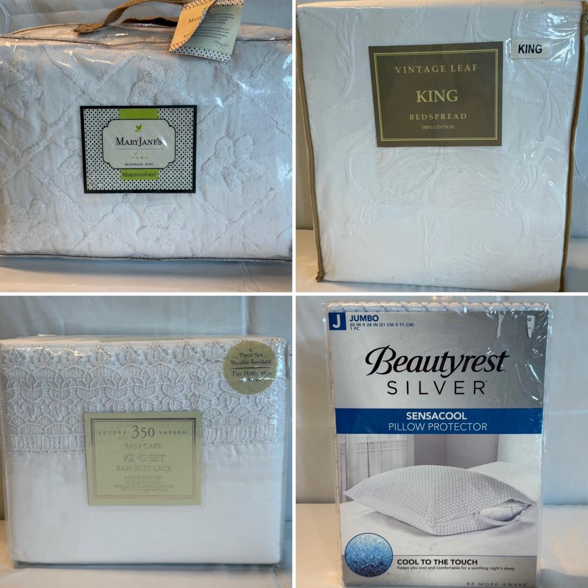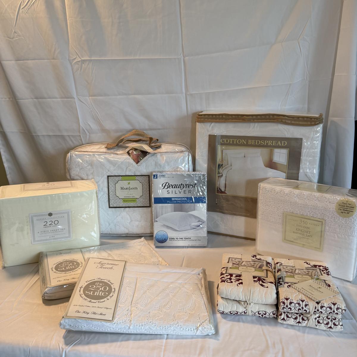 A collection of bedding all new in packaging. Three items by Mary Jane’s Farm include a white king bedspread and two standard shams. Also included is a white Vintage Leaf cotton bedspread, one white four-piece Barnsley Lace set, one off-white four-piece Basics Collection set, two white Supreme Touch flat sheets, and a Beautyrest Silver Sensacool pillow protector.