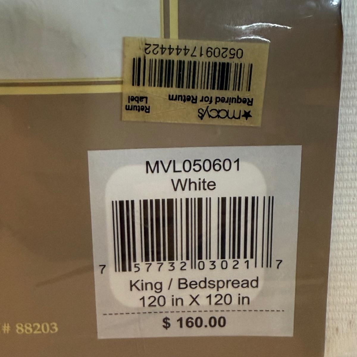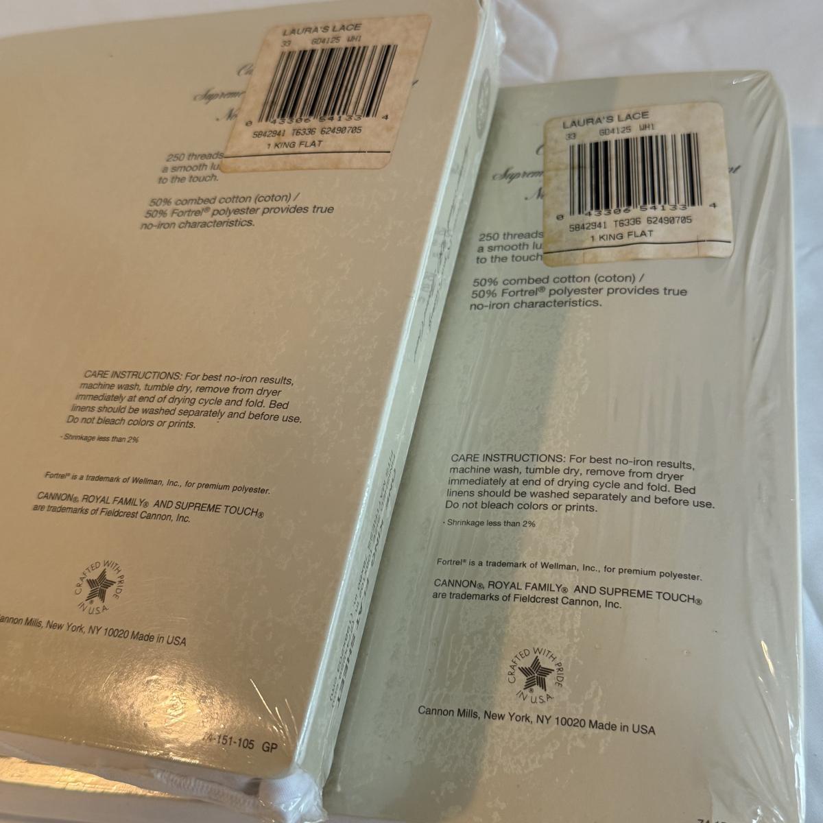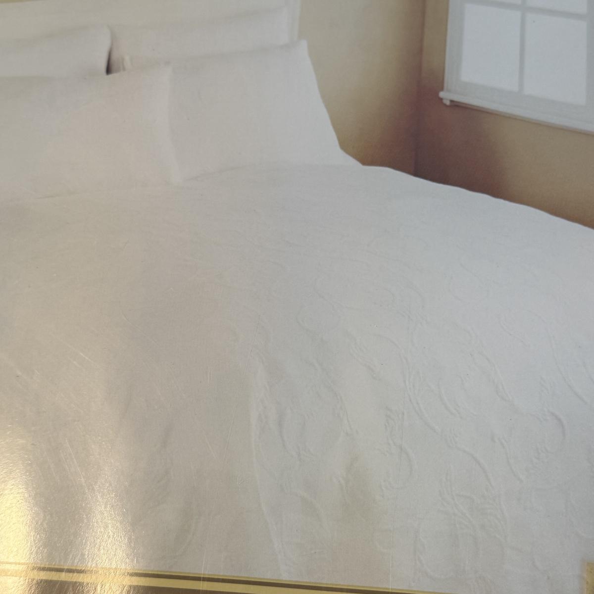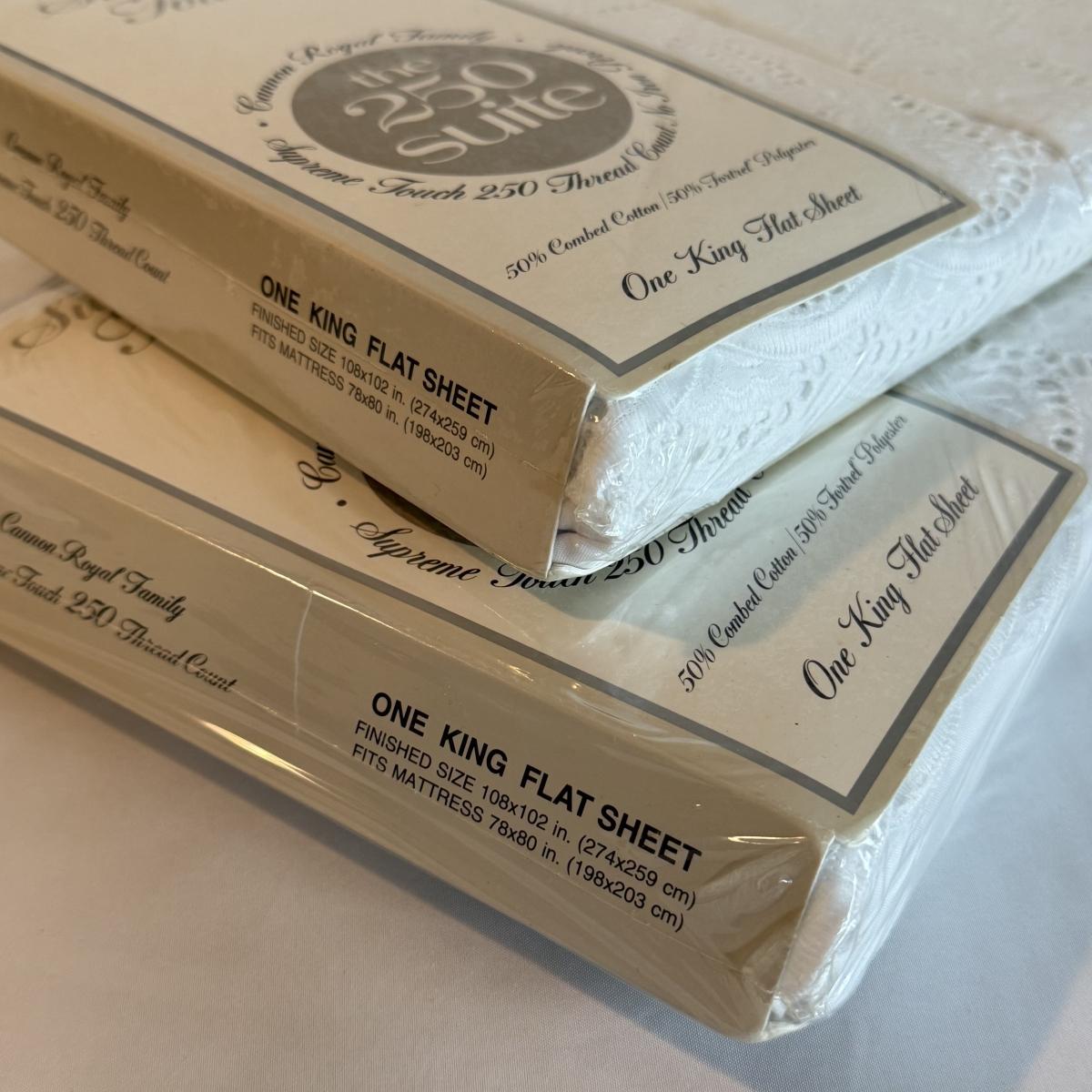 A collection of bedding all new in packaging. Three items by Mary Jane’s Farm include a white king bedspread and two standard shams. Also included is a white Vintage Leaf cotton bedspread, one white four-piece Barnsley Lace set, one off-white four-piece Basics Collection set, two white Supreme Touch flat sheets, and a Beautyrest Silver Sensacool pillow protector.