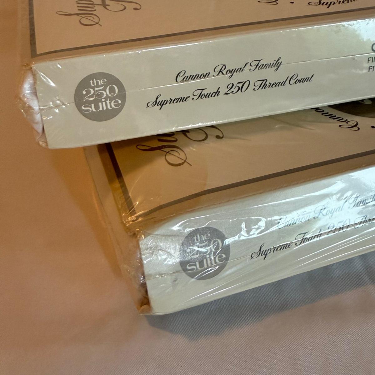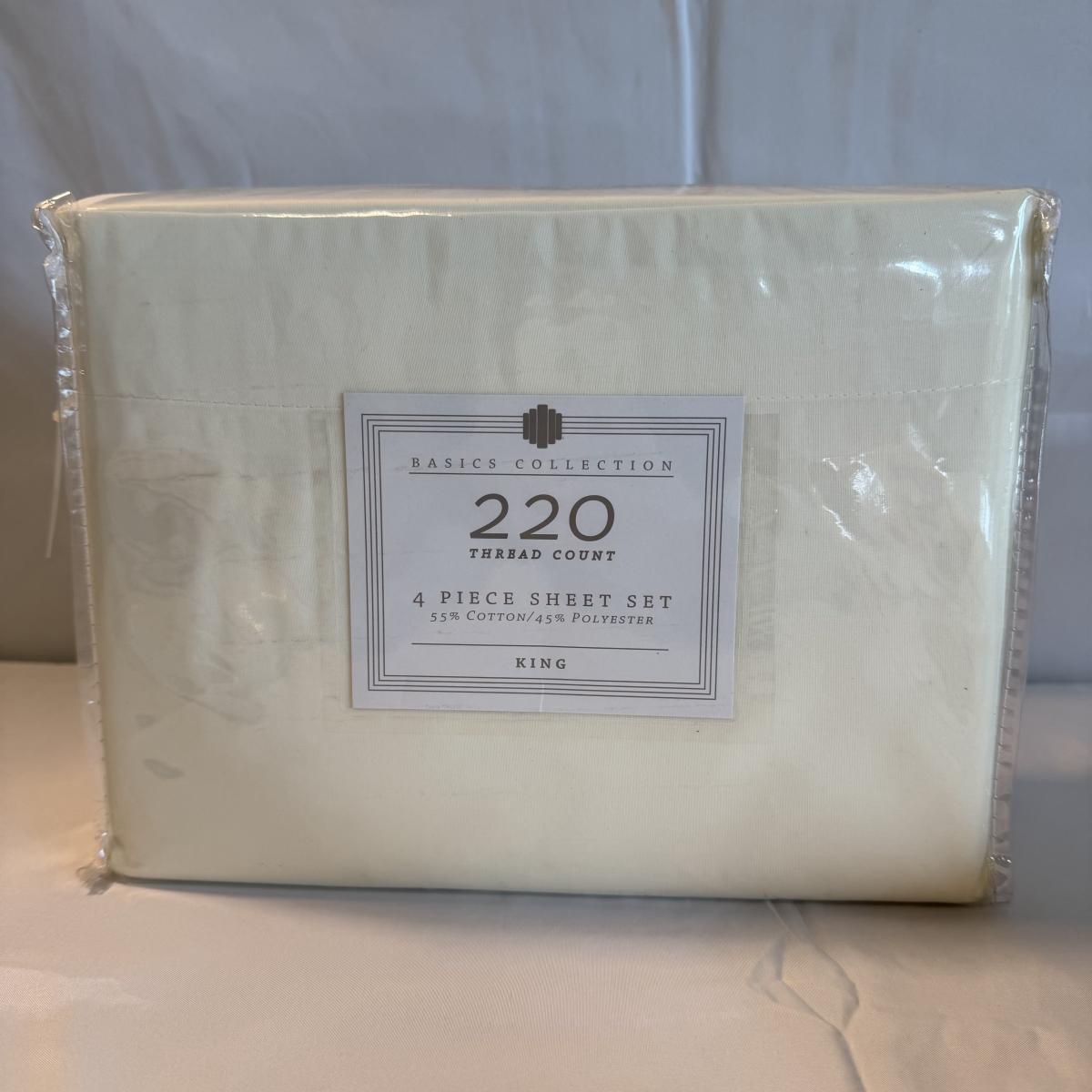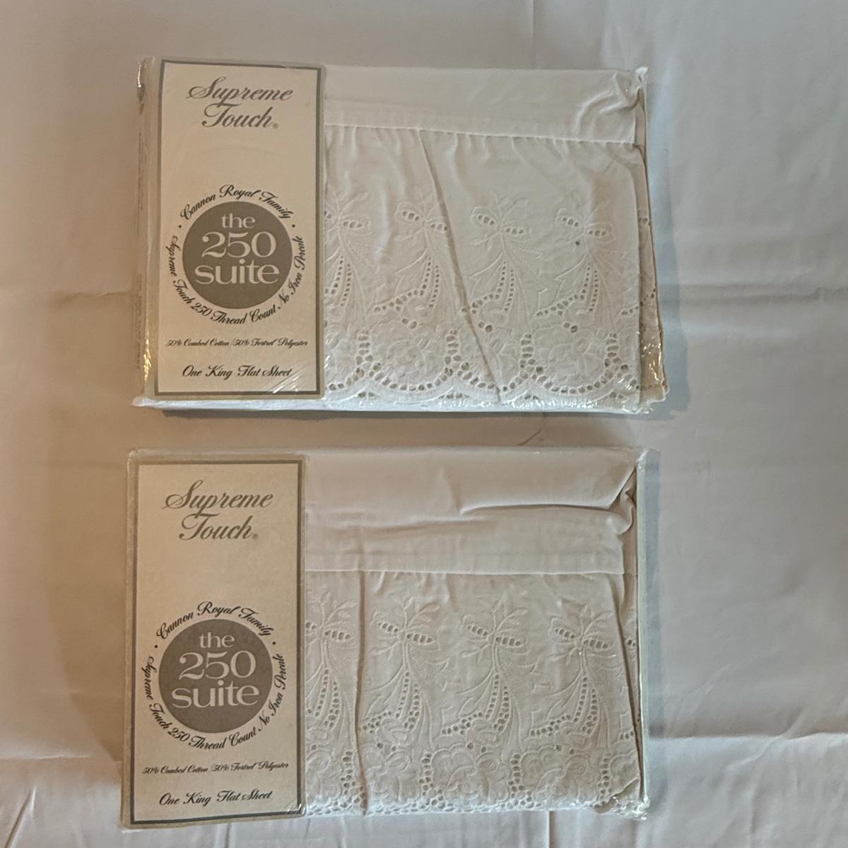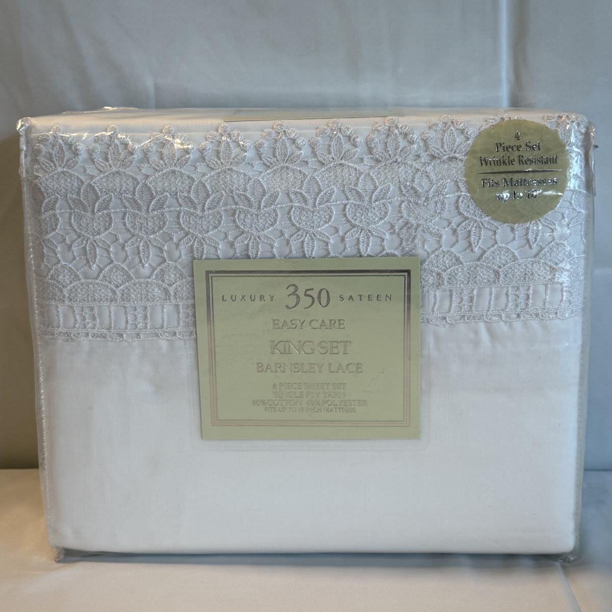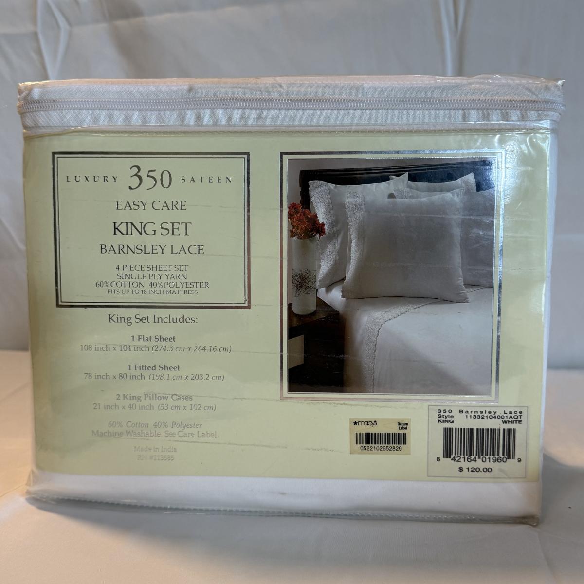 A collection of bedding all new in packaging. Three items by Mary Jane’s Farm include a white king bedspread and two standard shams. Also included is a white Vintage Leaf cotton bedspread, one white four-piece Barnsley Lace set, one off-white four-piece Basics Collection set, two white Supreme Touch flat sheets, and a Beautyrest Silver Sensacool pillow protector.