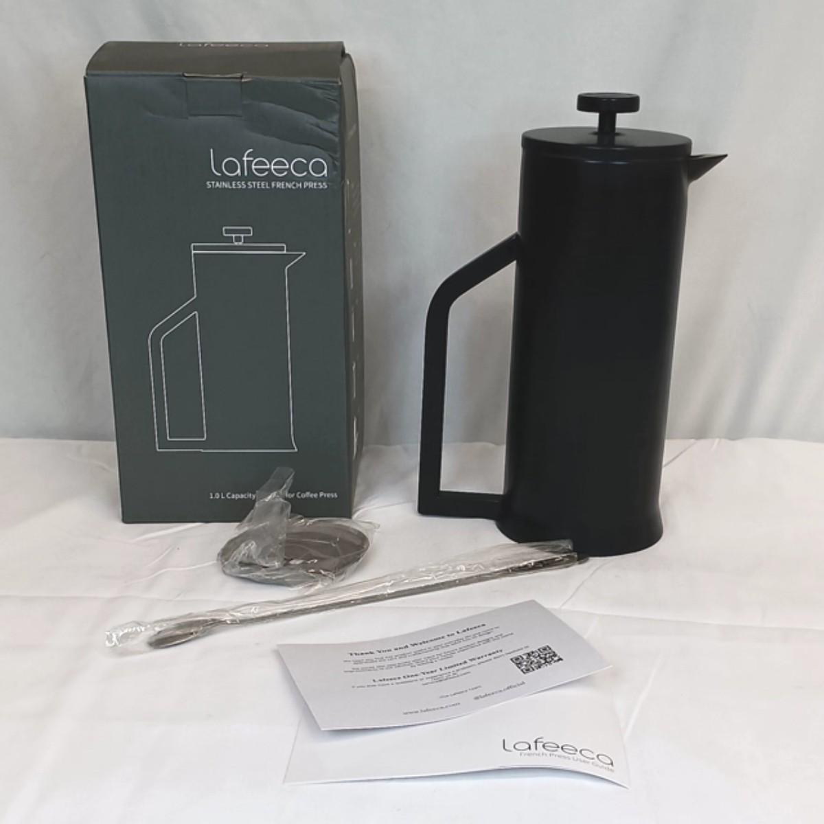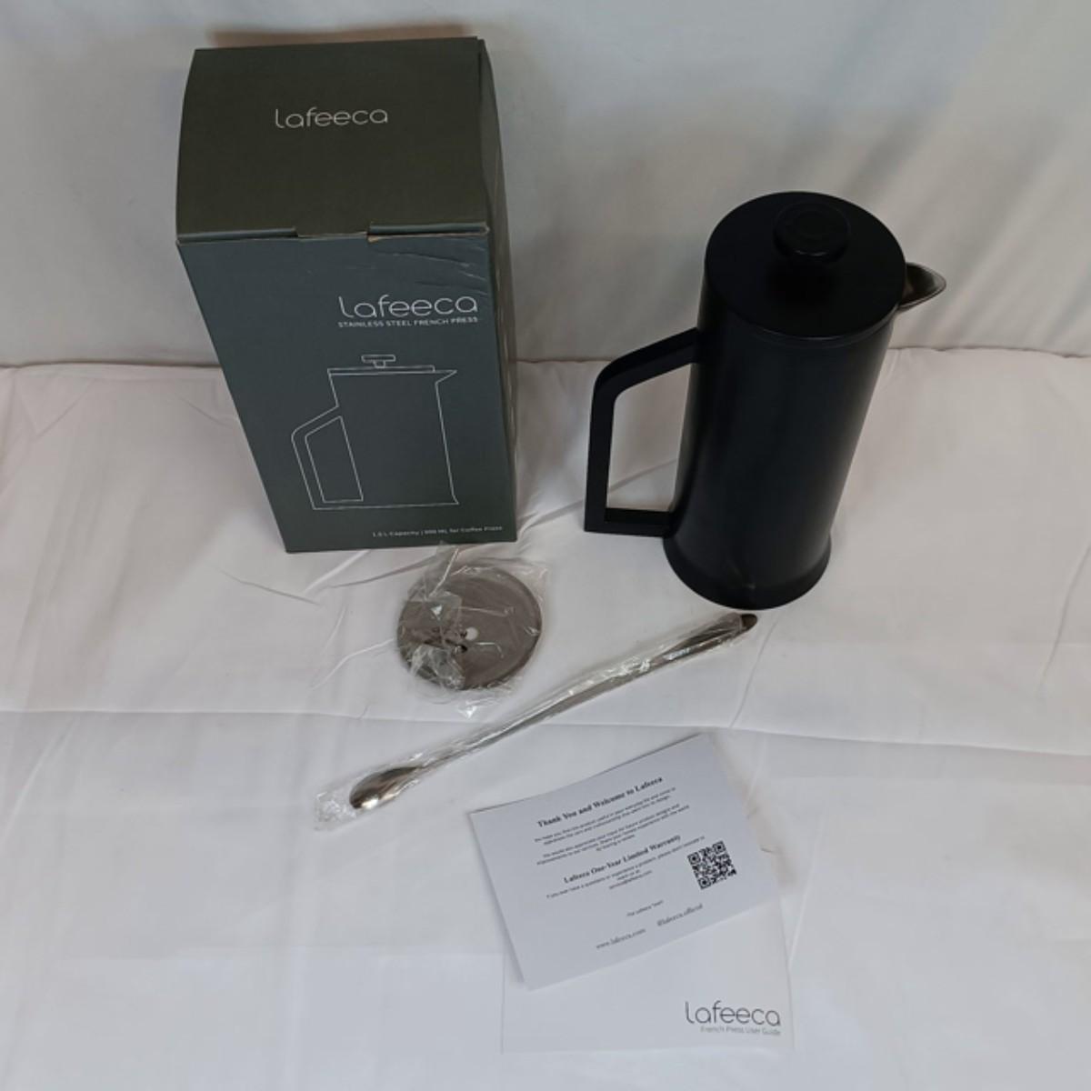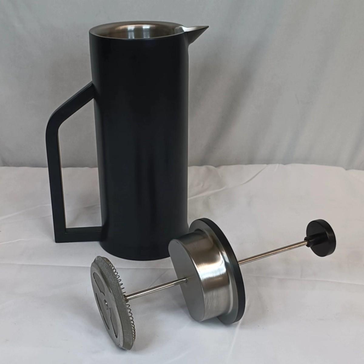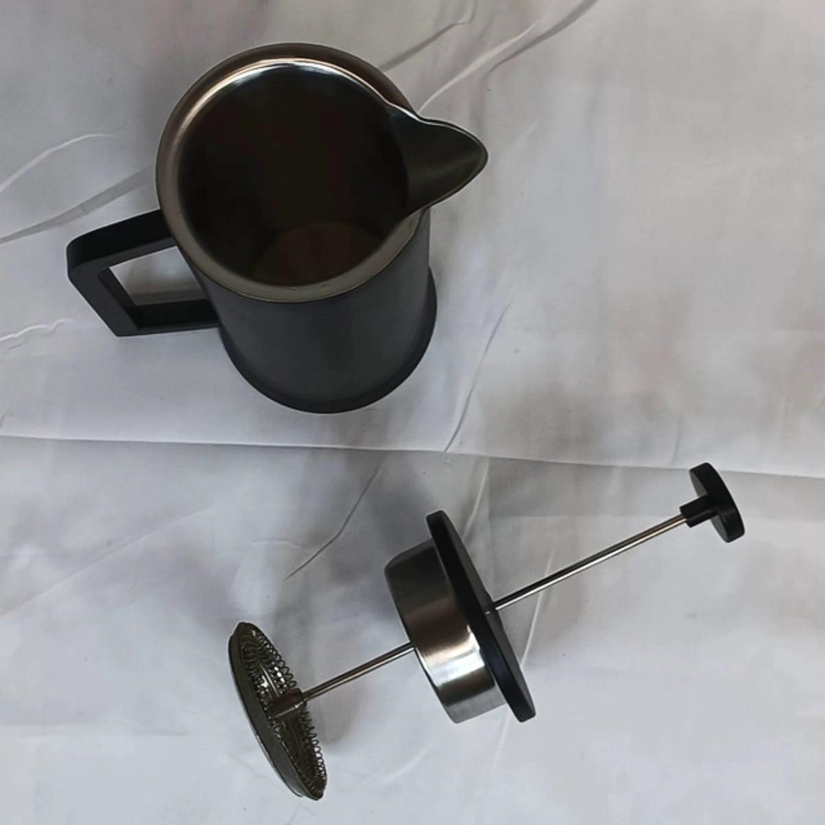 This is a brand new, open box, black stainless steel French press with accessories as pictured.