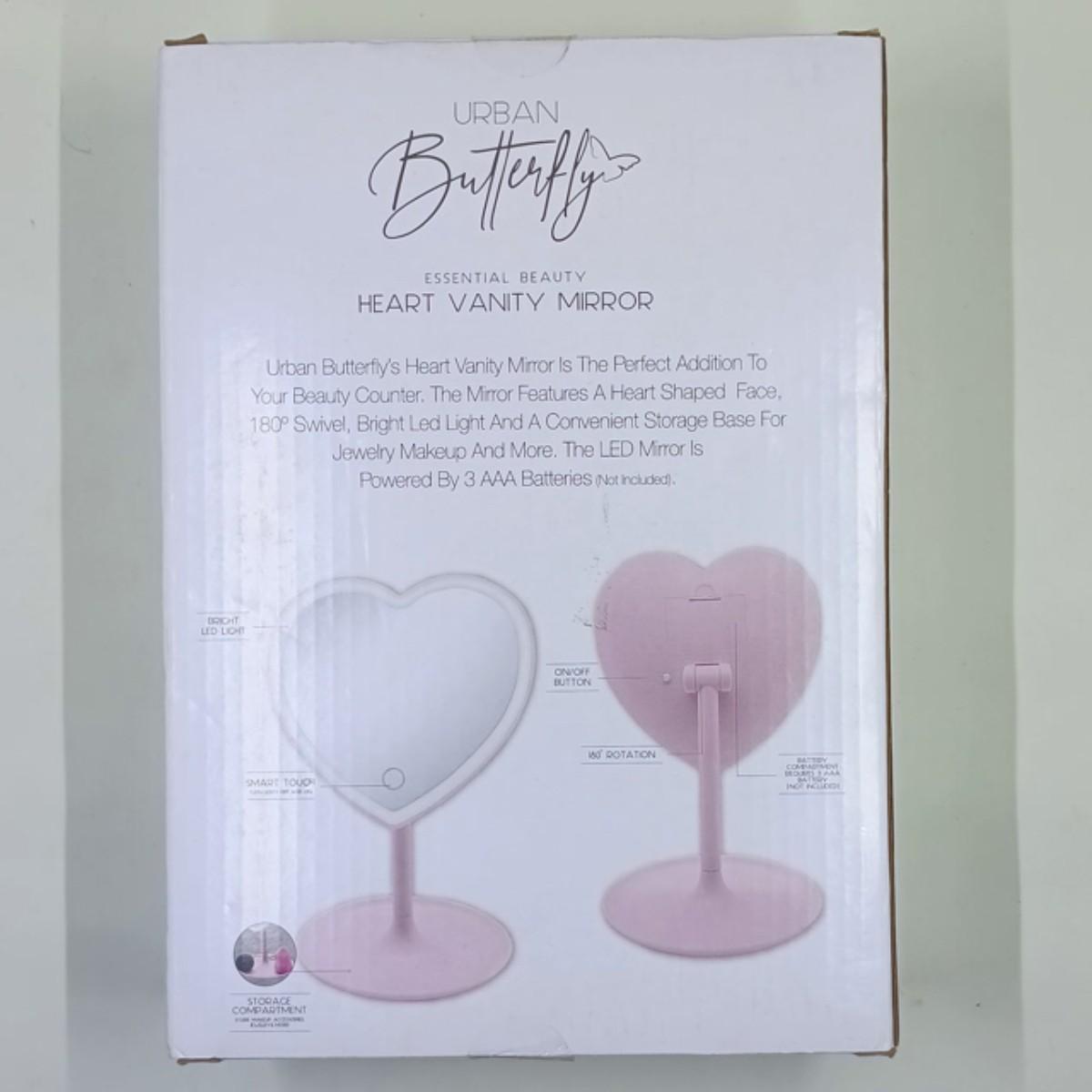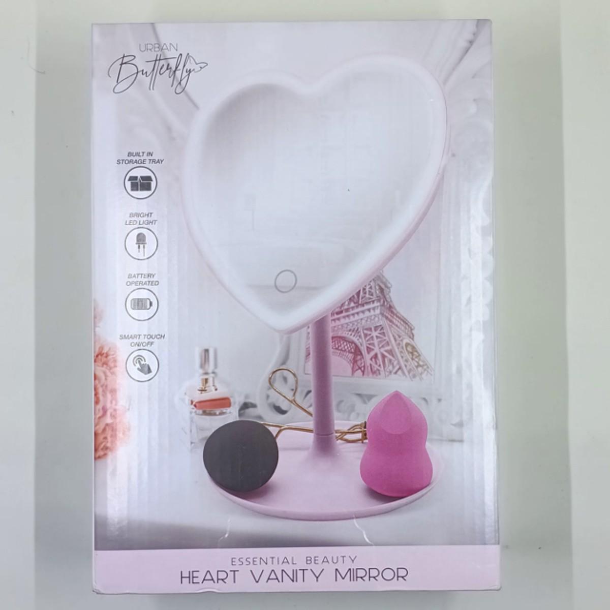 This LED heart shaped vanity mirror is powered by 3AAA batteries and features a built-in storage tray.