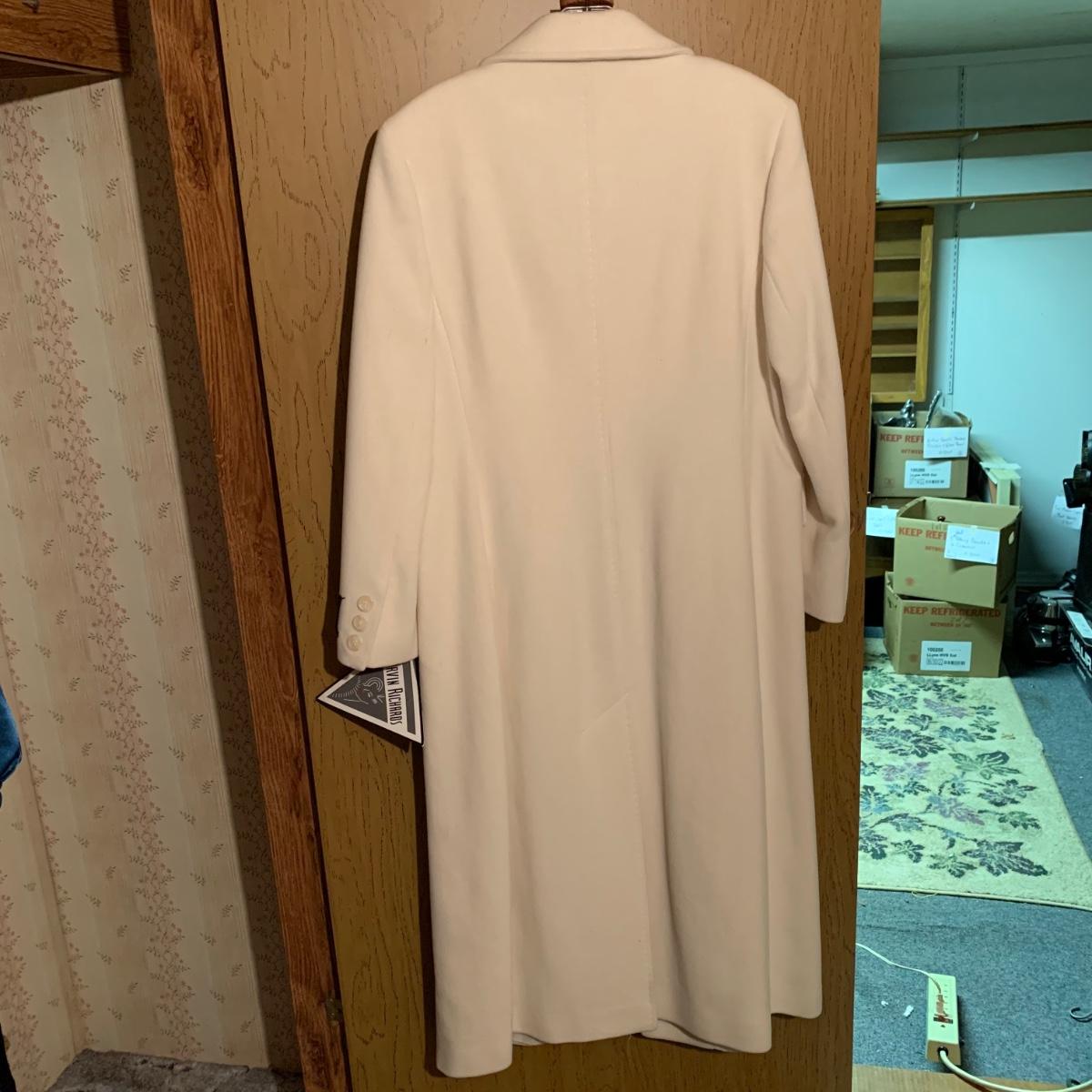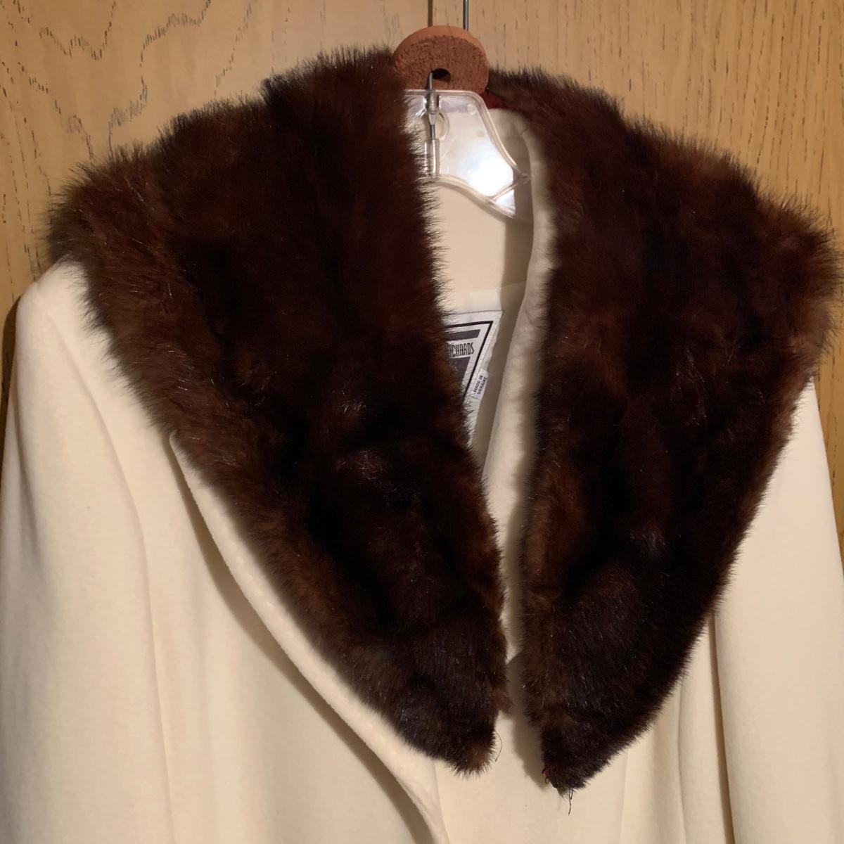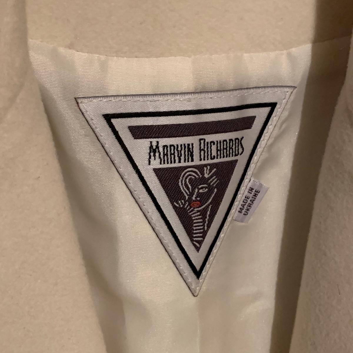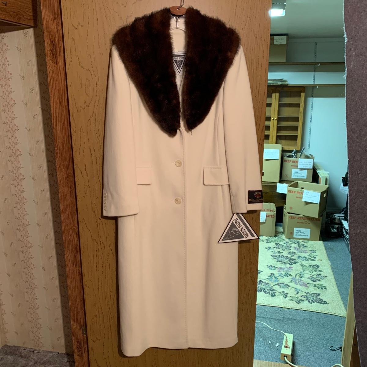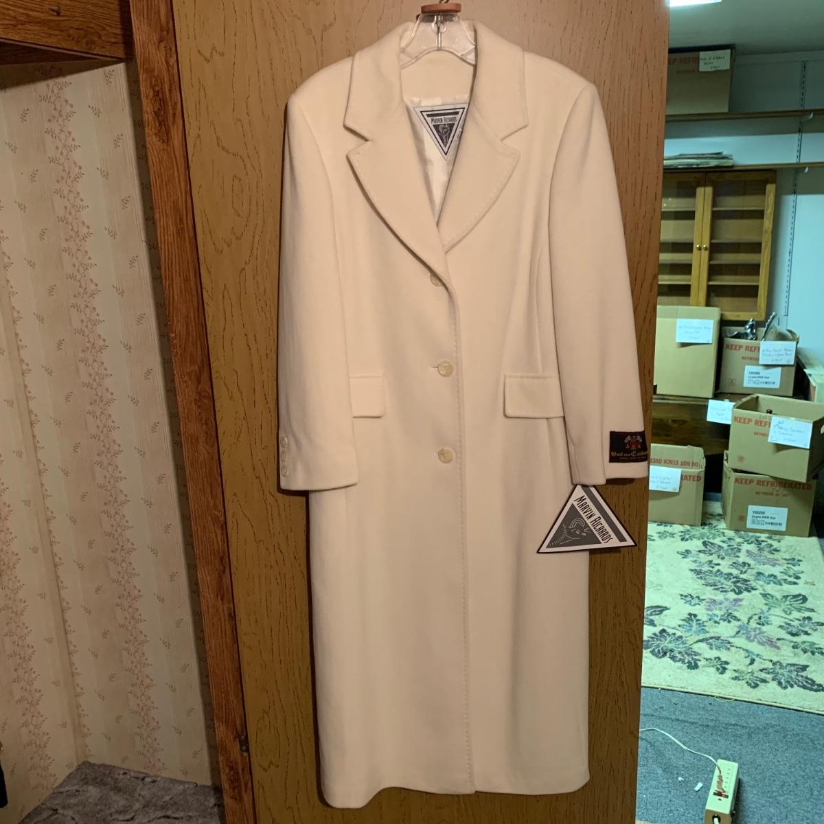 Brand new Ukrainian made Marvin Richards coat, ankle-length, size 4P. A beautiful white coat made of wool and cashmere, with its tag still attached. Coat has been stored wrapped in plastic with cedar blocks to keep the moths away. It is in pristinely excellent condition. Paired with this coat is a soft fur collar scarf. We cannot confirm it is real fur, but it does appear to be. Shipping available.