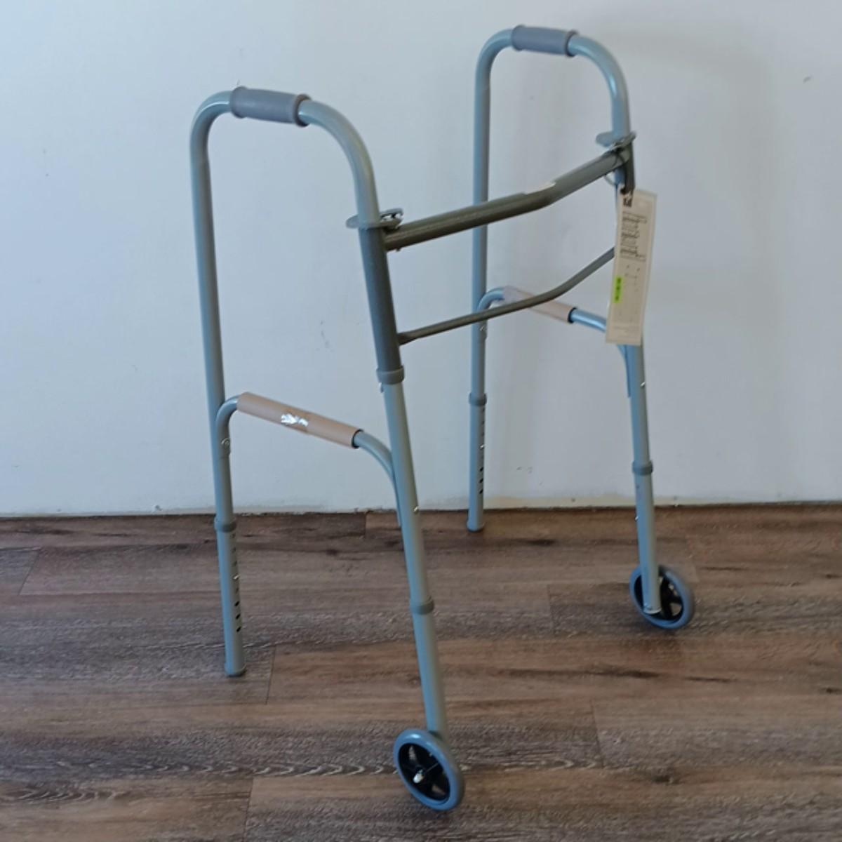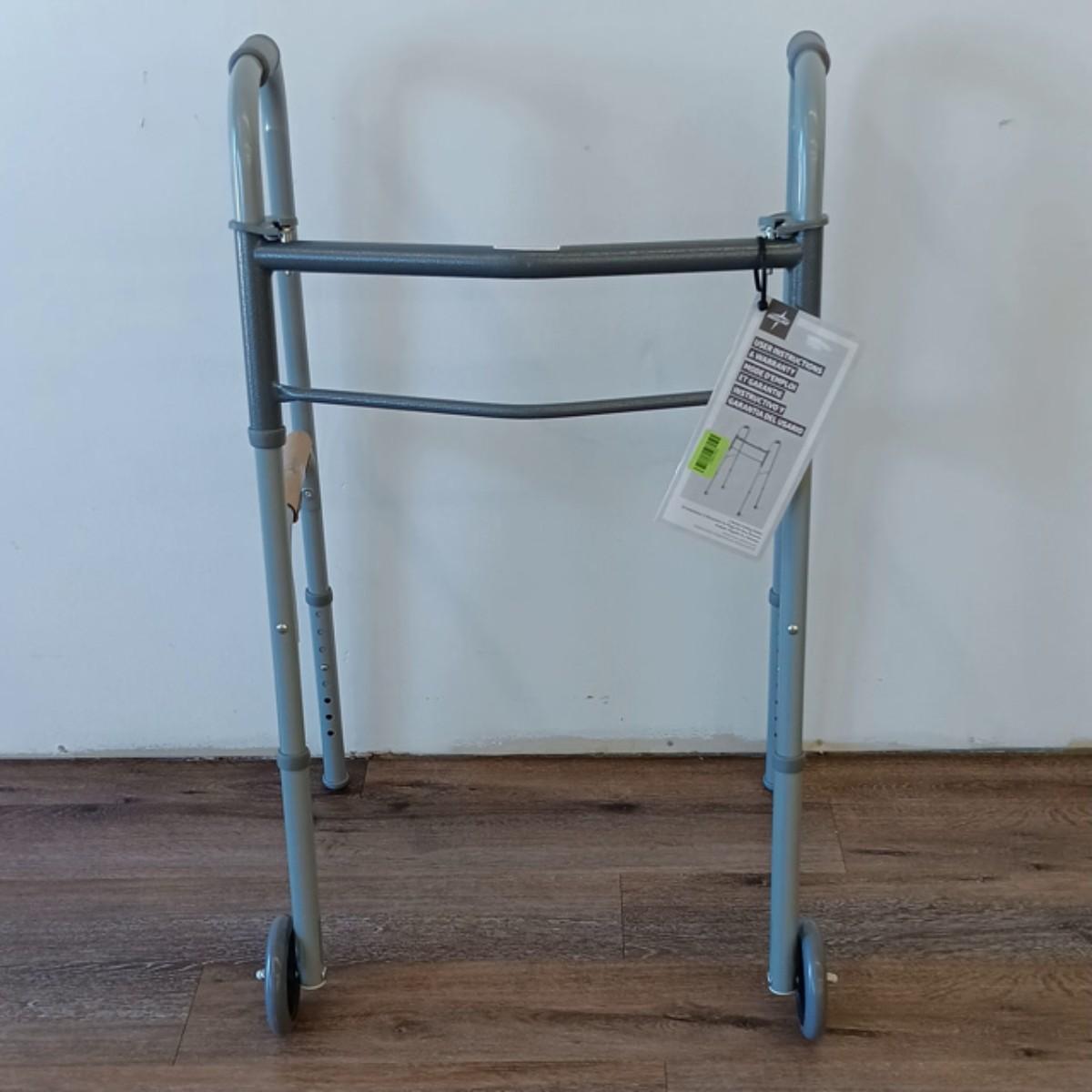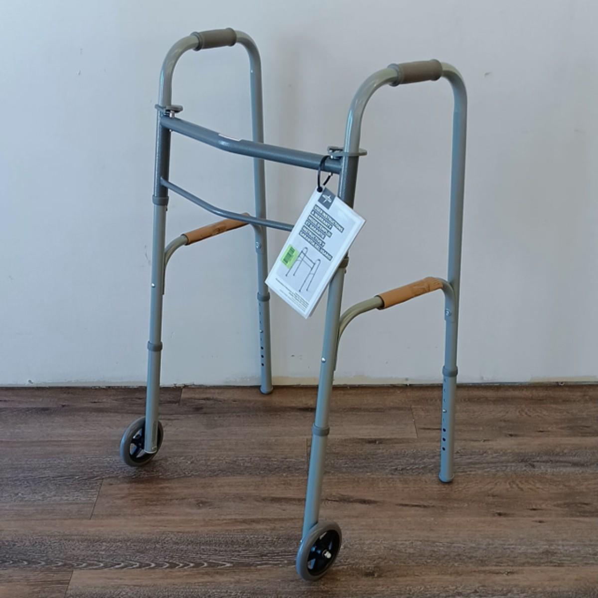 This is a brand nee Medline deluxe, two button folding walker with front assist wheels.