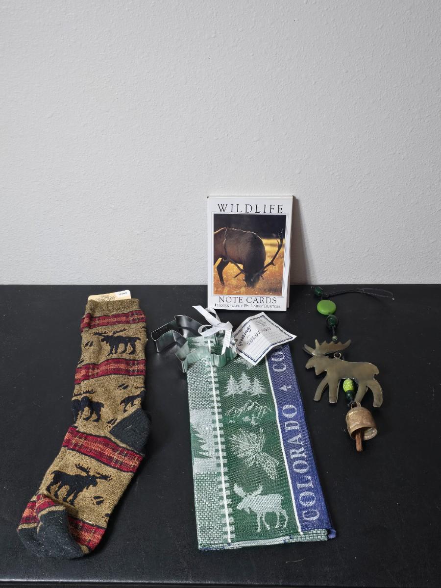 Brand new Moose themed items - Socks - Kitchen Towel- Wind chime - Wildlife greeting cards ? GIFT IDEAS!