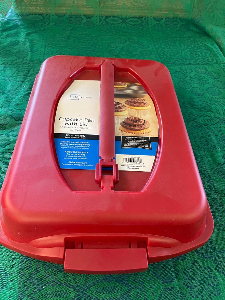 Brand new muffin cupcake pan with lid and carrying handle. Lot k.