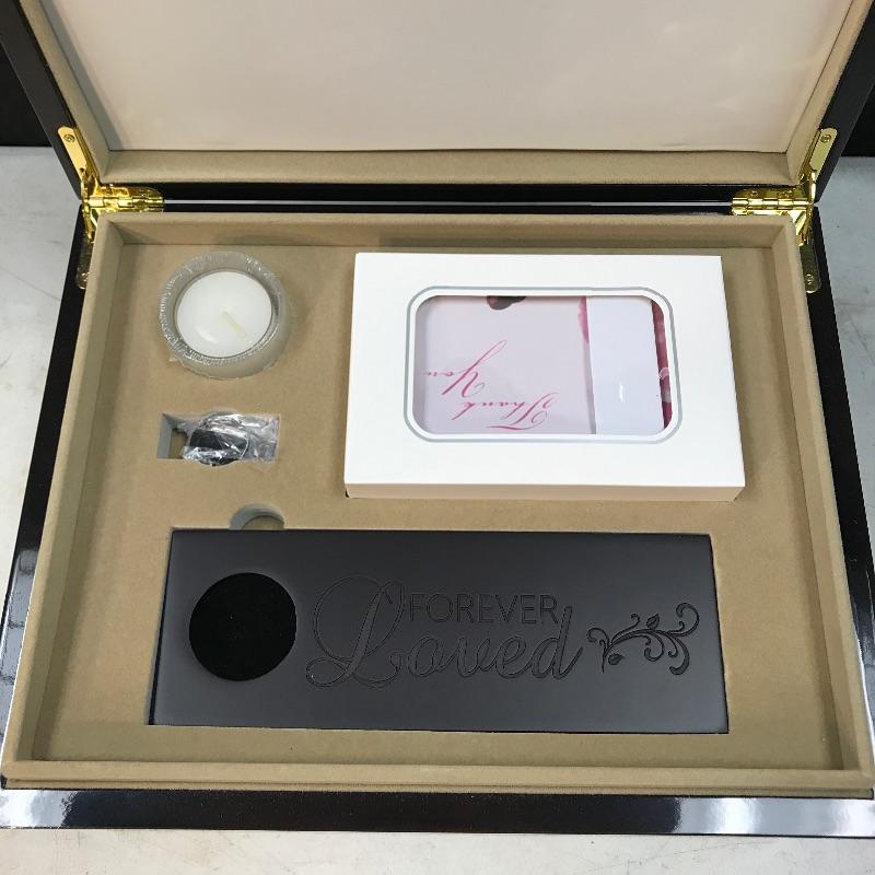 Up for auction is a brand new memory box for holding the ashes of those that have passed-on. This is an entire kit containing not only the memory box but: candle, candle tray, thank you cards, and estate planning brochure booklet, as well as the urn case. The box measures 1“˜ x 9 1/2“ x 6 1/2“. See pictures