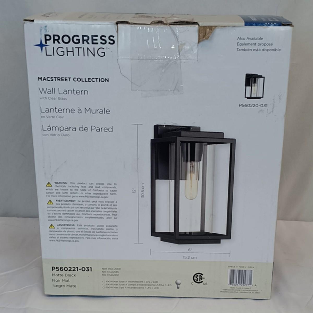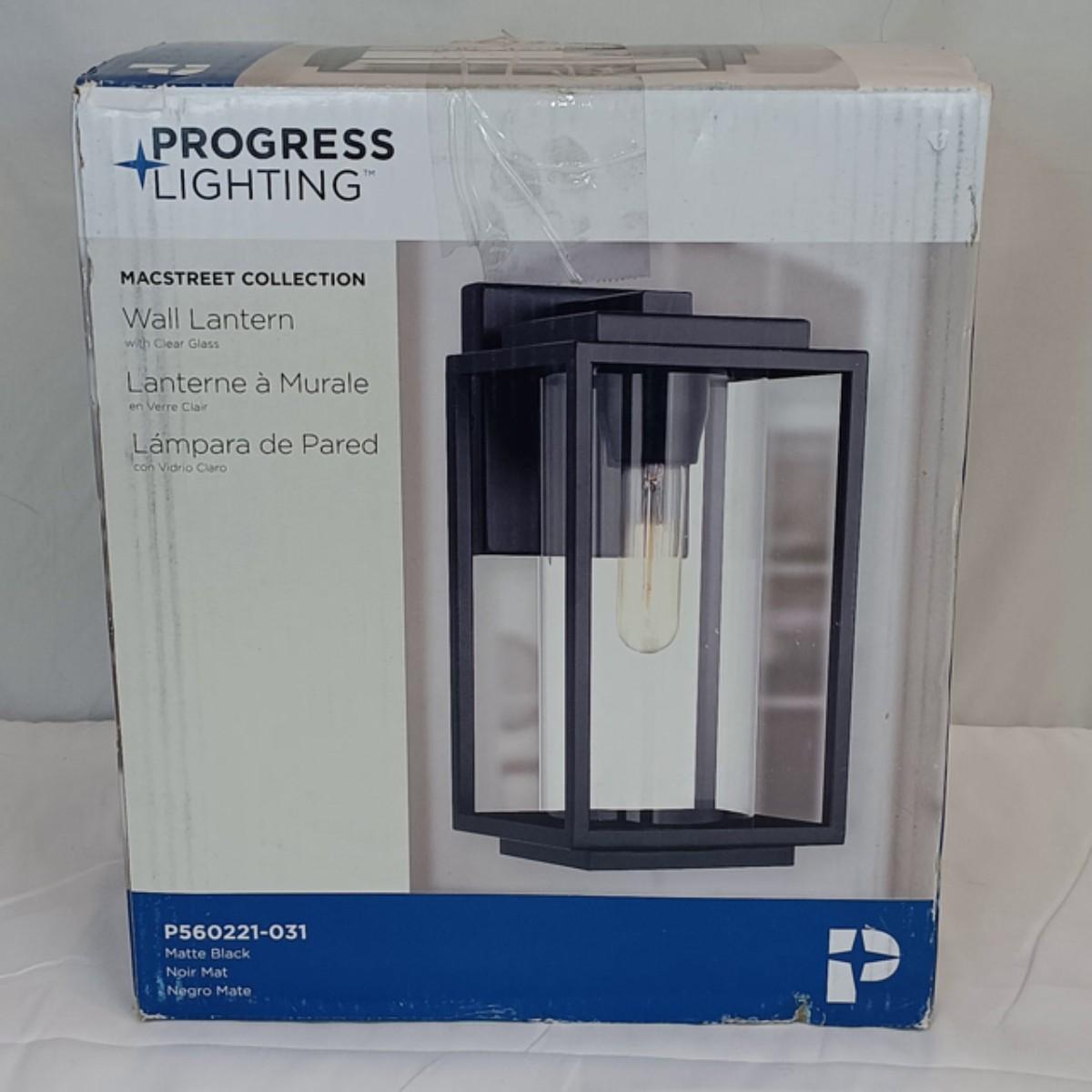 This is a brand new, open box Progress Lighting wall lantern in a matte black finish.