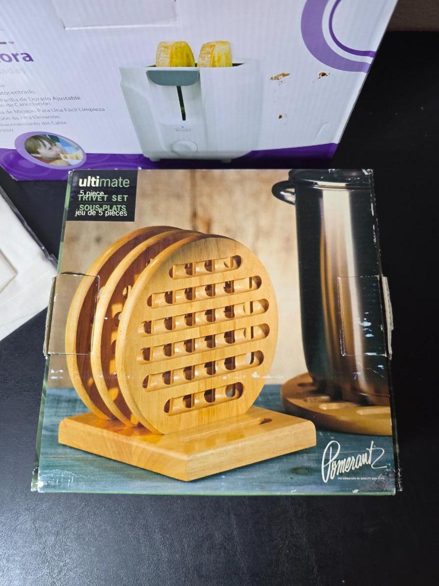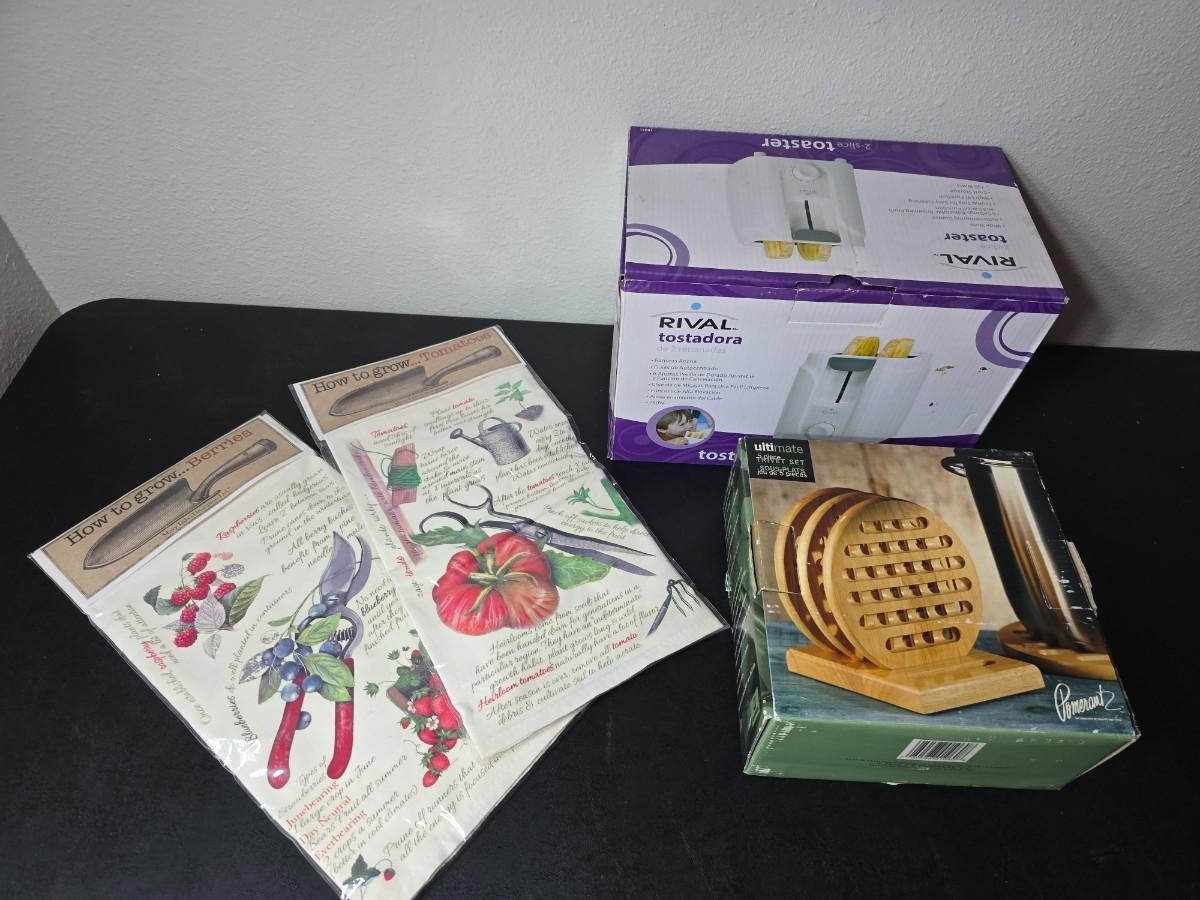 Brand new Rival toaster - New Ultimate 5 piece trivet set - and two new garden themed flour sack towels GREAT GIFT IDEAS!