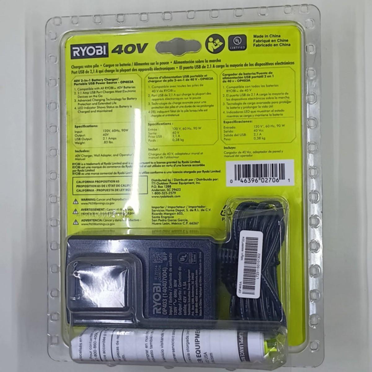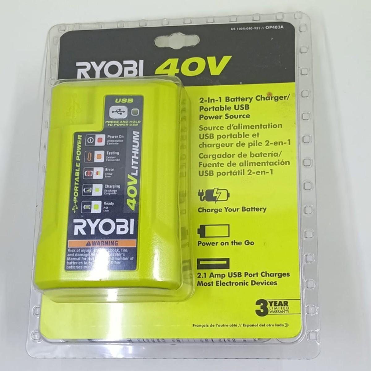 This is a brand new, factory sealed Ryobi 40V 2-in-1 battery charger with portable USB power source.