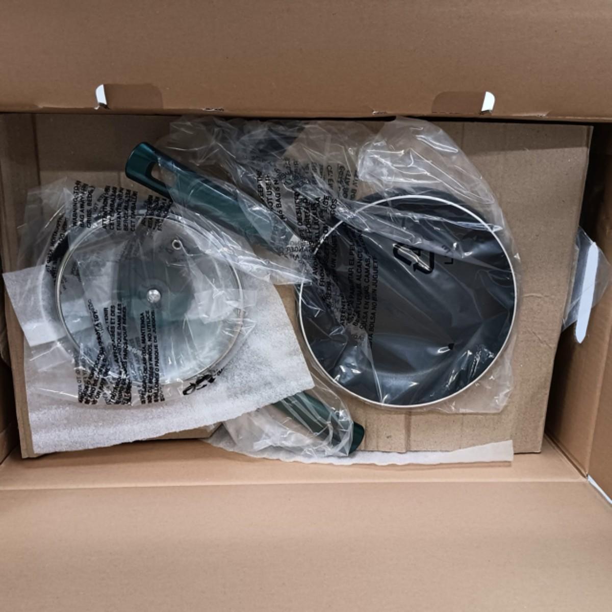 This is a brand new, non-stick cookware set that features an aluminum body with soft-grip handles and is easy to clean. The set includes two frying pans, three pots and three lids.