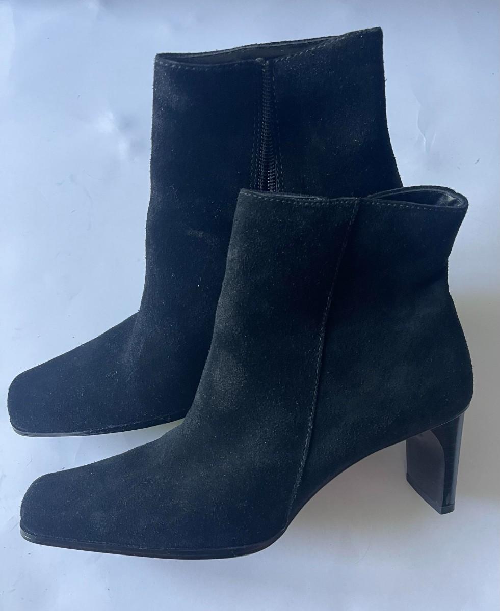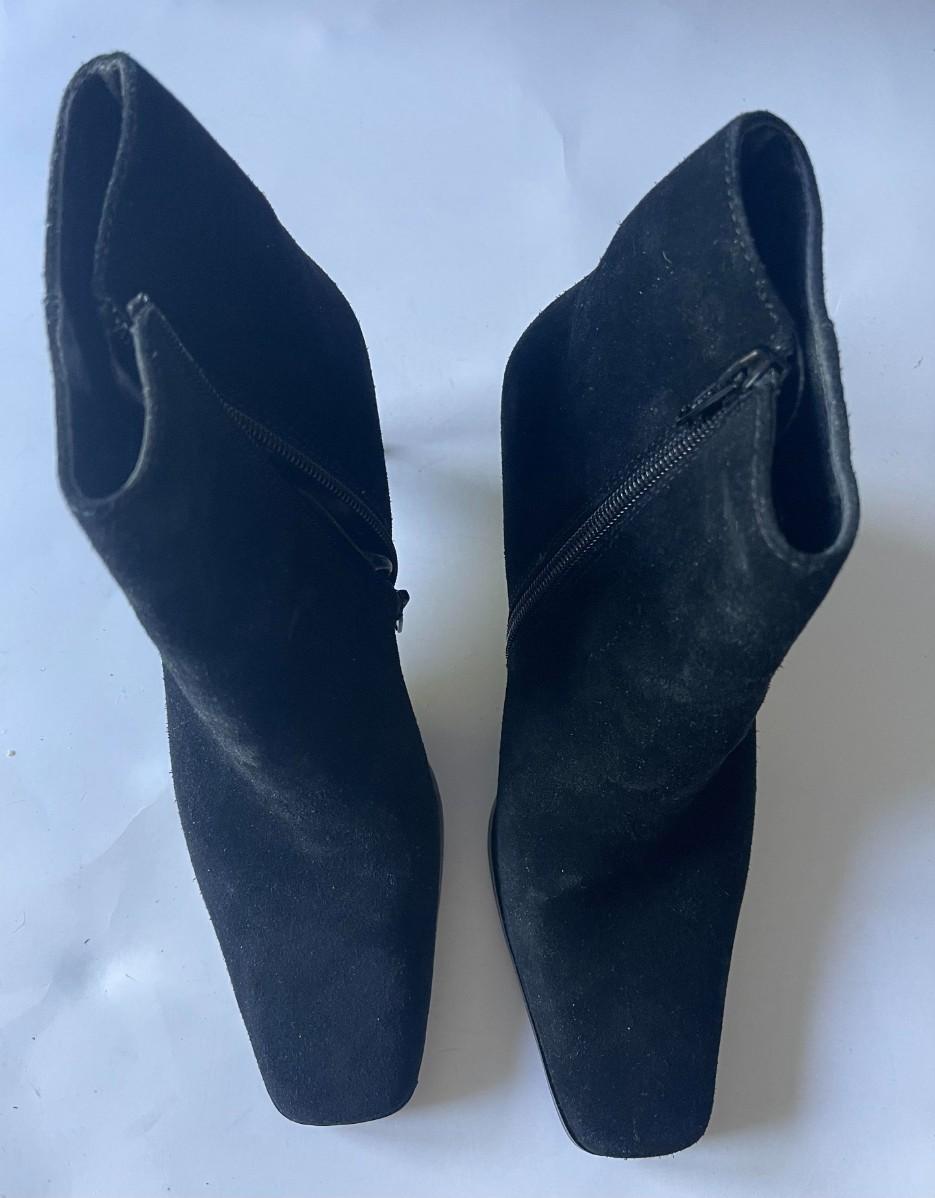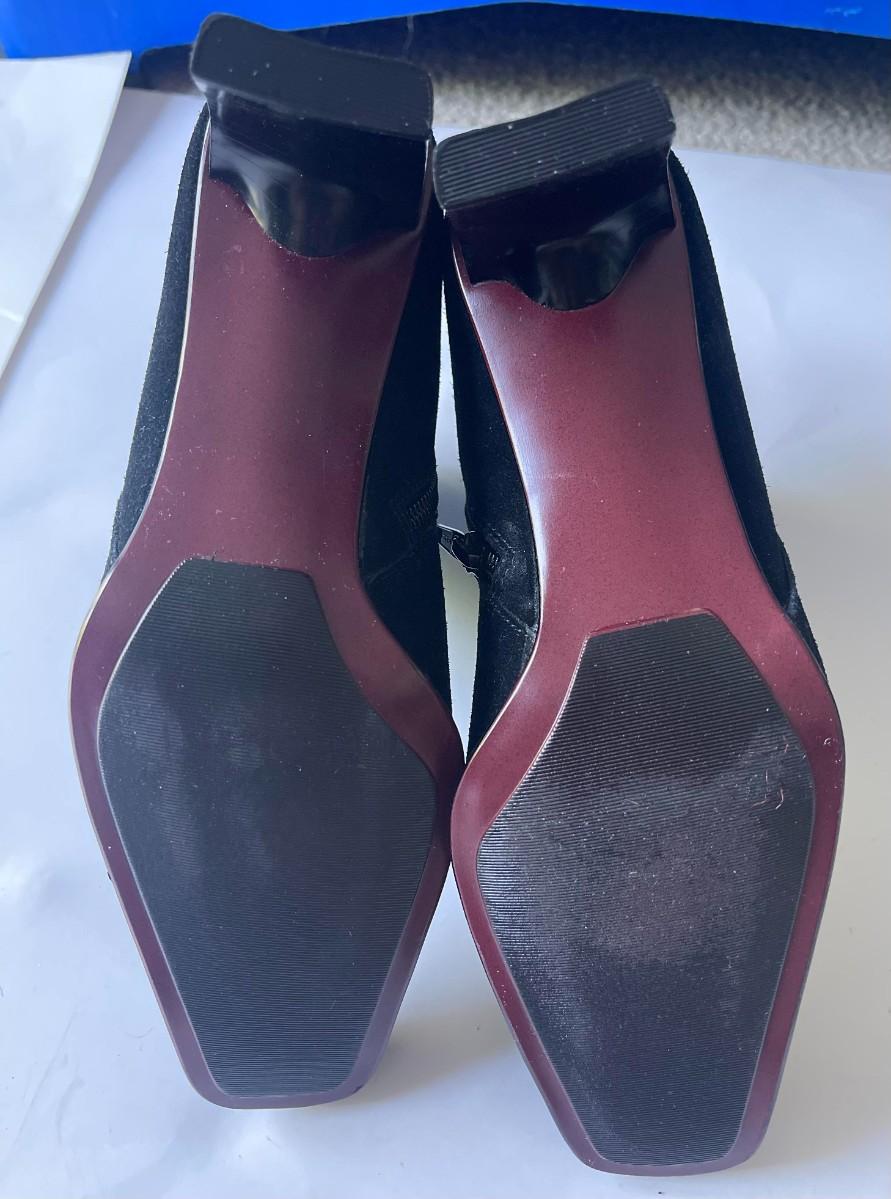 Design: These ankle boots feature a sleek black suede exterior with a classic silhouette that effortlessly complements any outfit. The soft suede material adds a luxurious feel, while the subtle detailing keeps the design elegant and timeless.