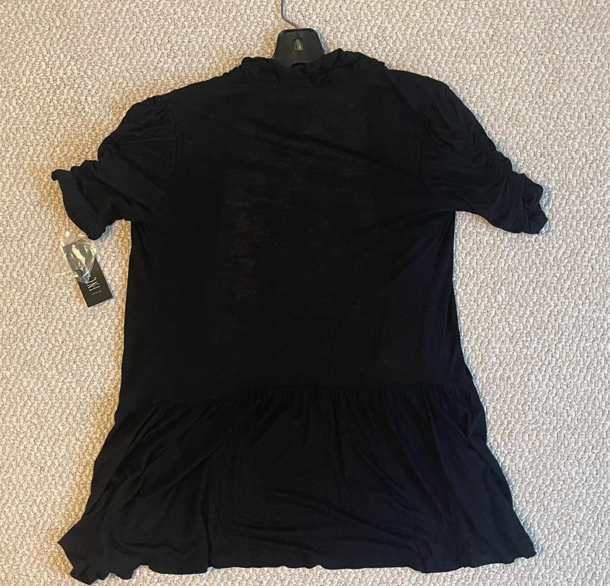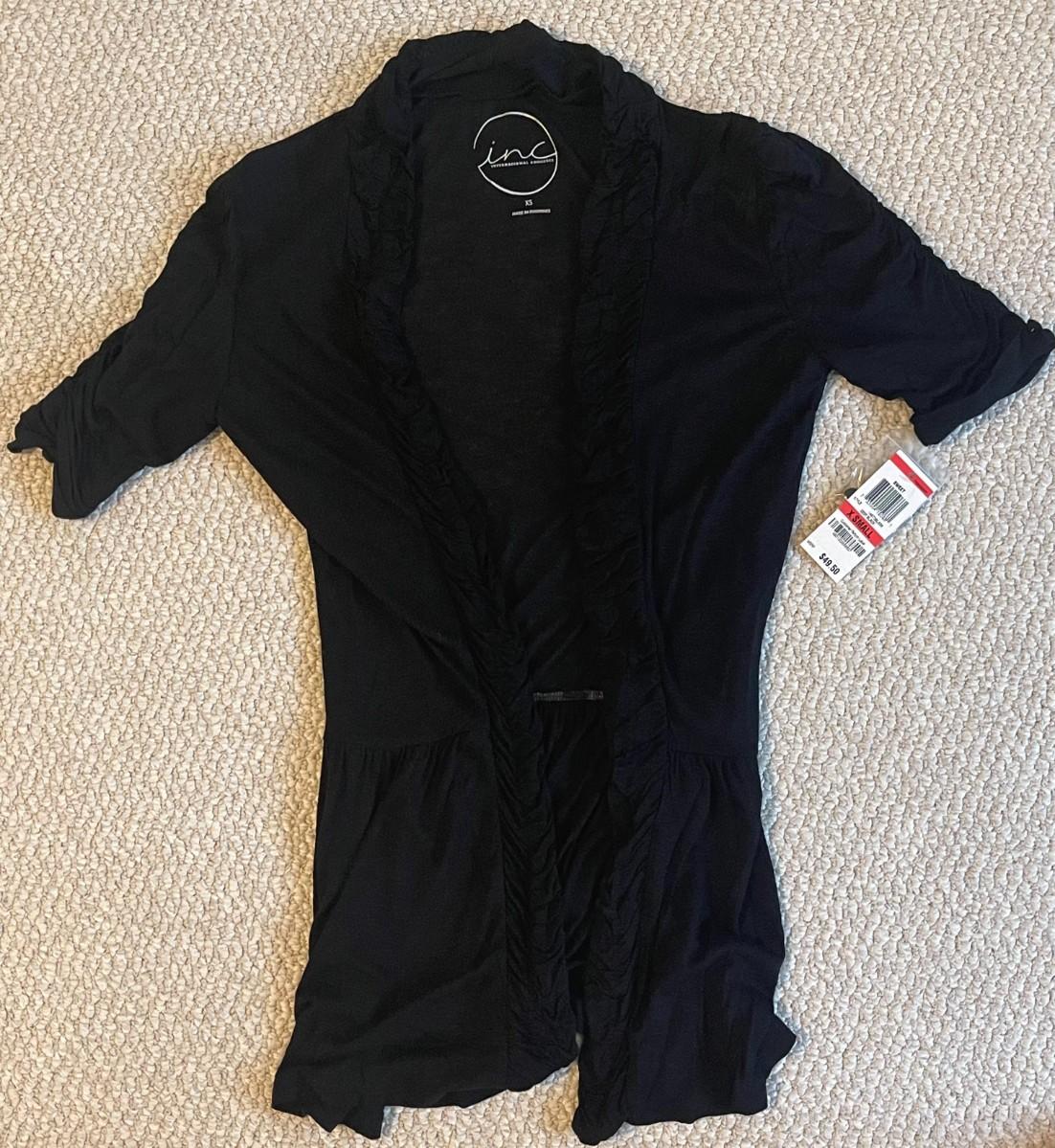 Enhance your wardrobe with this elegant black cardigan from INC. This versatile piece is perfect for layering and adds a touch of sophistication to any outfit. Made from a soft, comfortable fabric, it features a stylish ruffle trim and a relaxed open front design.