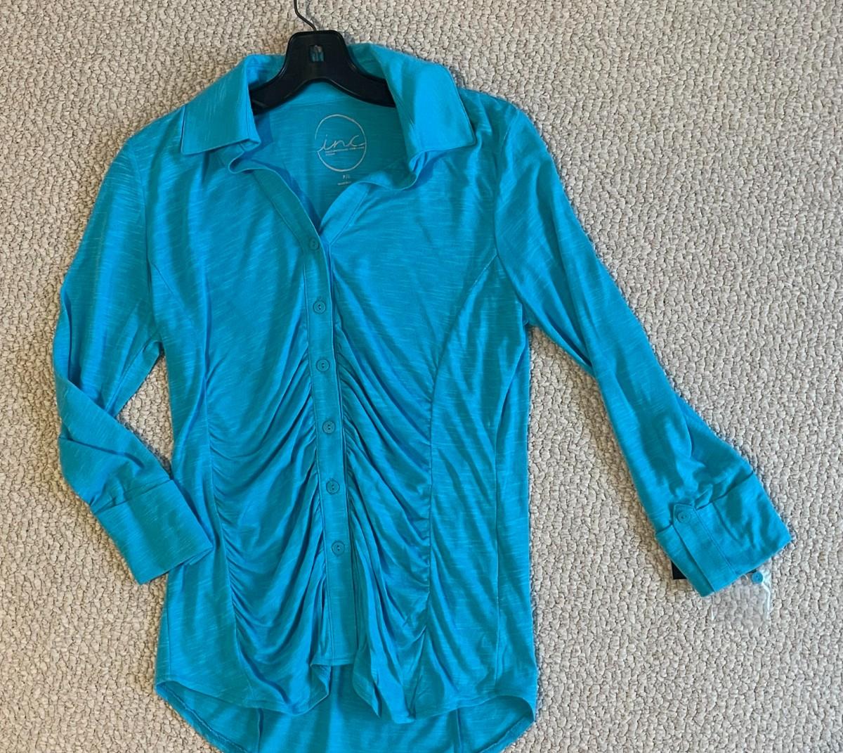 Brand New w/Tags INC Turquoise Ruched Button-Up Blouse, Size PS