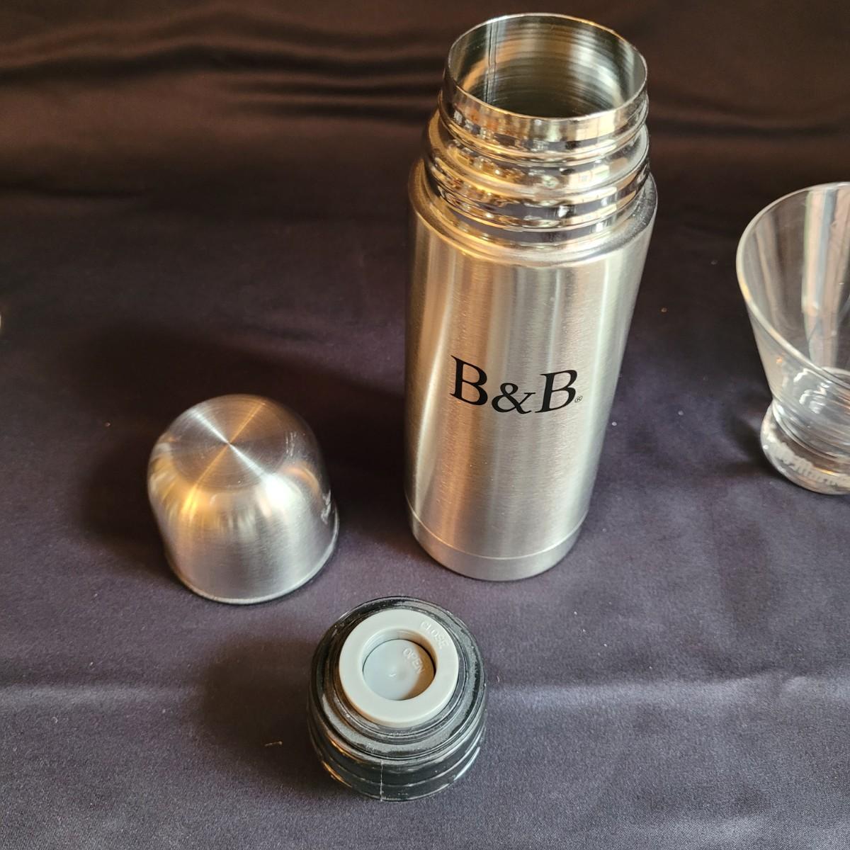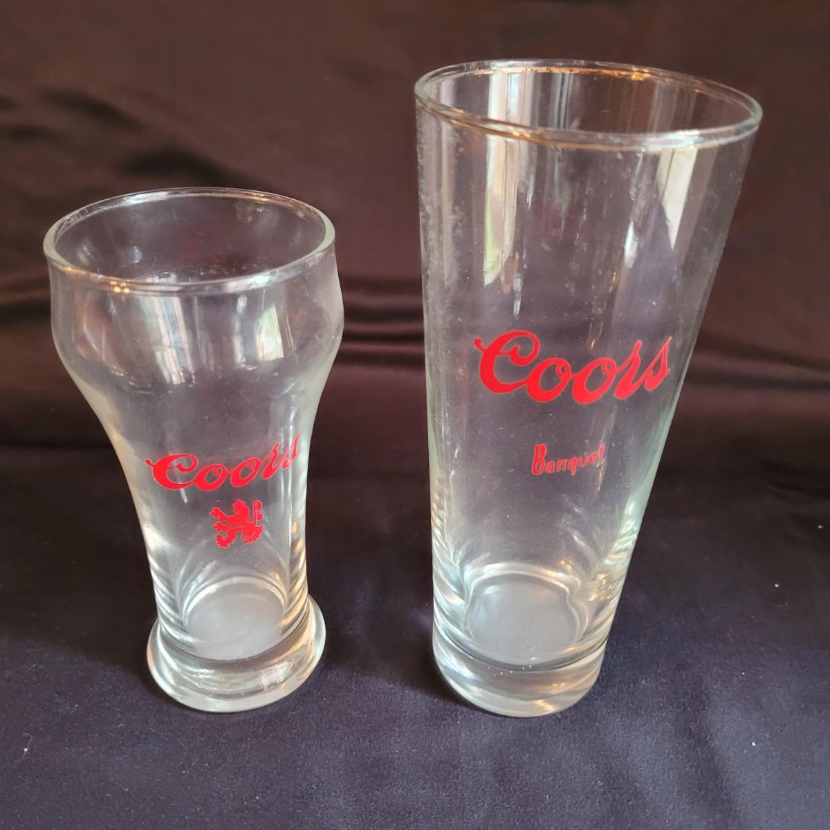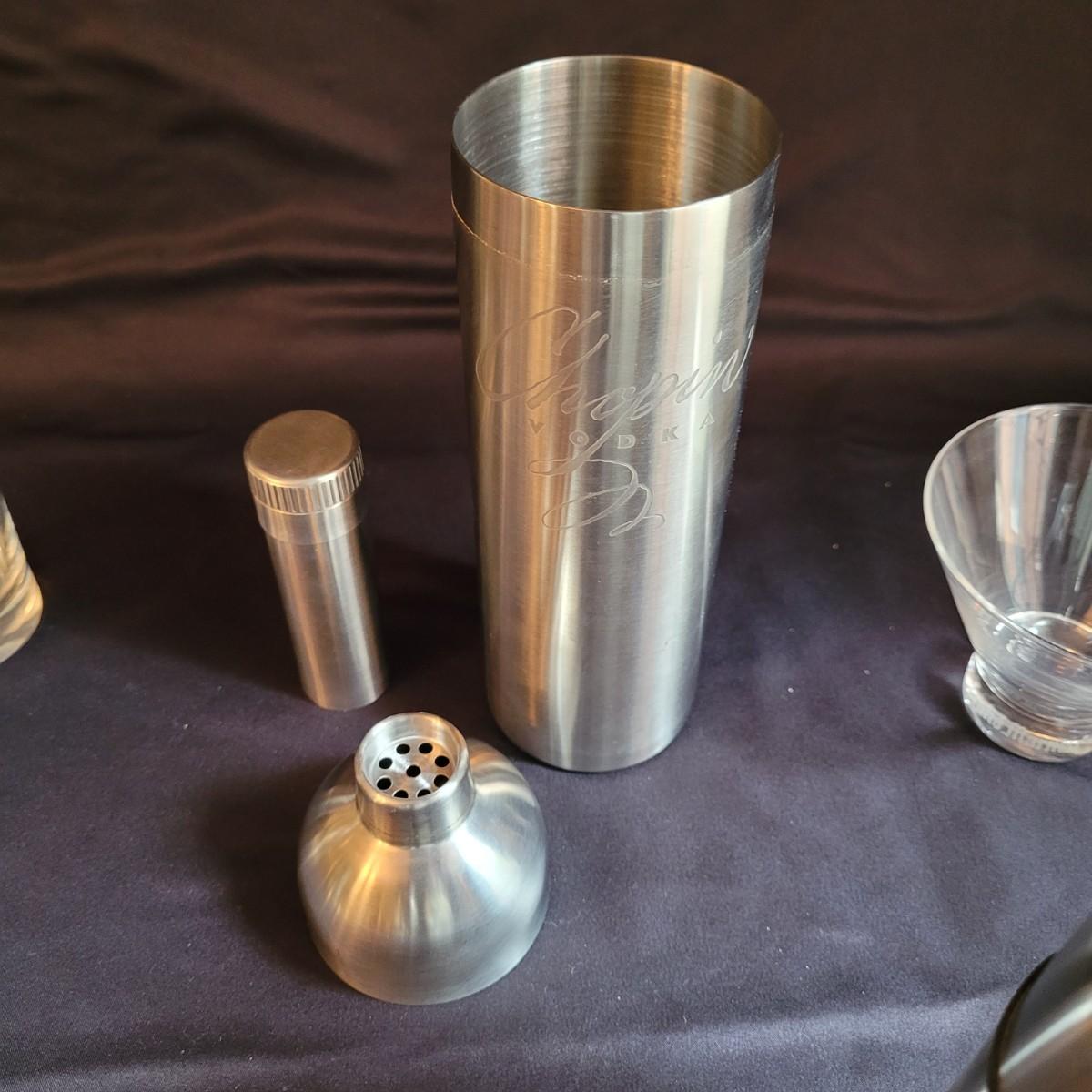 This assortment of barware includes a Chopin Vodka stainless steel bottle shaped cocktail mixer, B&B stainless steel thermos, Coors pint glasses, Gran Duque D’Alba brandy snifters, and more. Shipping available.