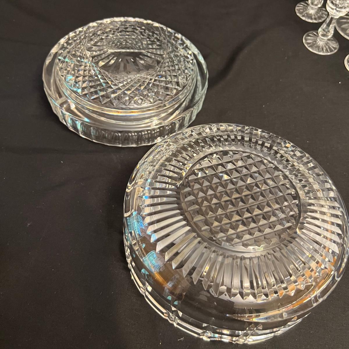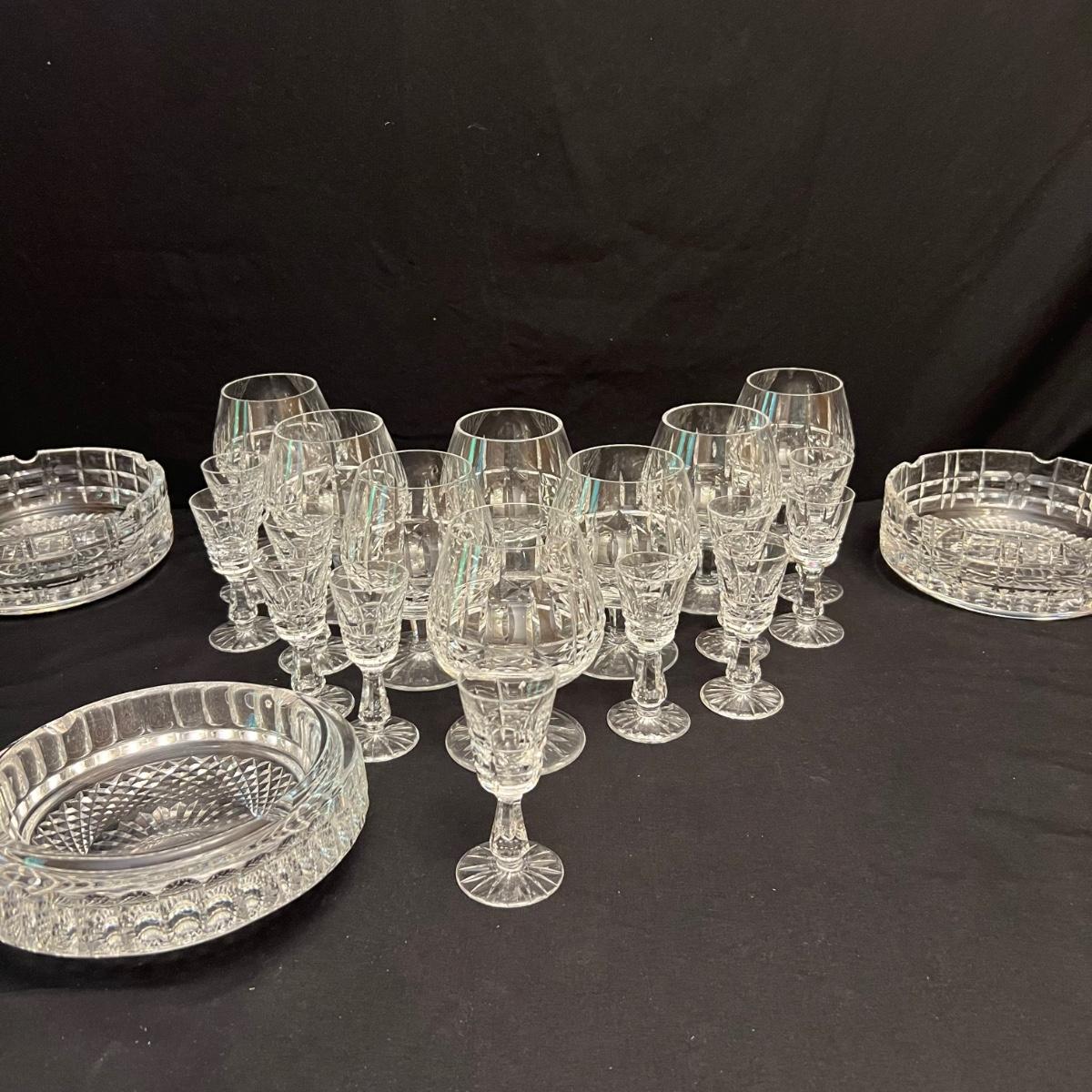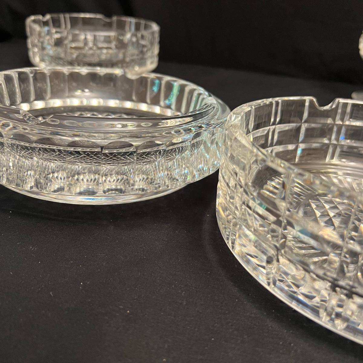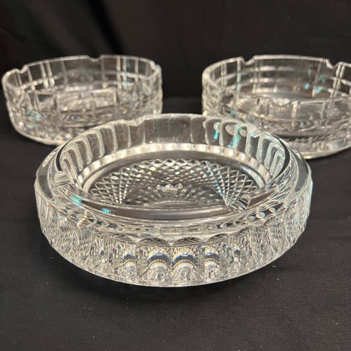 This Waterford lot includes eight brandy snifter glasses plus eleven port glasses; these all appear to be in their Kylemore pattern.. Also included are three ashtrays. Two ashtrays are matching and they measure 7”D x 2.5”H.