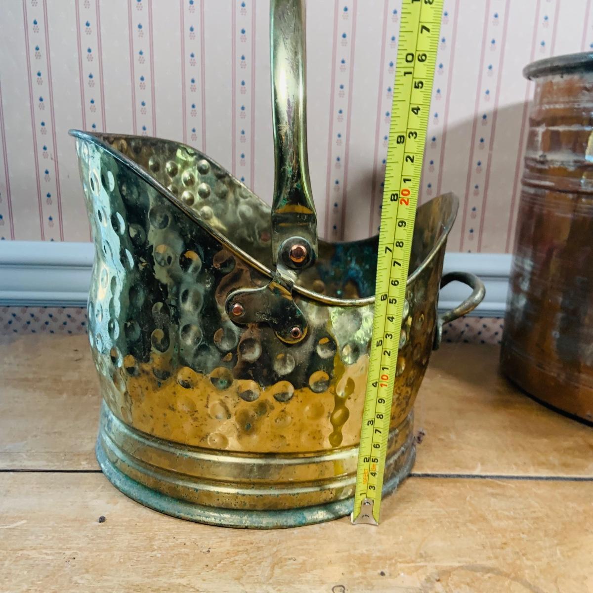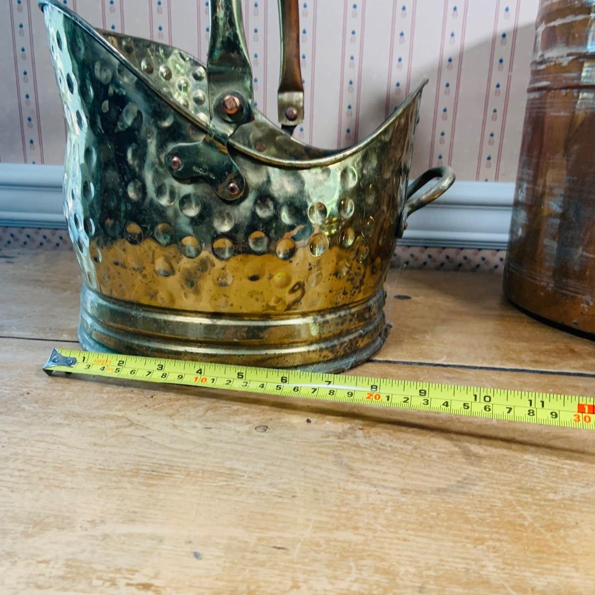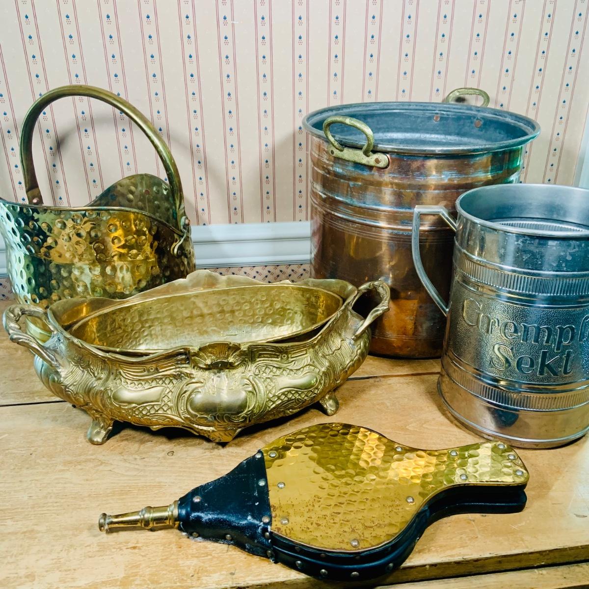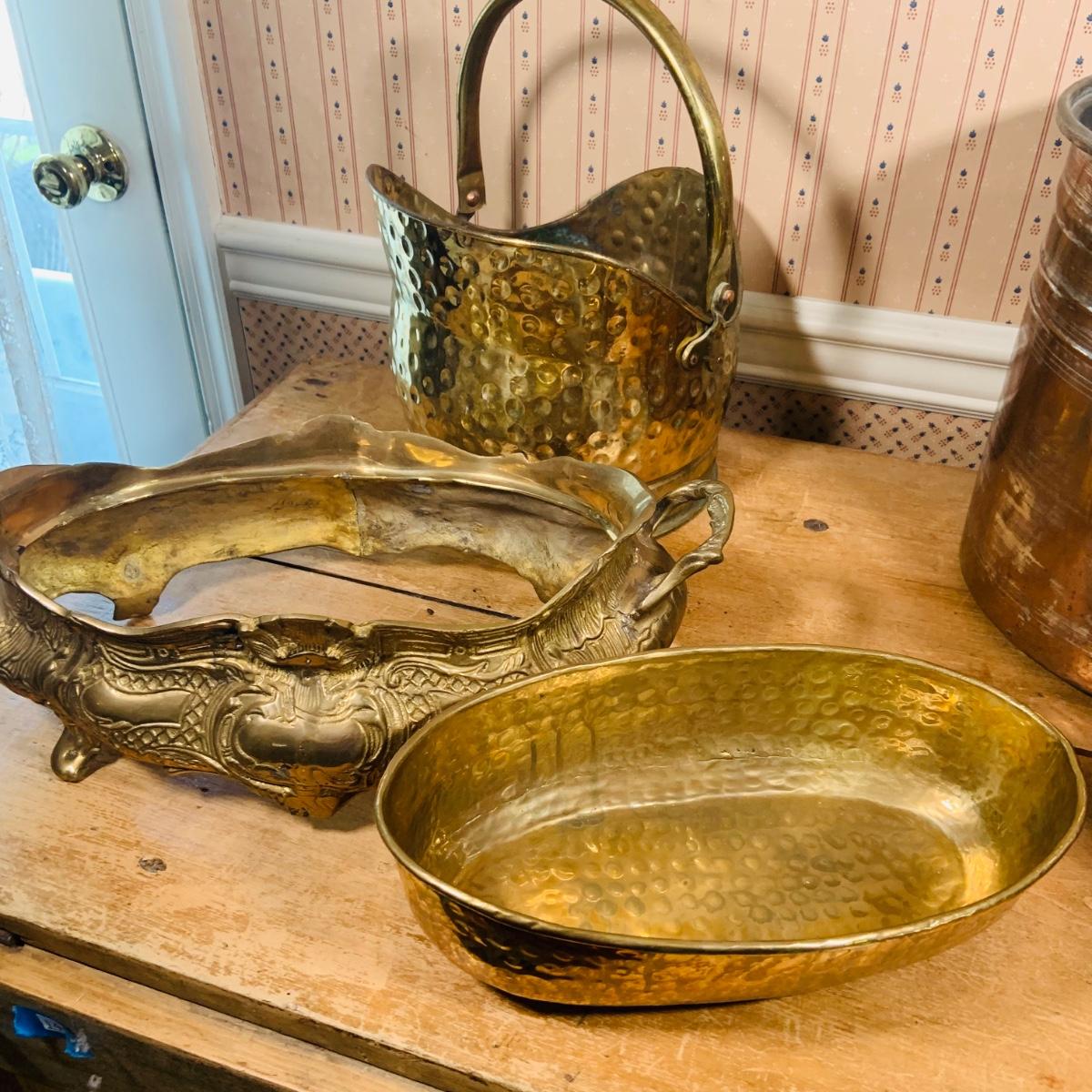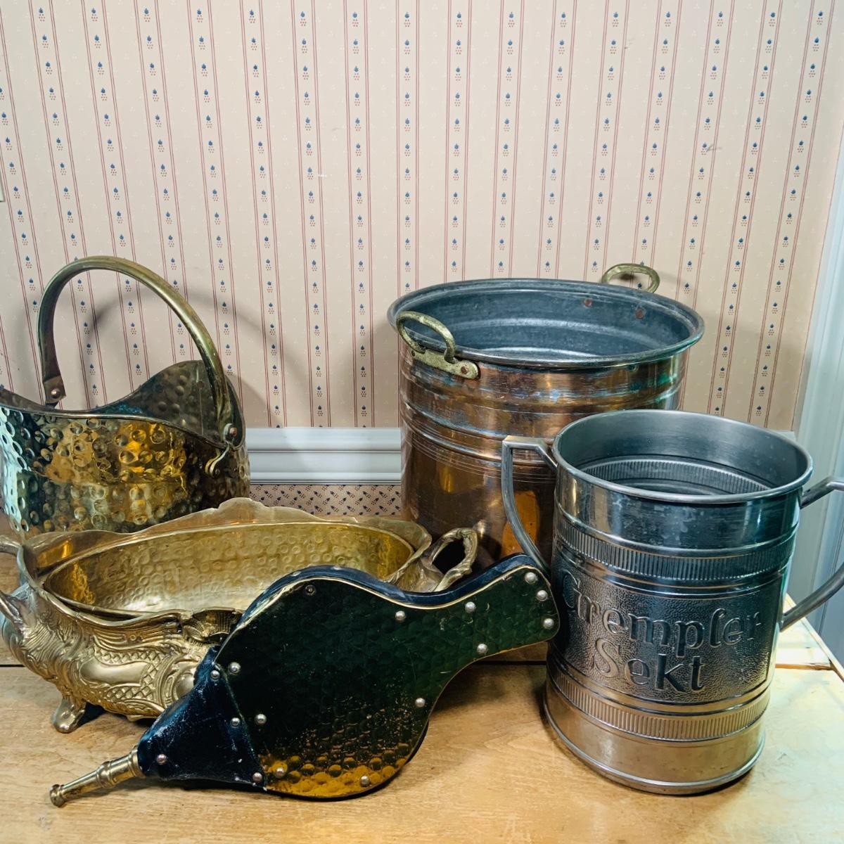 Lot 275: Brass Fireplace Accesories and Other Cooper, Brass and Metal Bucket and Bowls.