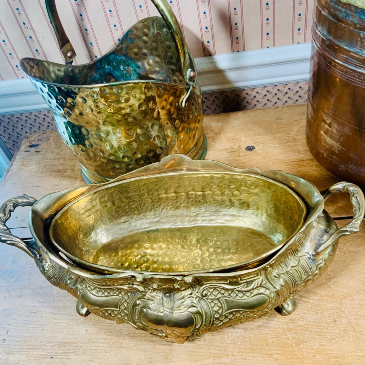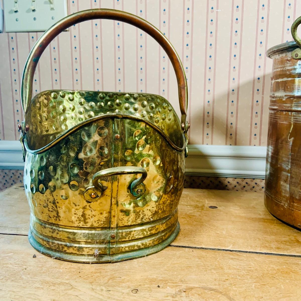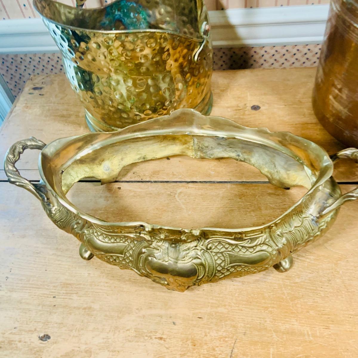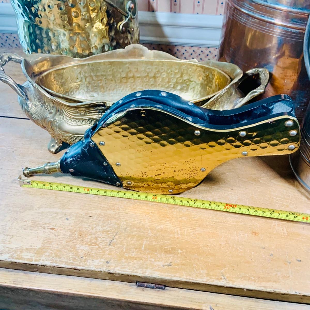 Lot 275: Brass Fireplace Accesories and Other Cooper, Brass and Metal Bucket and Bowls.