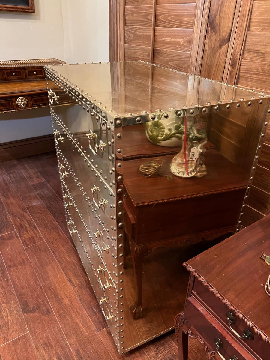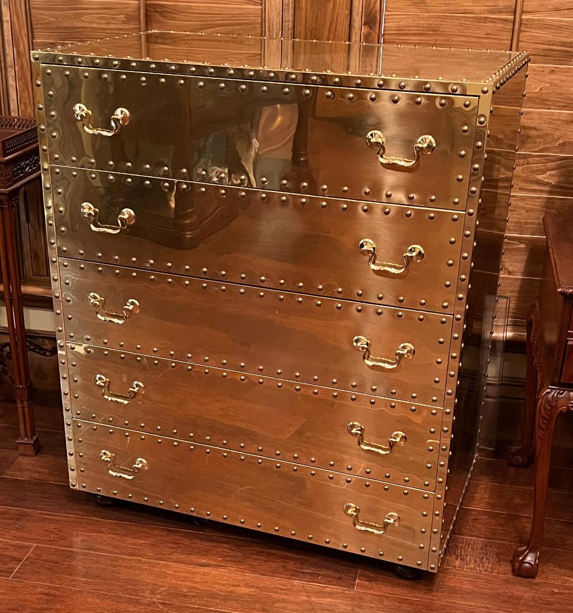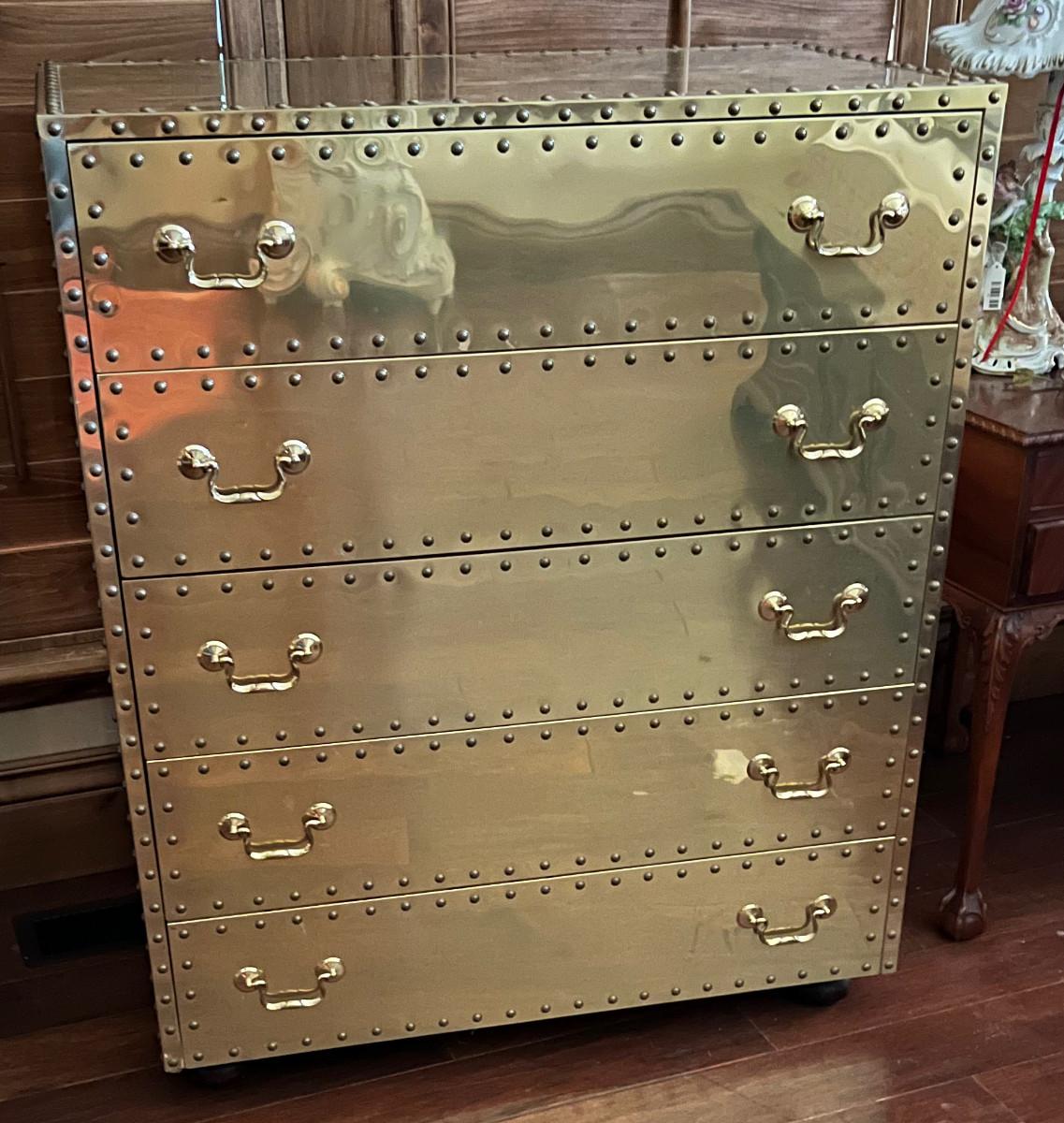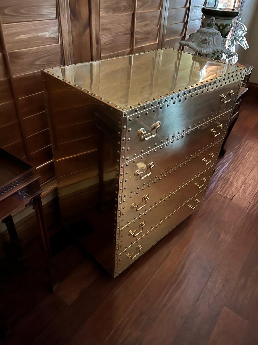 Brass 4-Drawer Chest of Drawers. Excellent condition, beautiful designer piece. 34" wide, 20" deep, 41" tall, wood ball foot.. approximately 65 pounds.