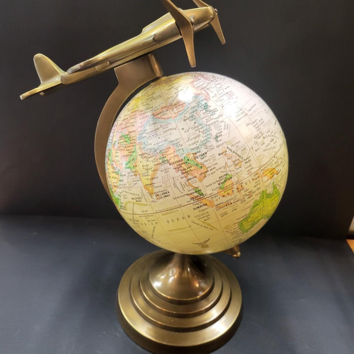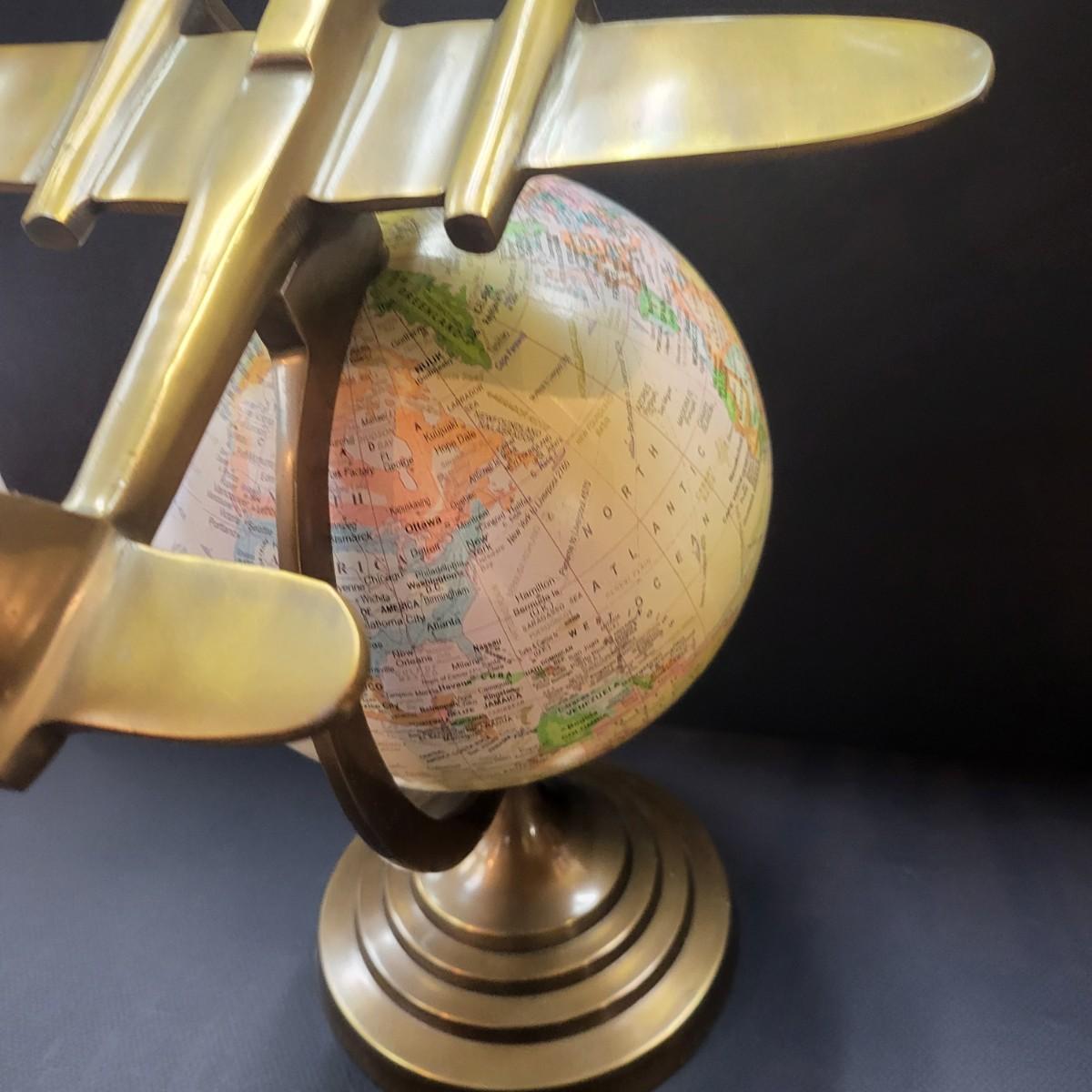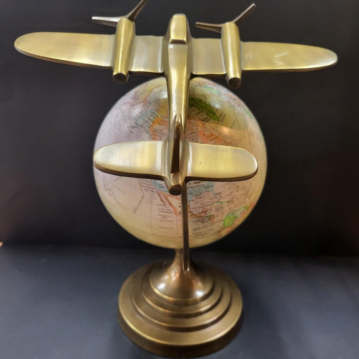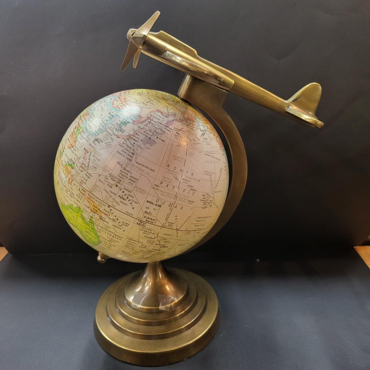 Overall dimensions 25" T x 12" W. Globe is 8.5" diameter. Brass airplane and stand. Propellers spin. Made in India.