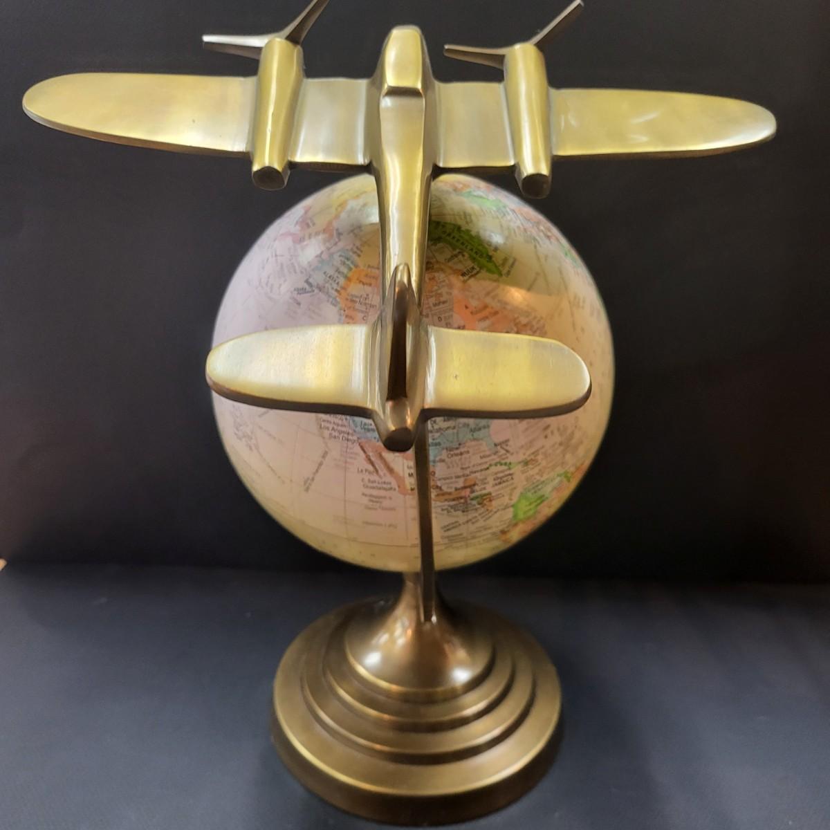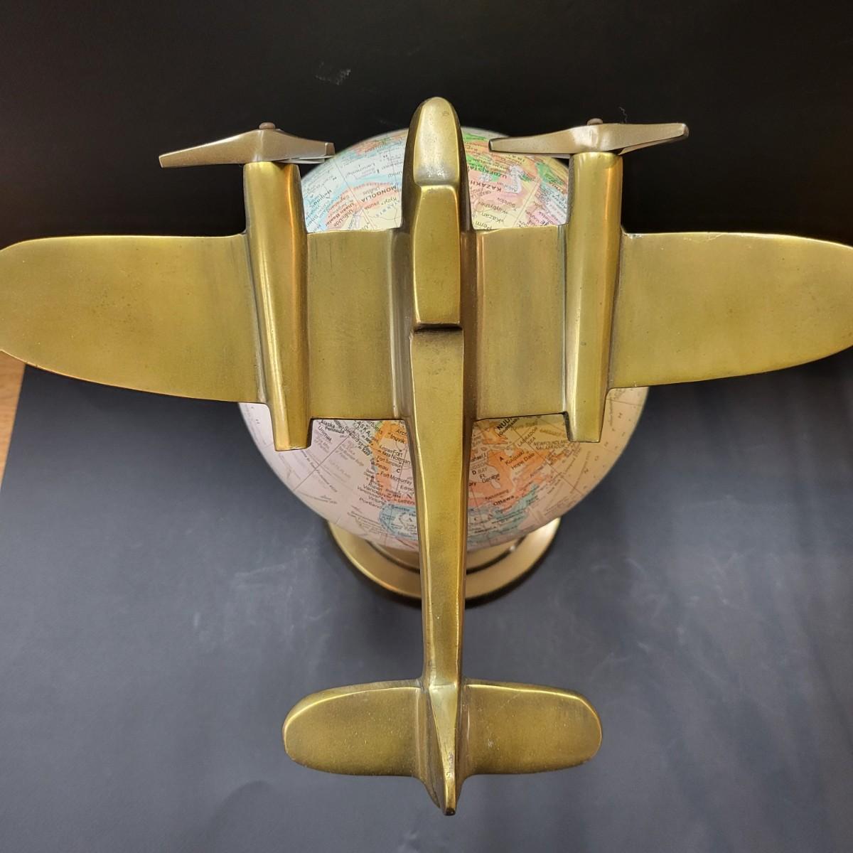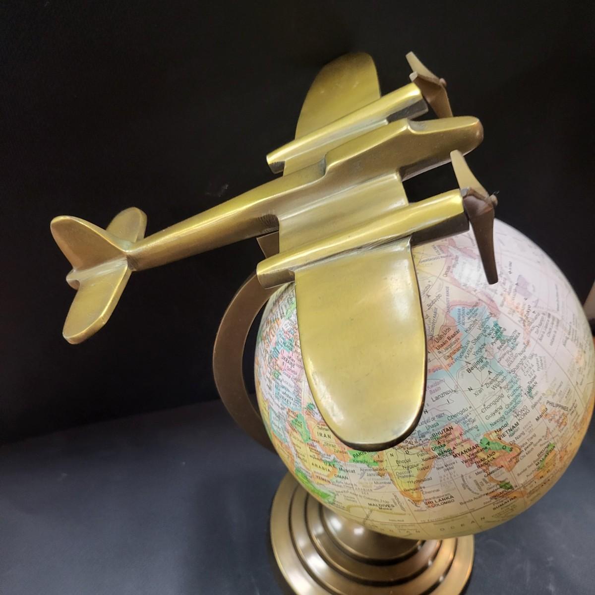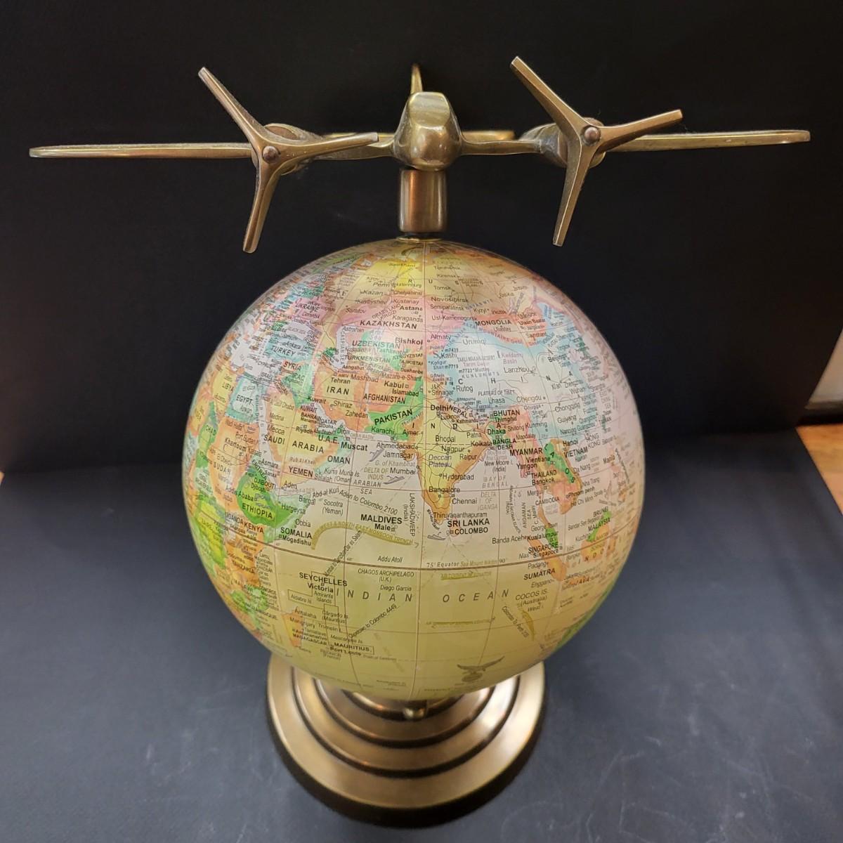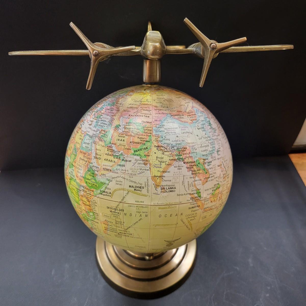 Overall dimensions 25" T x 12" W. Globe is 8.5" diameter. Brass airplane and stand. Propellers spin. Made in India.