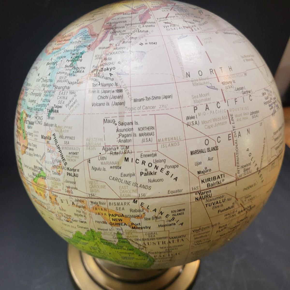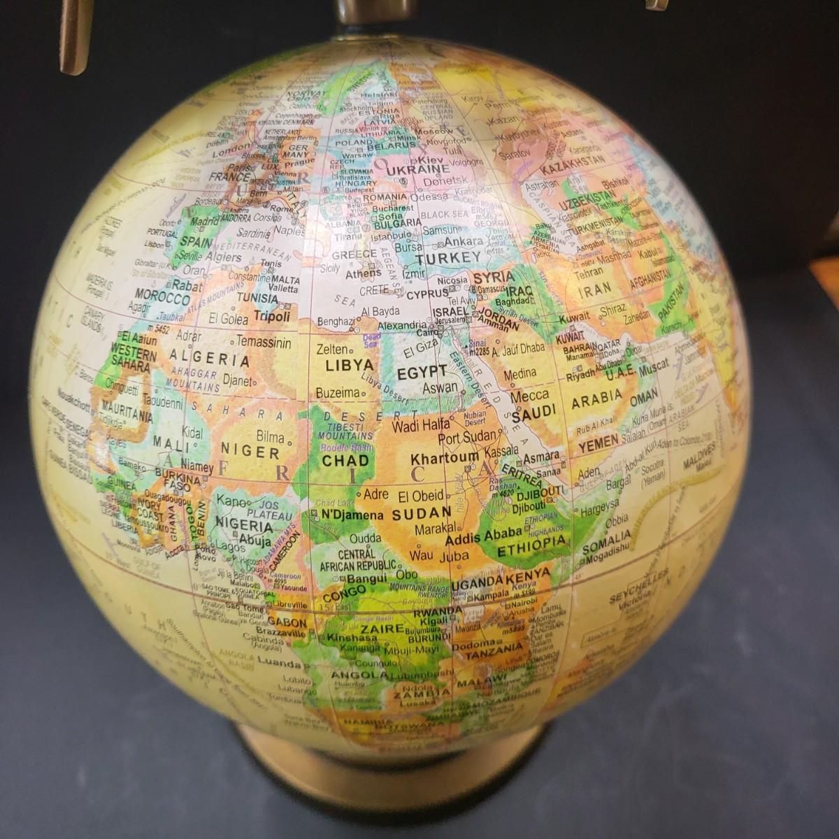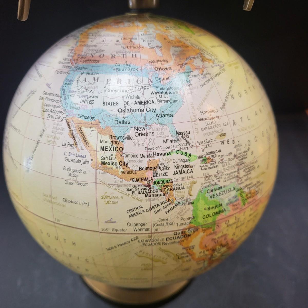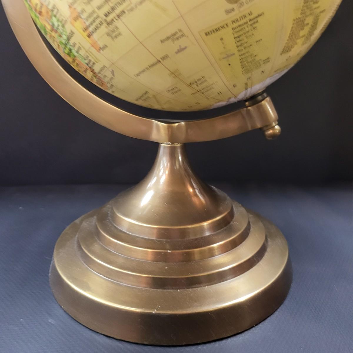 Overall dimensions 25" T x 12" W. Globe is 8.5" diameter. Brass airplane and stand. Propellers spin. Made in India.