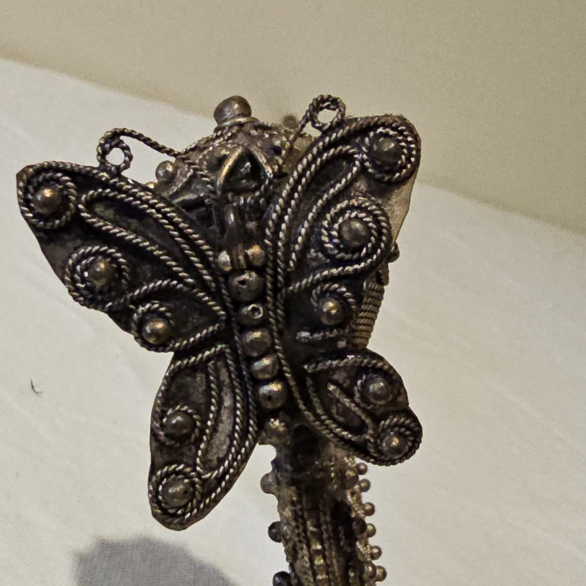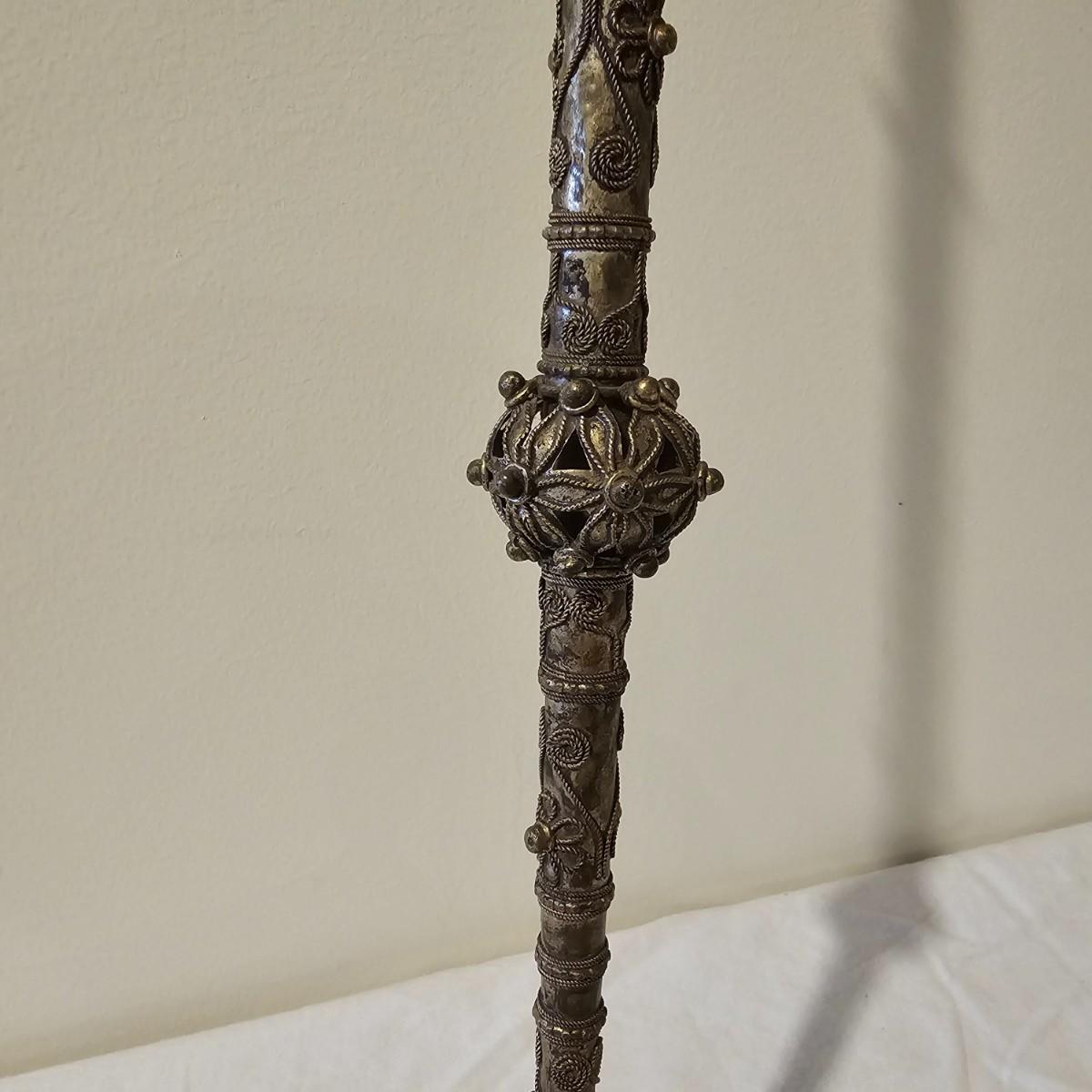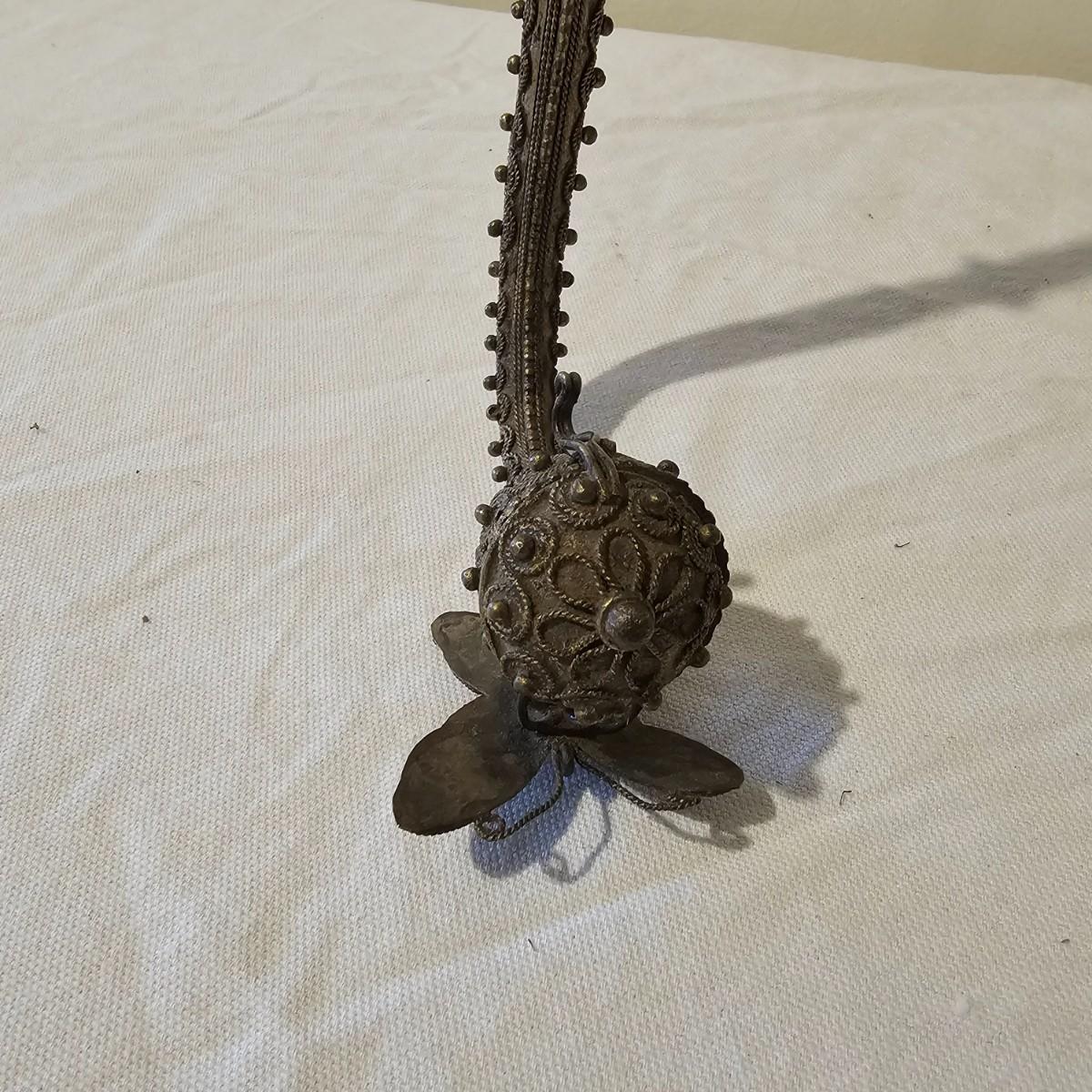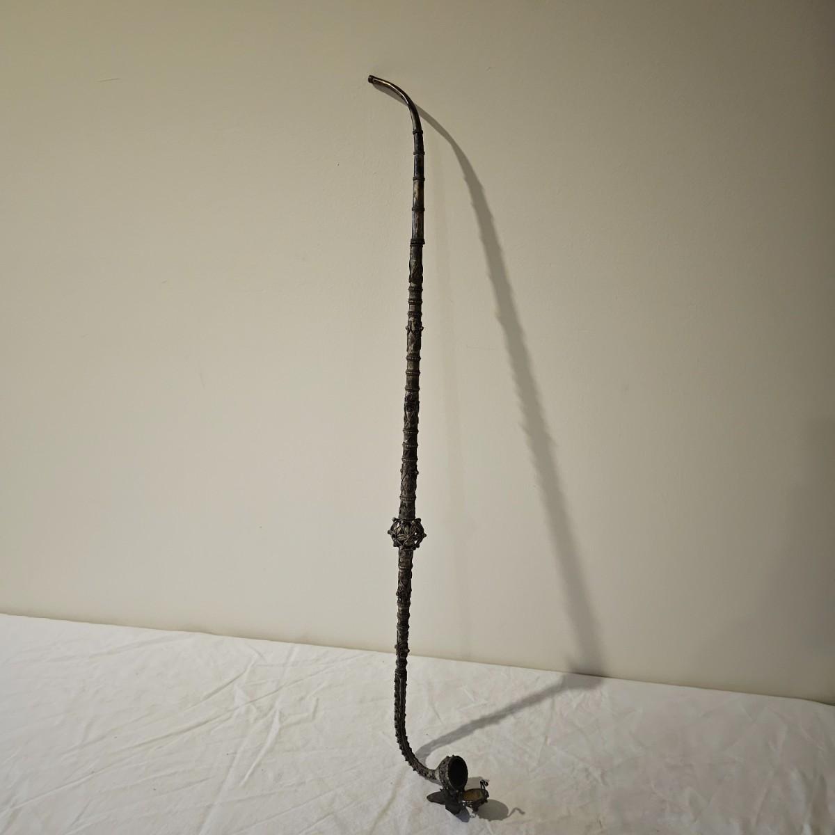 Delicate filigree details adorn this vintage metal pipe. Pipe has butterfly decorated bowl and a lift up cover. Pipe measures 6" x 27.5"H. See photos for details. Shipping available.