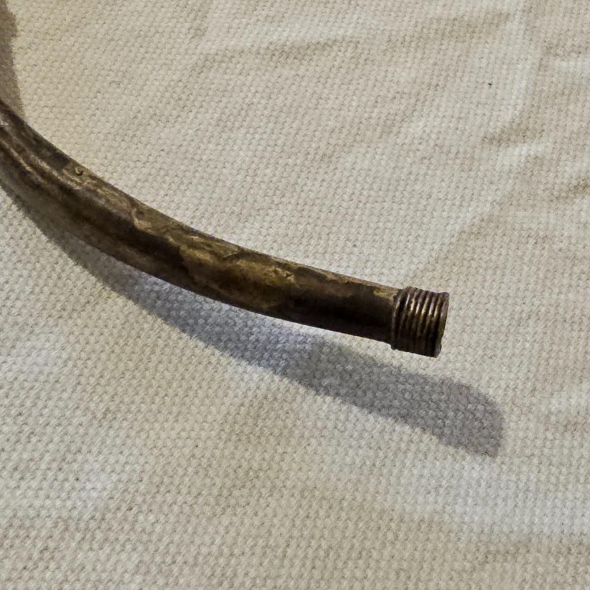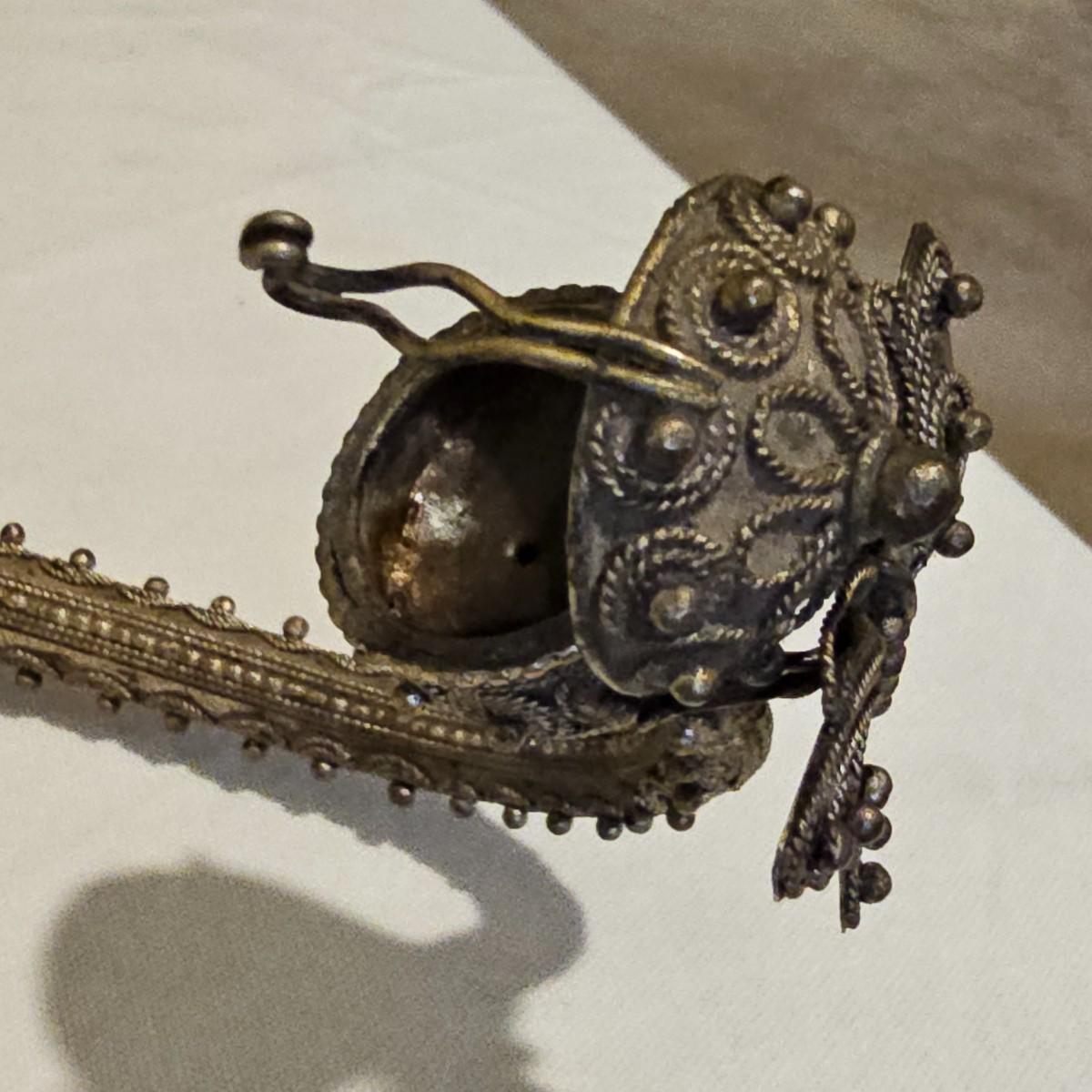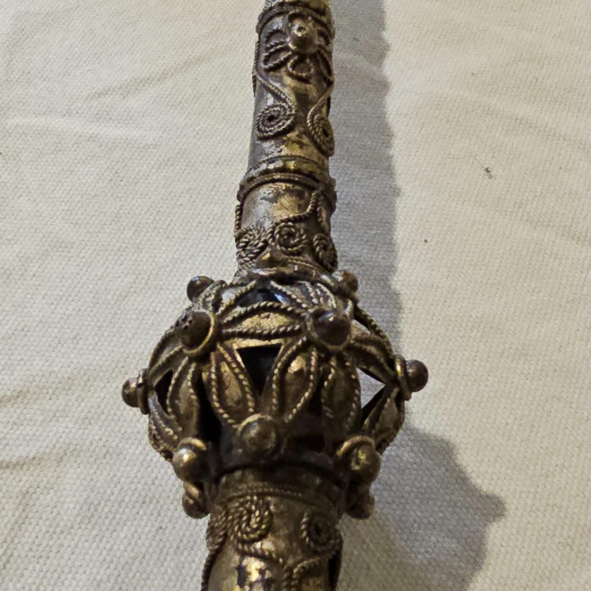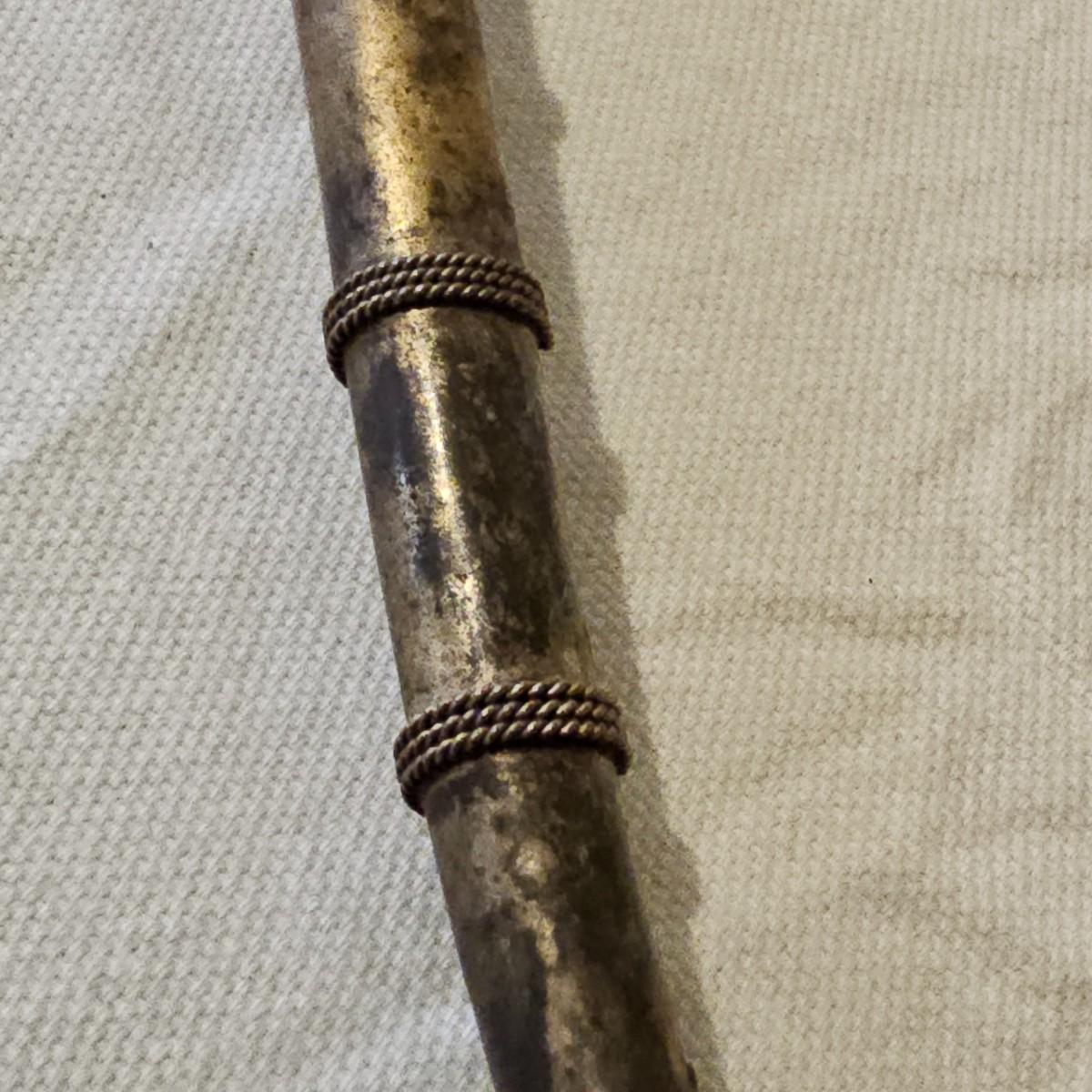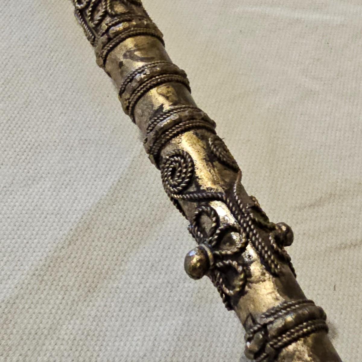 Delicate filigree details adorn this vintage metal pipe. Pipe has butterfly decorated bowl and a lift up cover. Pipe measures 6" x 27.5"H. See photos for details. Shipping available.
