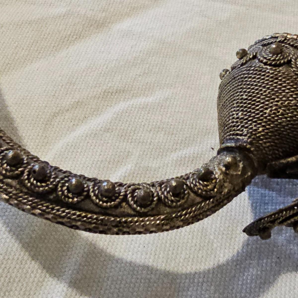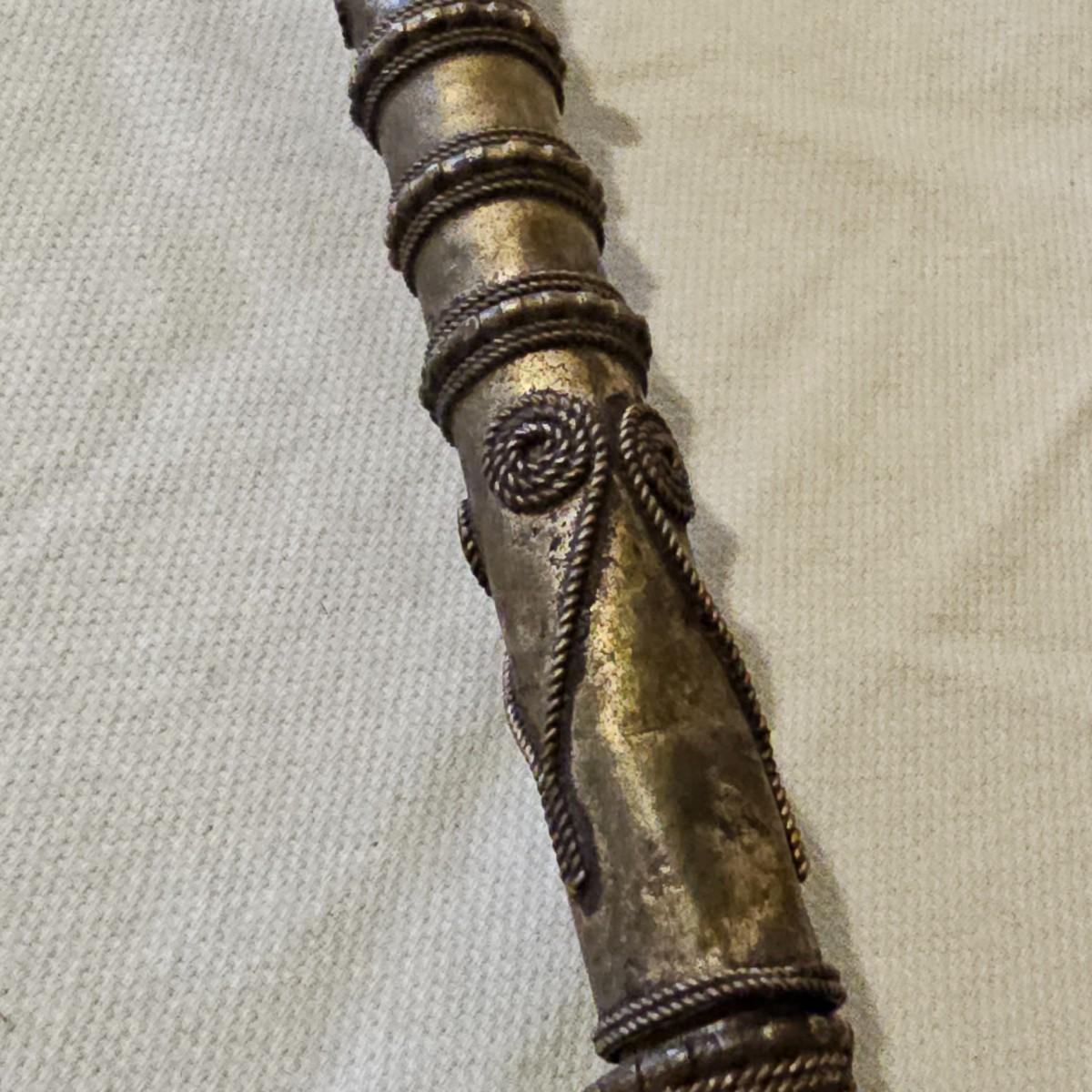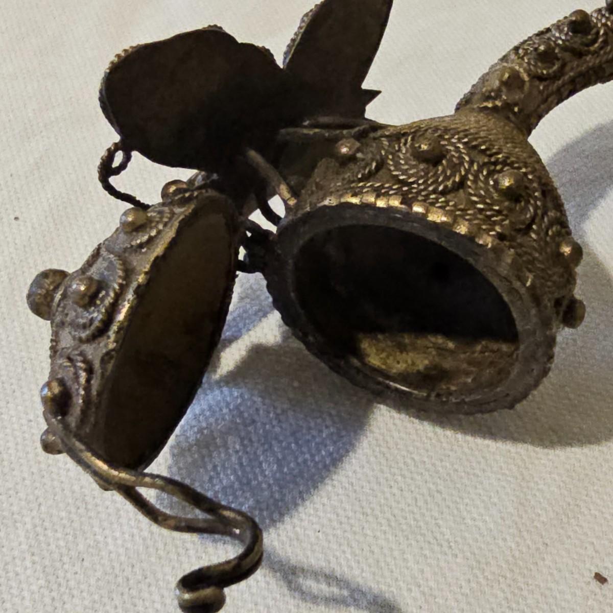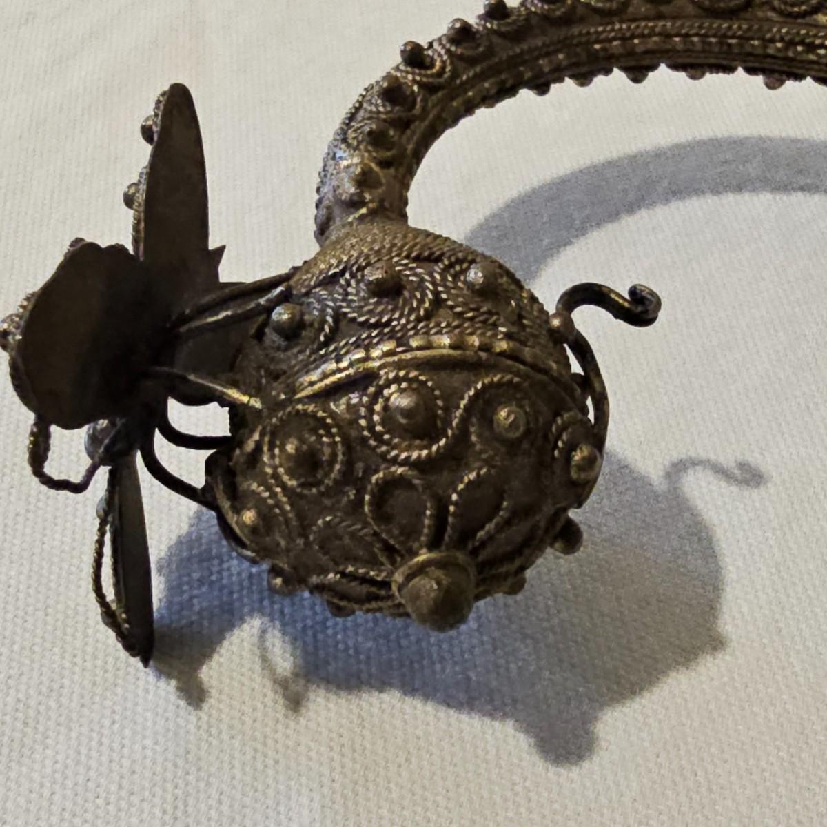 Delicate filigree details adorn this vintage metal pipe. Pipe has butterfly decorated bowl and a lift up cover. Pipe measures 6" x 27.5"H. See photos for details. Shipping available.