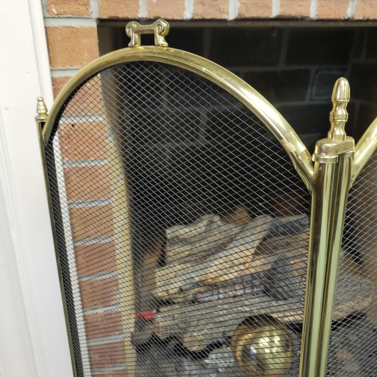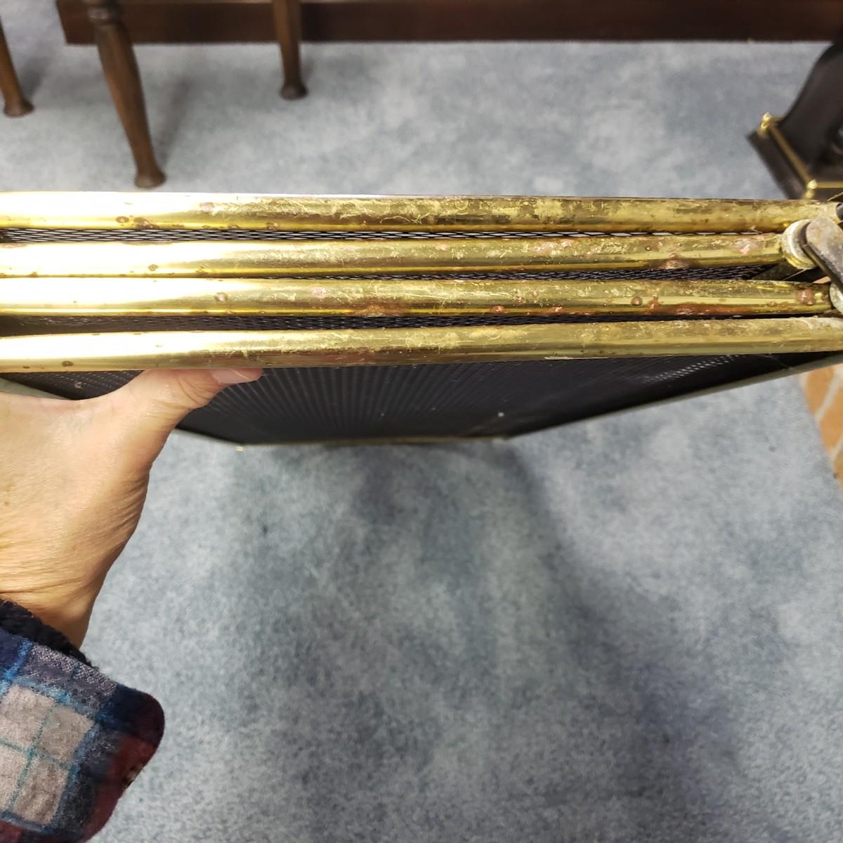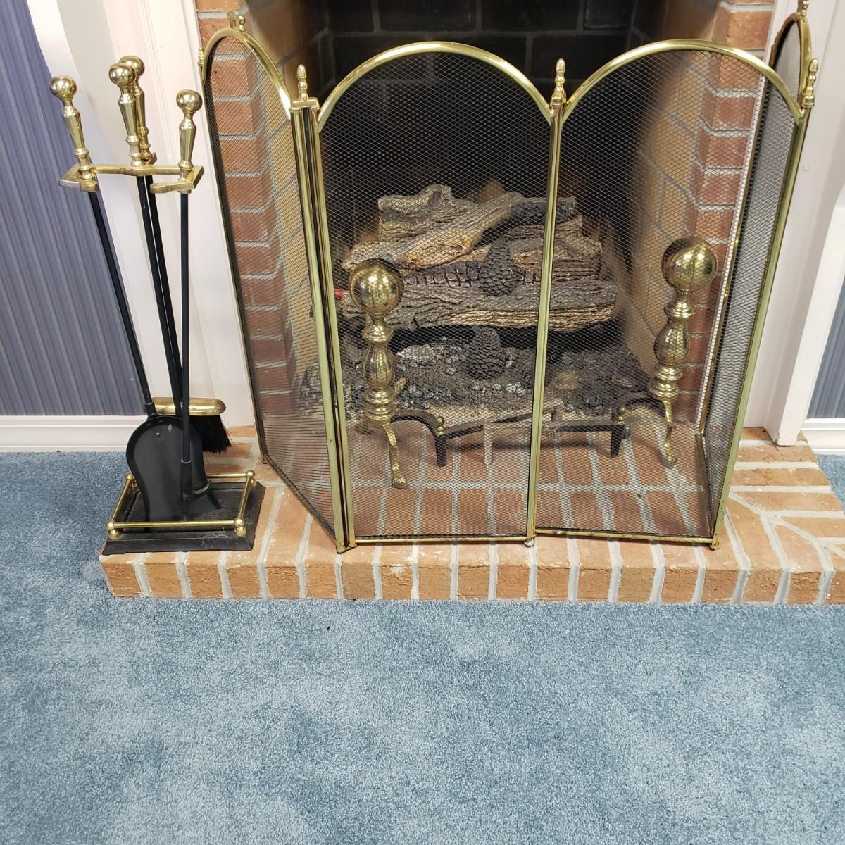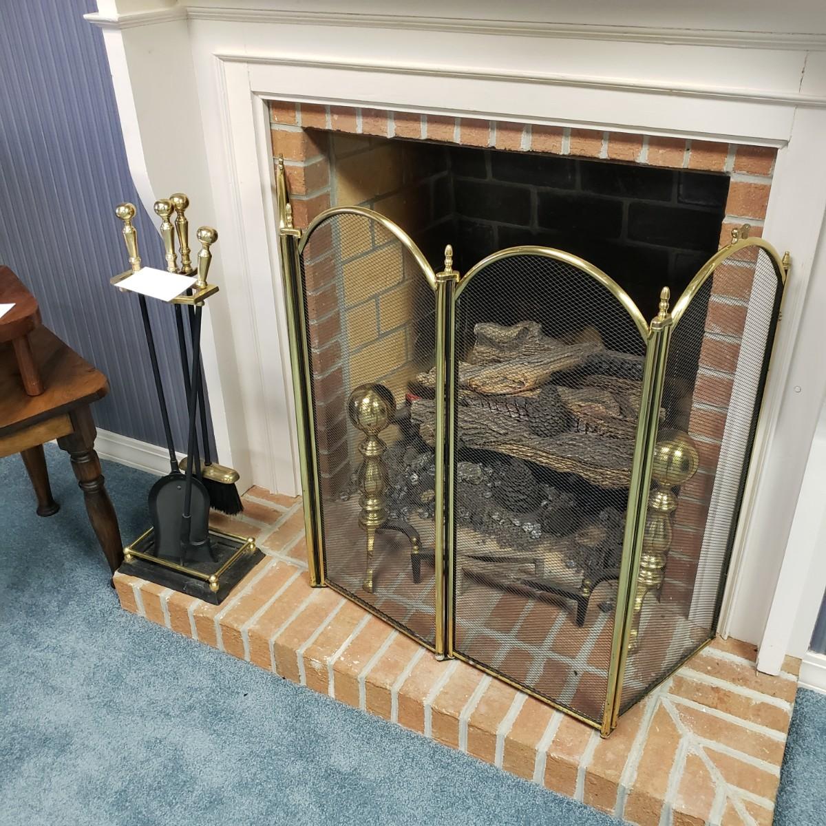 This fireplace set includes a screen, utensil set and a pair of andirons. The screen measures 12" x 32"H for one panel. The sides are metal and the decorative handles and knobs are brass. The one side of the "feet" are missing the piece holding them together, see picture. The cast iron and brass fireplace set with poker, shovel and broom appear to never have been used, as it was in front of a gas fireplace. The andirons measure 15" x 9" x 17"H.