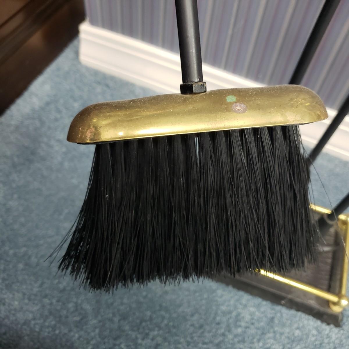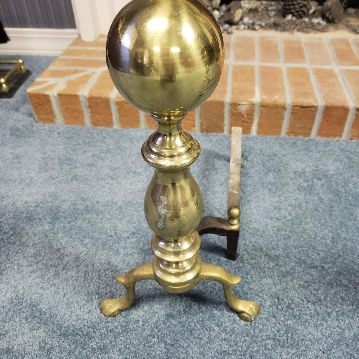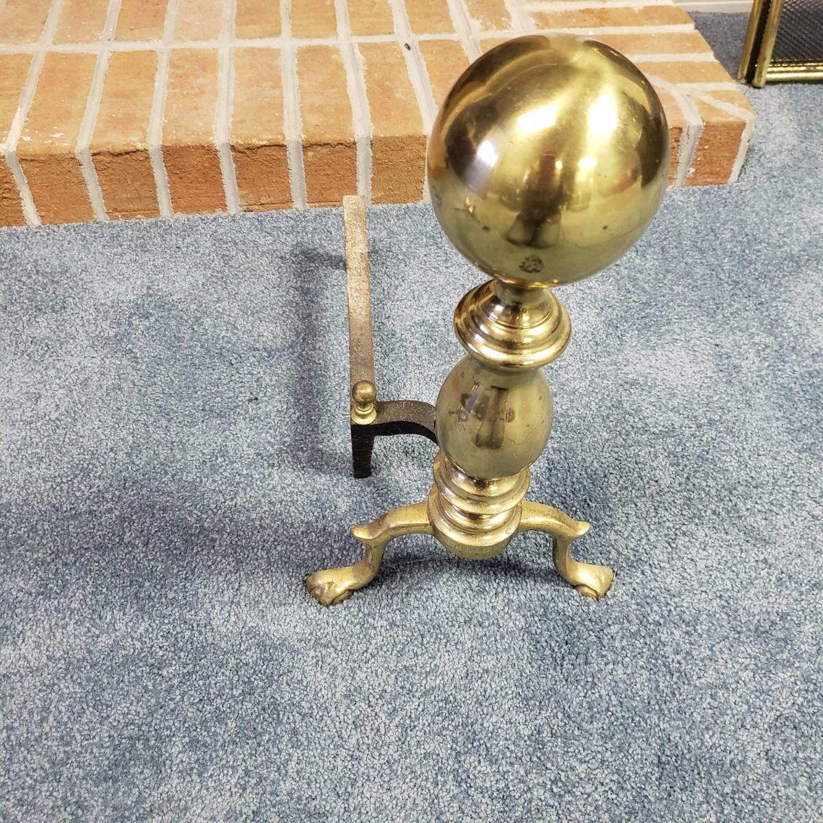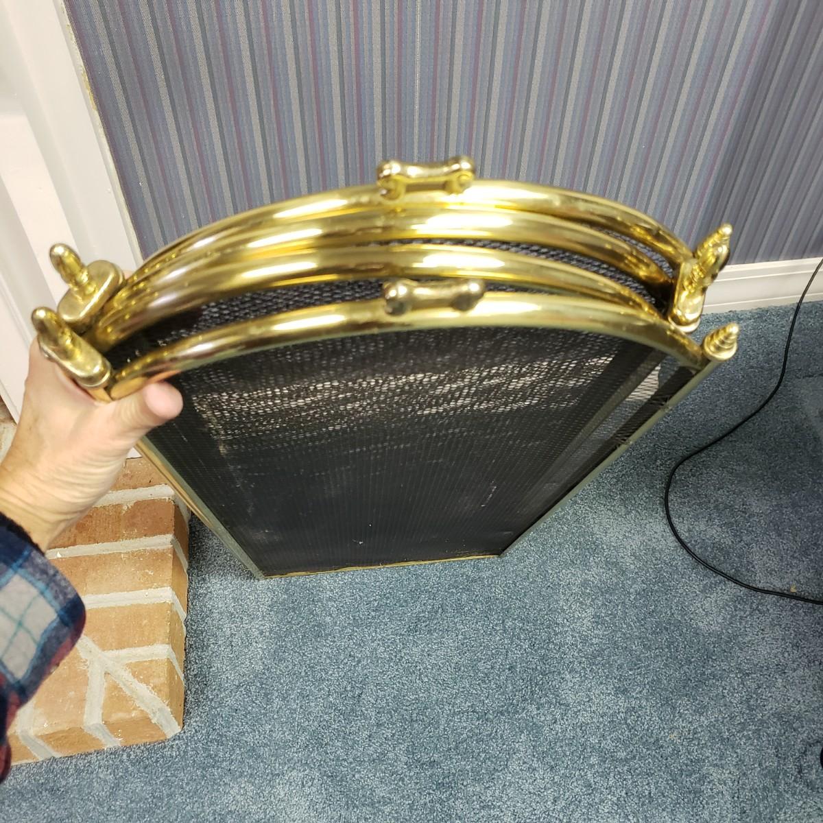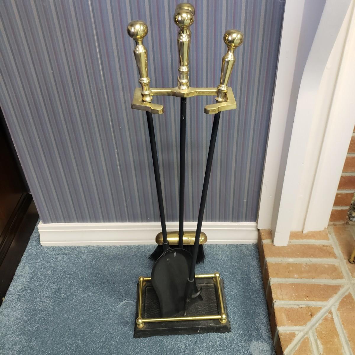 This fireplace set includes a screen, utensil set and a pair of andirons. The screen measures 12" x 32"H for one panel. The sides are metal and the decorative handles and knobs are brass. The one side of the "feet" are missing the piece holding them together, see picture. The cast iron and brass fireplace set with poker, shovel and broom appear to never have been used, as it was in front of a gas fireplace. The andirons measure 15" x 9" x 17"H.