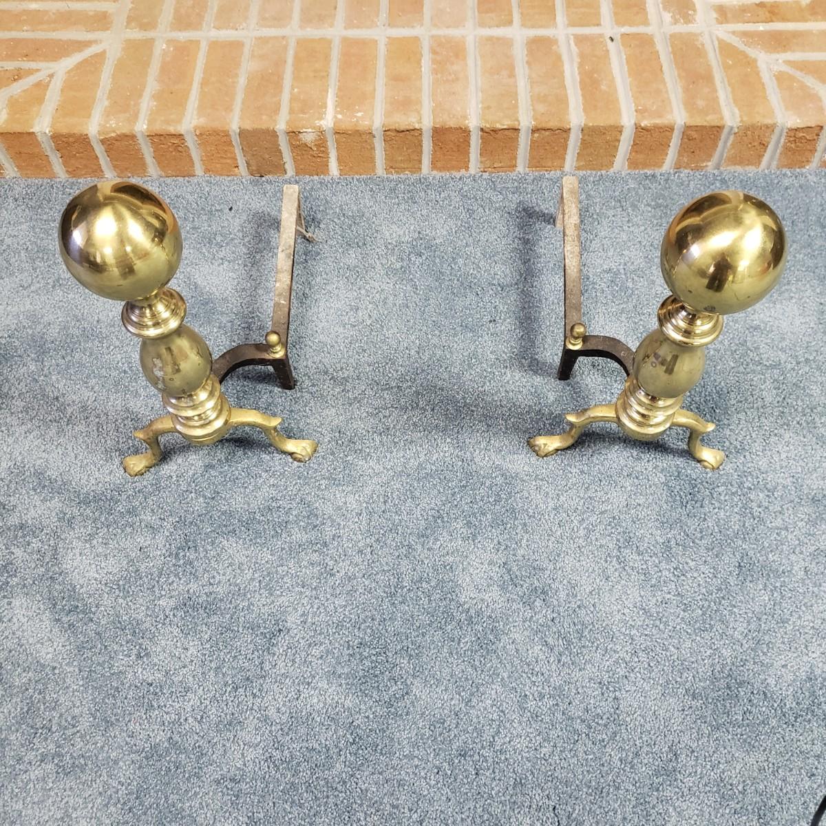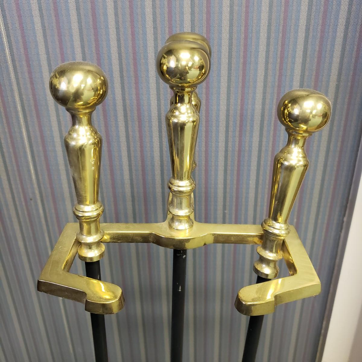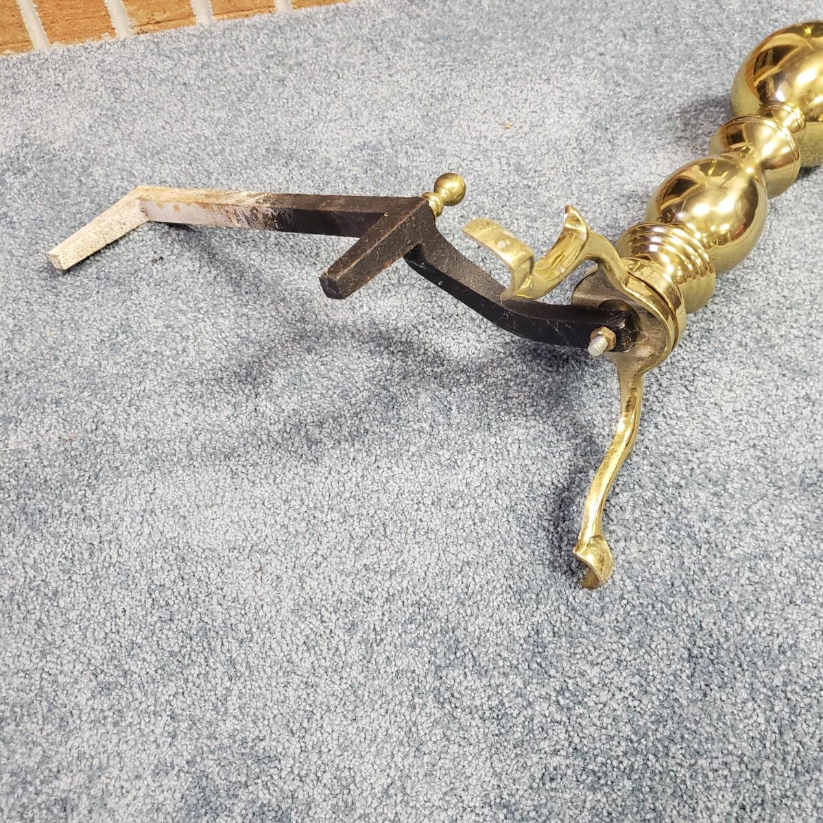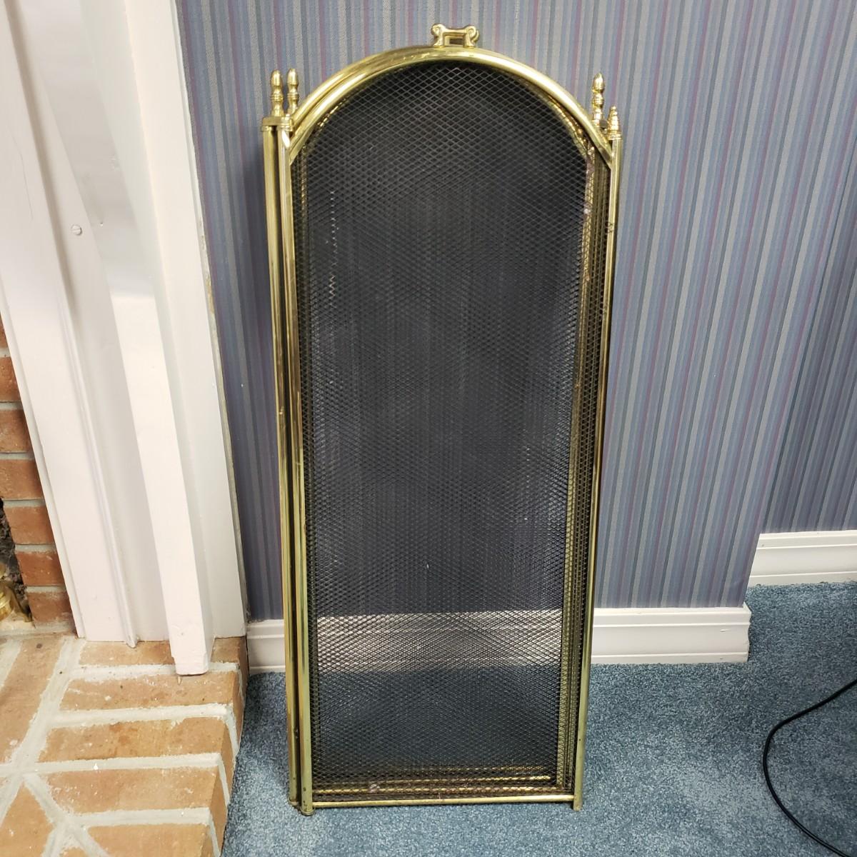 This fireplace set includes a screen, utensil set and a pair of andirons. The screen measures 12" x 32"H for one panel. The sides are metal and the decorative handles and knobs are brass. The one side of the "feet" are missing the piece holding them together, see picture. The cast iron and brass fireplace set with poker, shovel and broom appear to never have been used, as it was in front of a gas fireplace. The andirons measure 15" x 9" x 17"H.