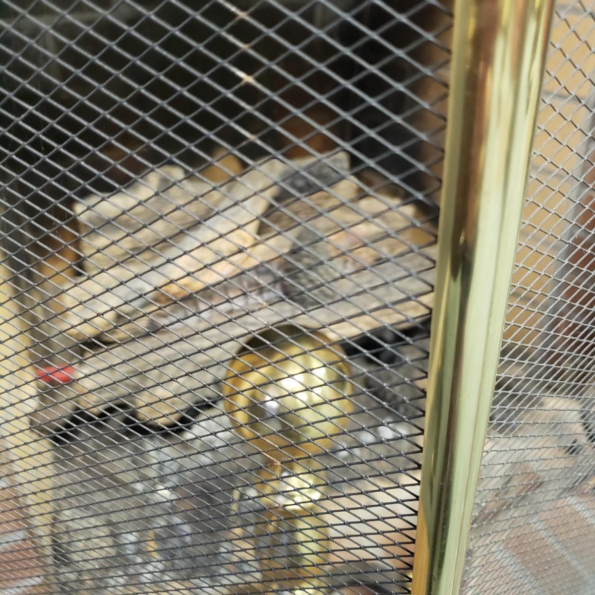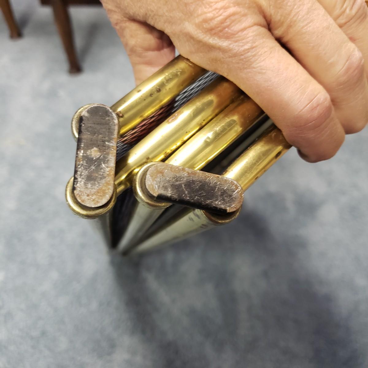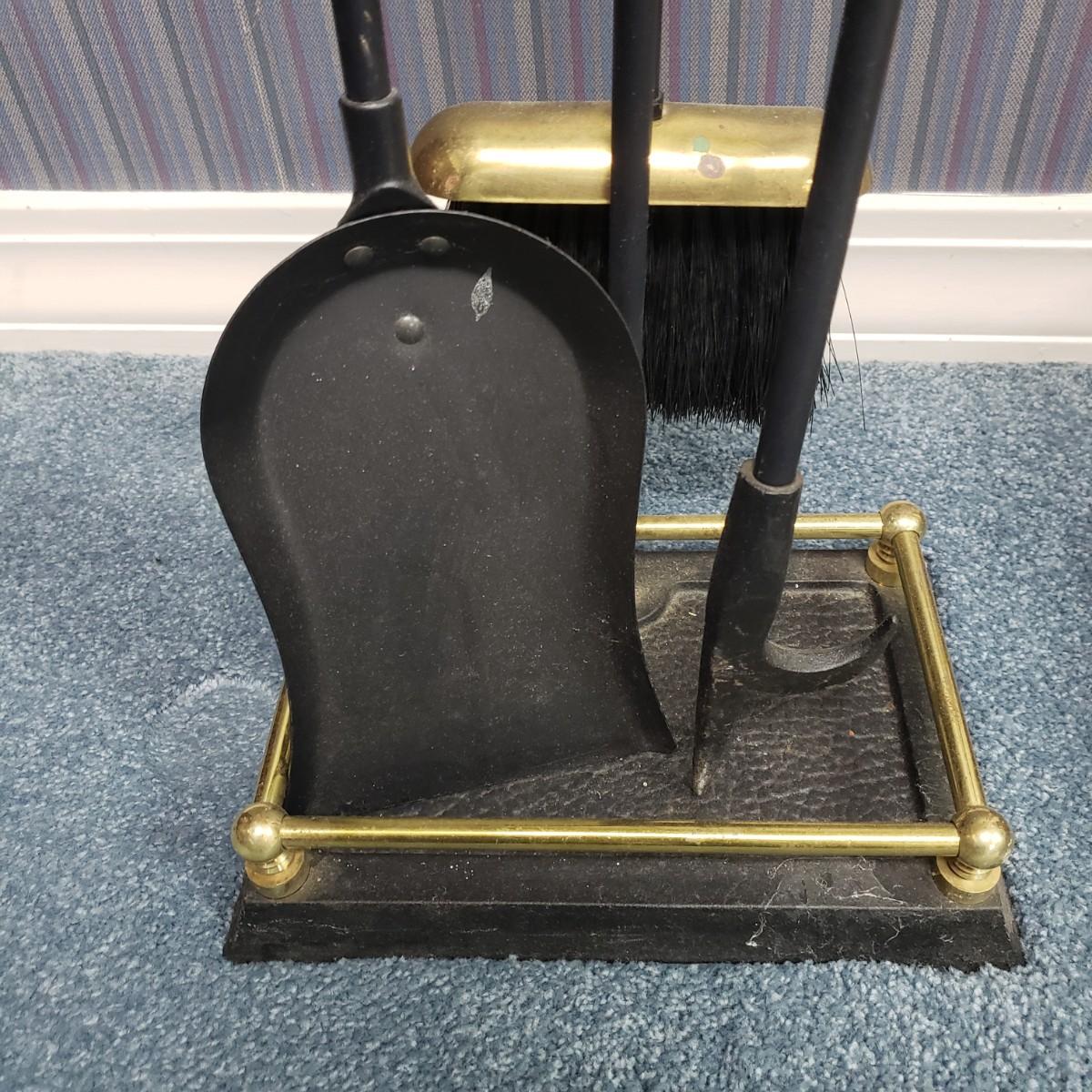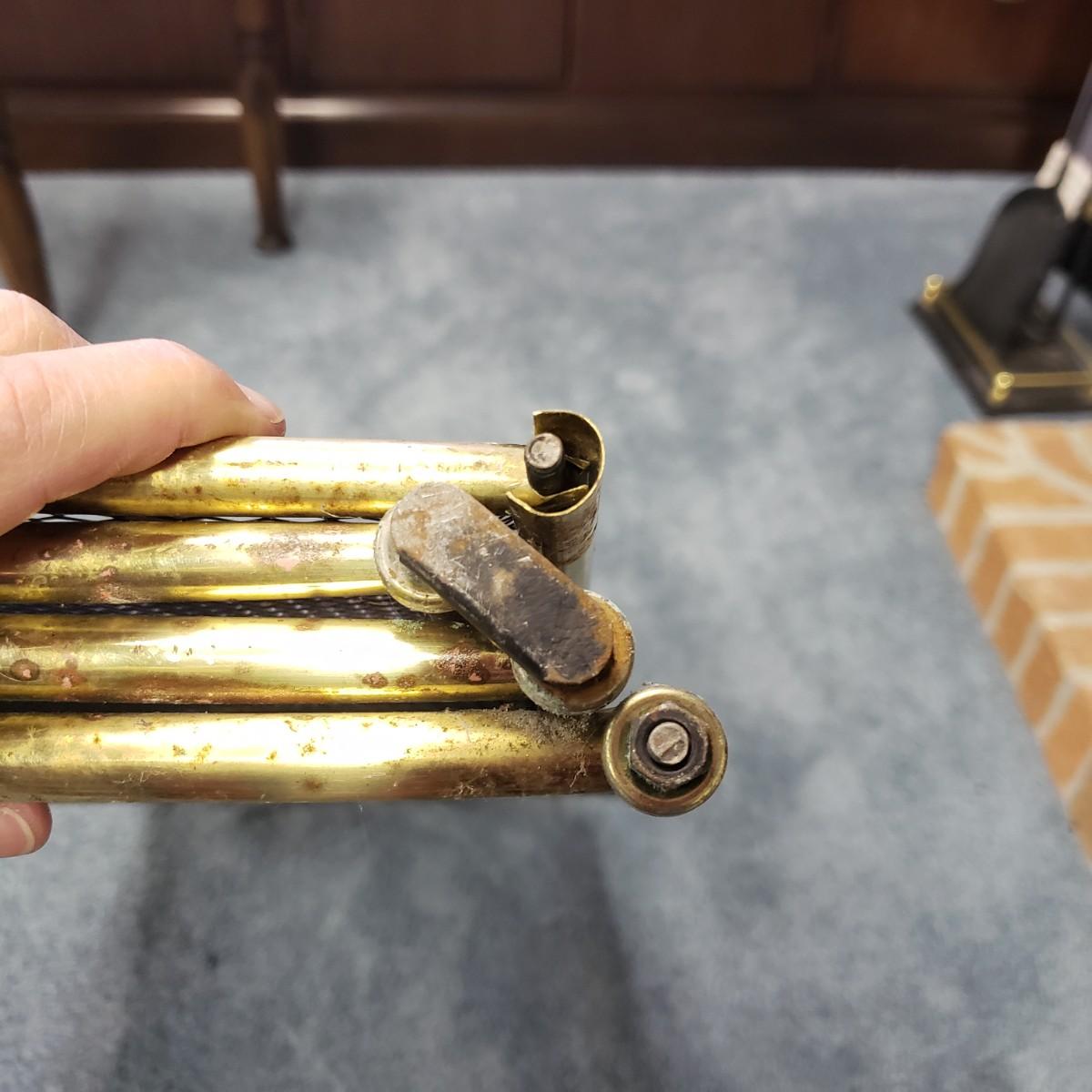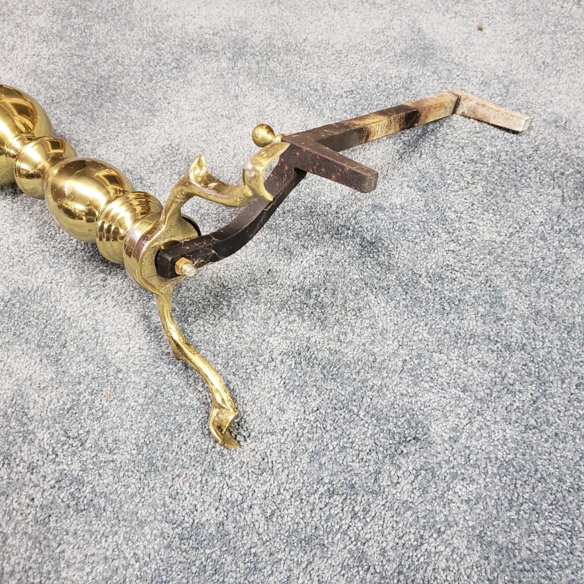 This fireplace set includes a screen, utensil set and a pair of andirons. The screen measures 12" x 32"H for one panel. The sides are metal and the decorative handles and knobs are brass. The one side of the "feet" are missing the piece holding them together, see picture. The cast iron and brass fireplace set with poker, shovel and broom appear to never have been used, as it was in front of a gas fireplace. The andirons measure 15" x 9" x 17"H.