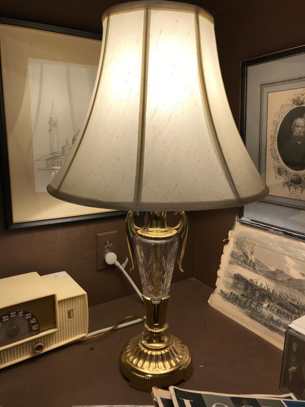 Very nice solid brass and crystal lamp. Solid brass fluted footed base with cut crystal urn center, toped with solid brass fluted cap and scrolled arms. Nice bell shade. 17" D shade x 29" H to finial.