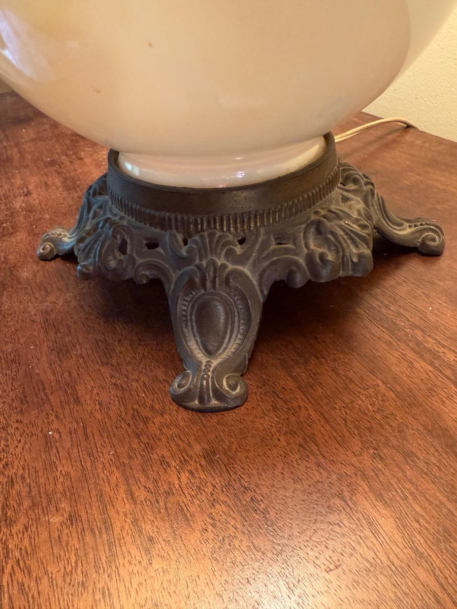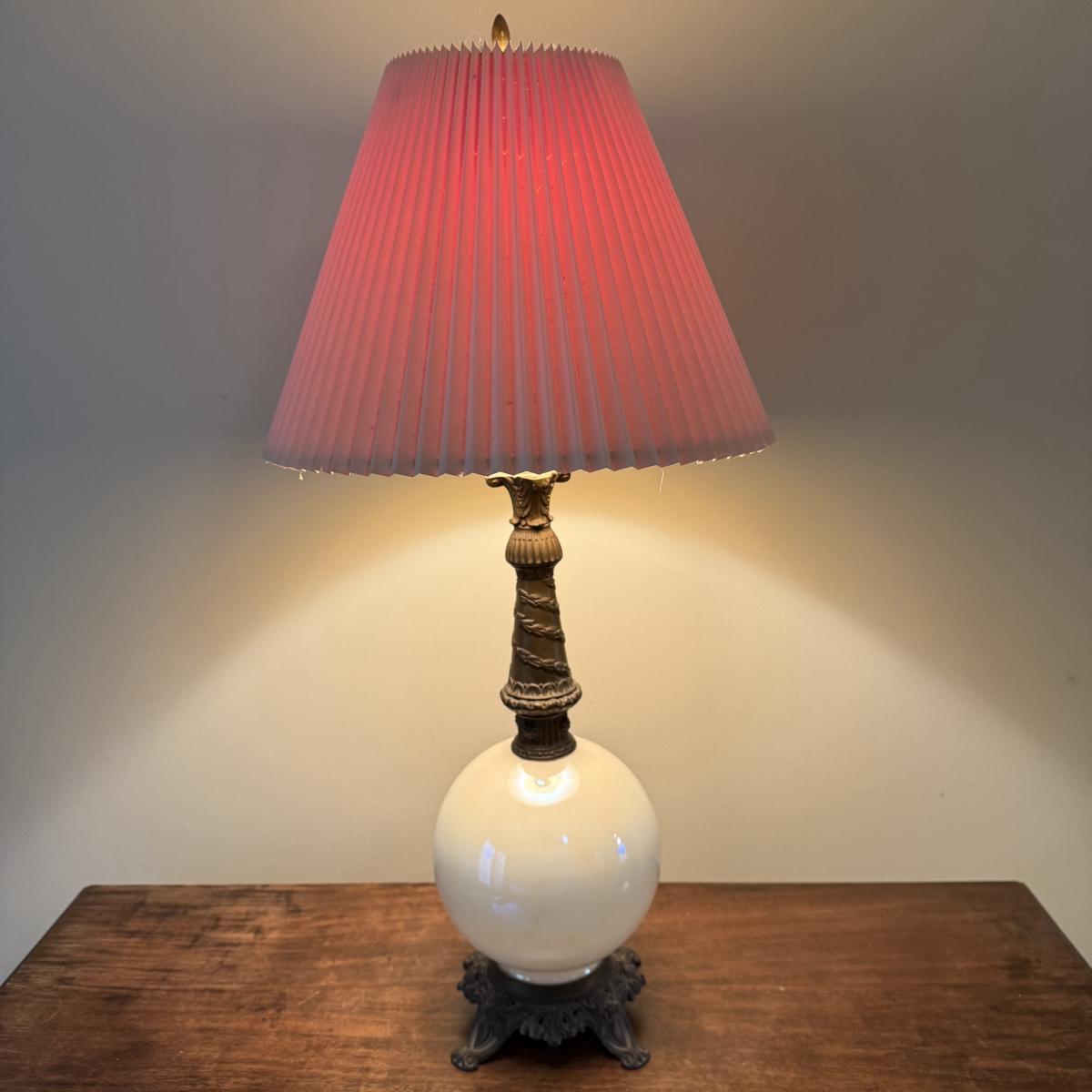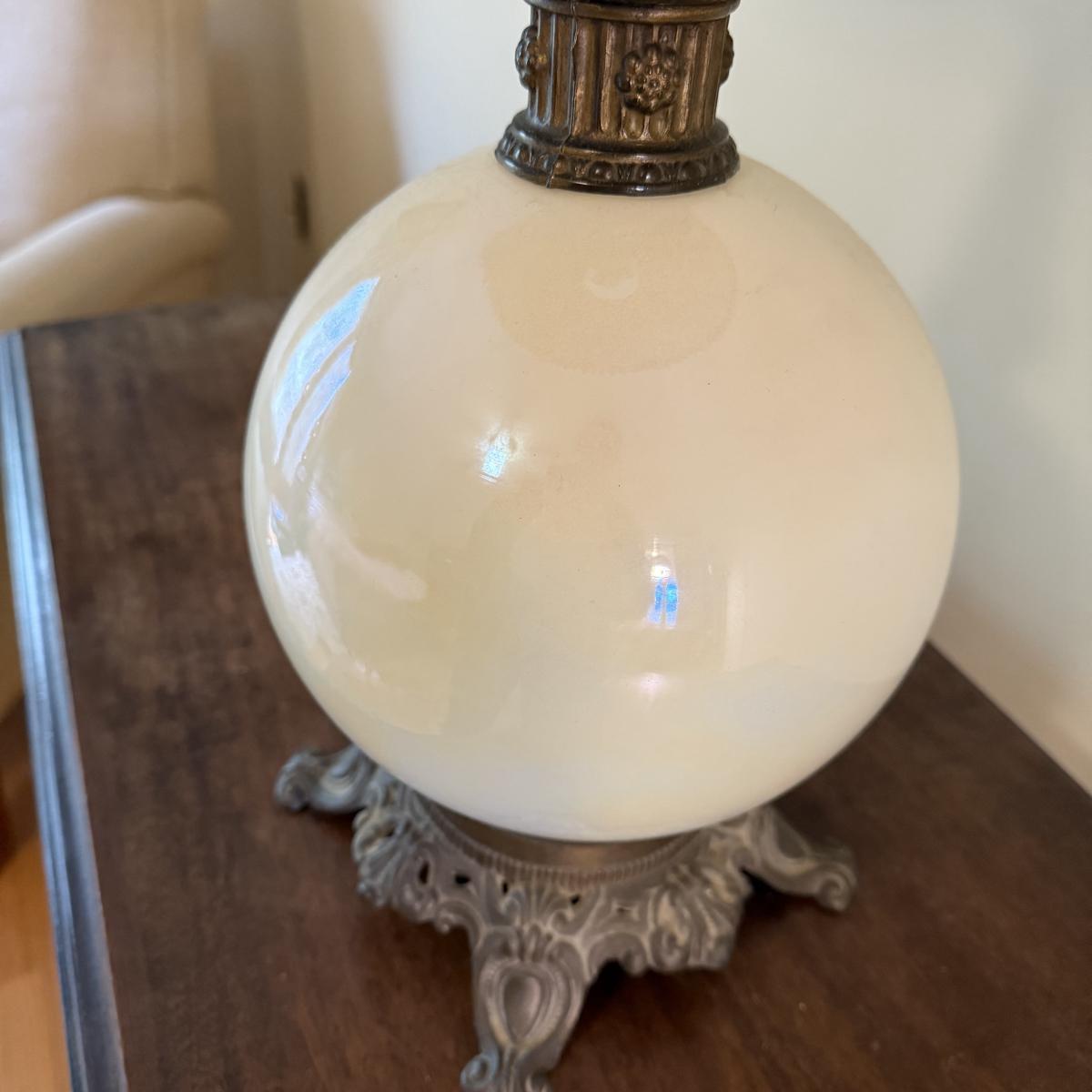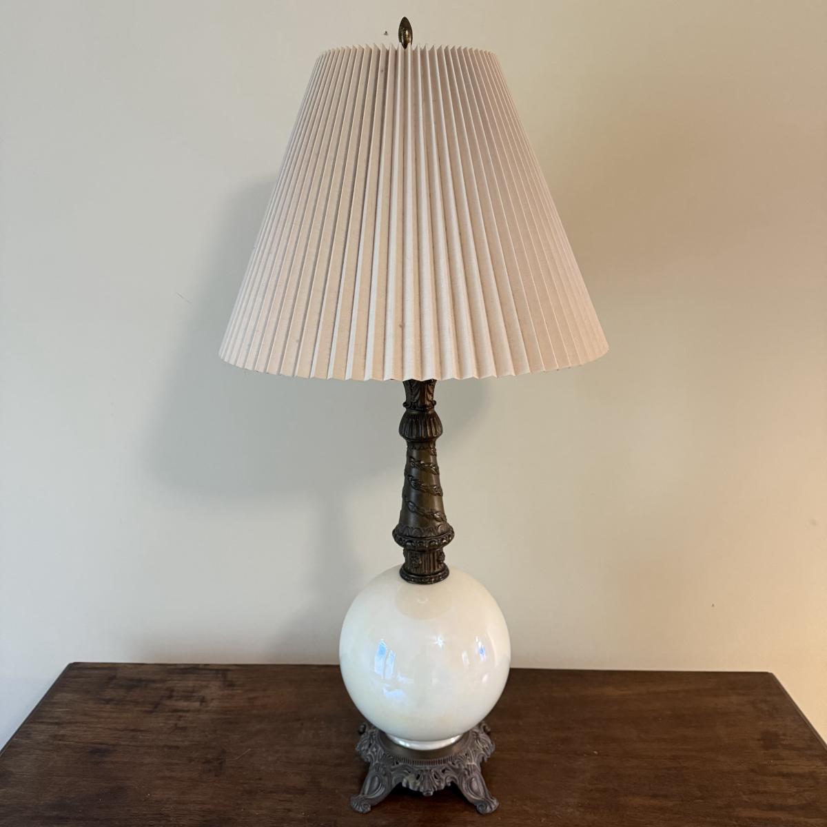 In this lot we have a stunning what appears to be brass table lamp with a stunning iridescent white globe base. This lamp measures 7” x 7” at the base and stands approximately 33”H. This is a one way lamp and is included with a corrugated lampshade. It does turn on. Shipping available. Shipping can be costly. We suggest contacting our preferred local shipping provider, Postage Express, with dimensions and getting an estimate before bidding: (828) 255-9250 or shipping@postageexpressnc.com.