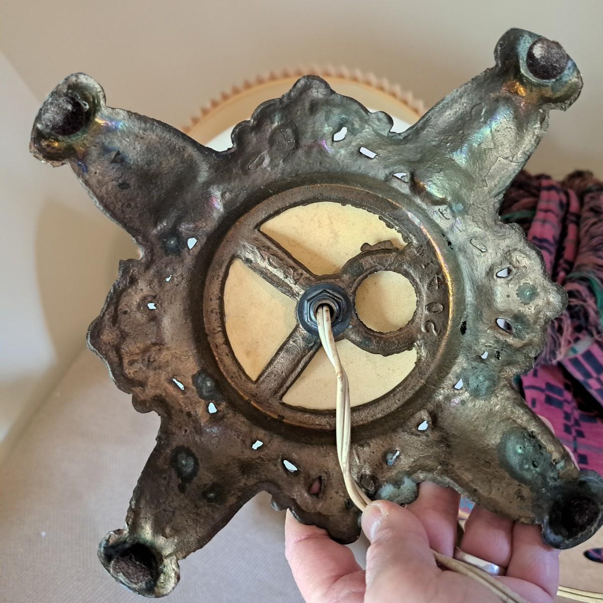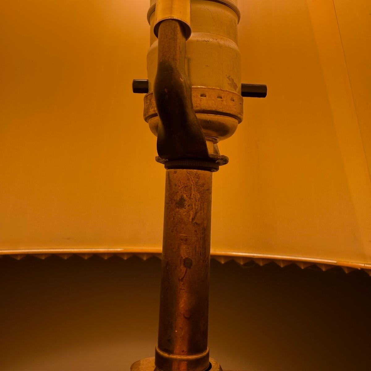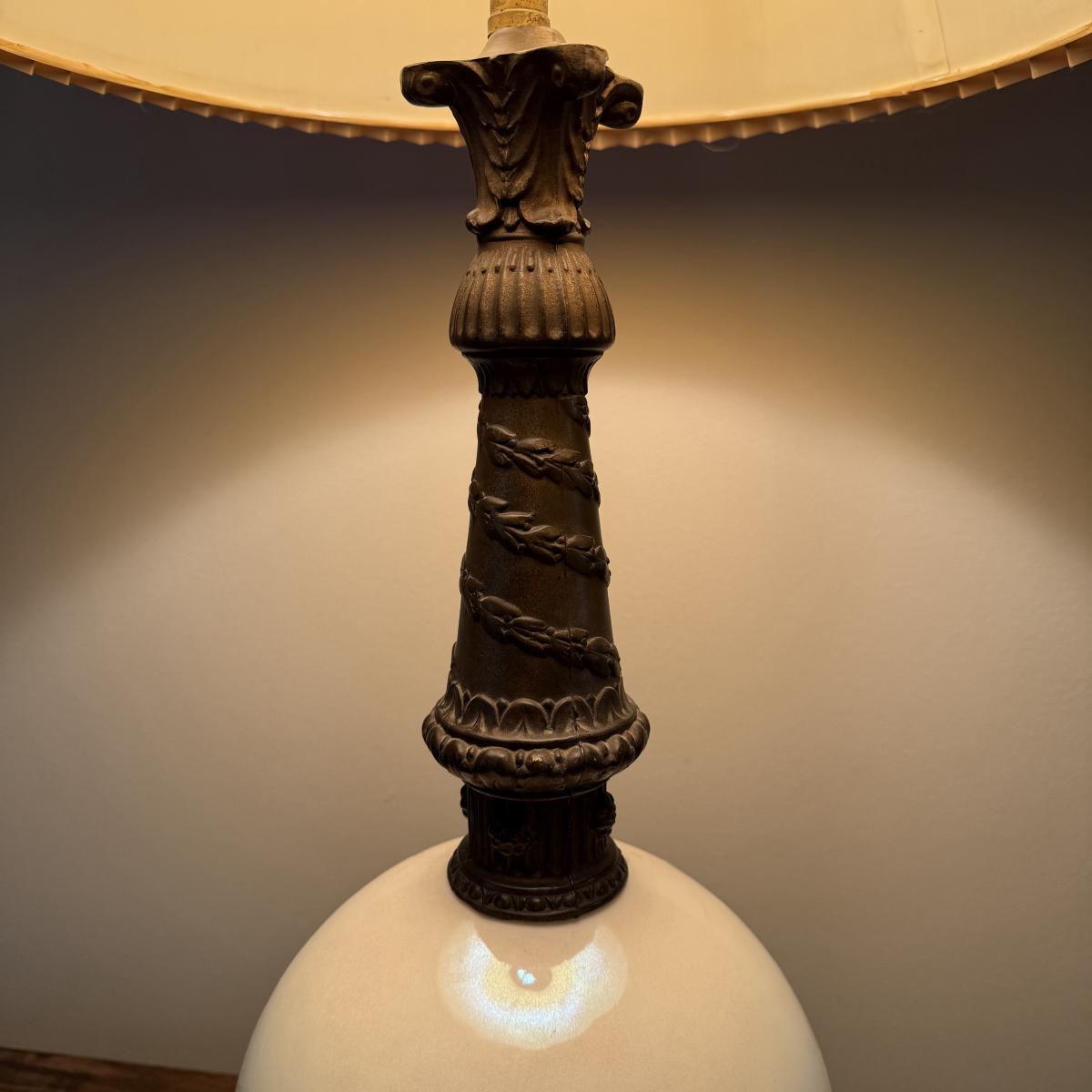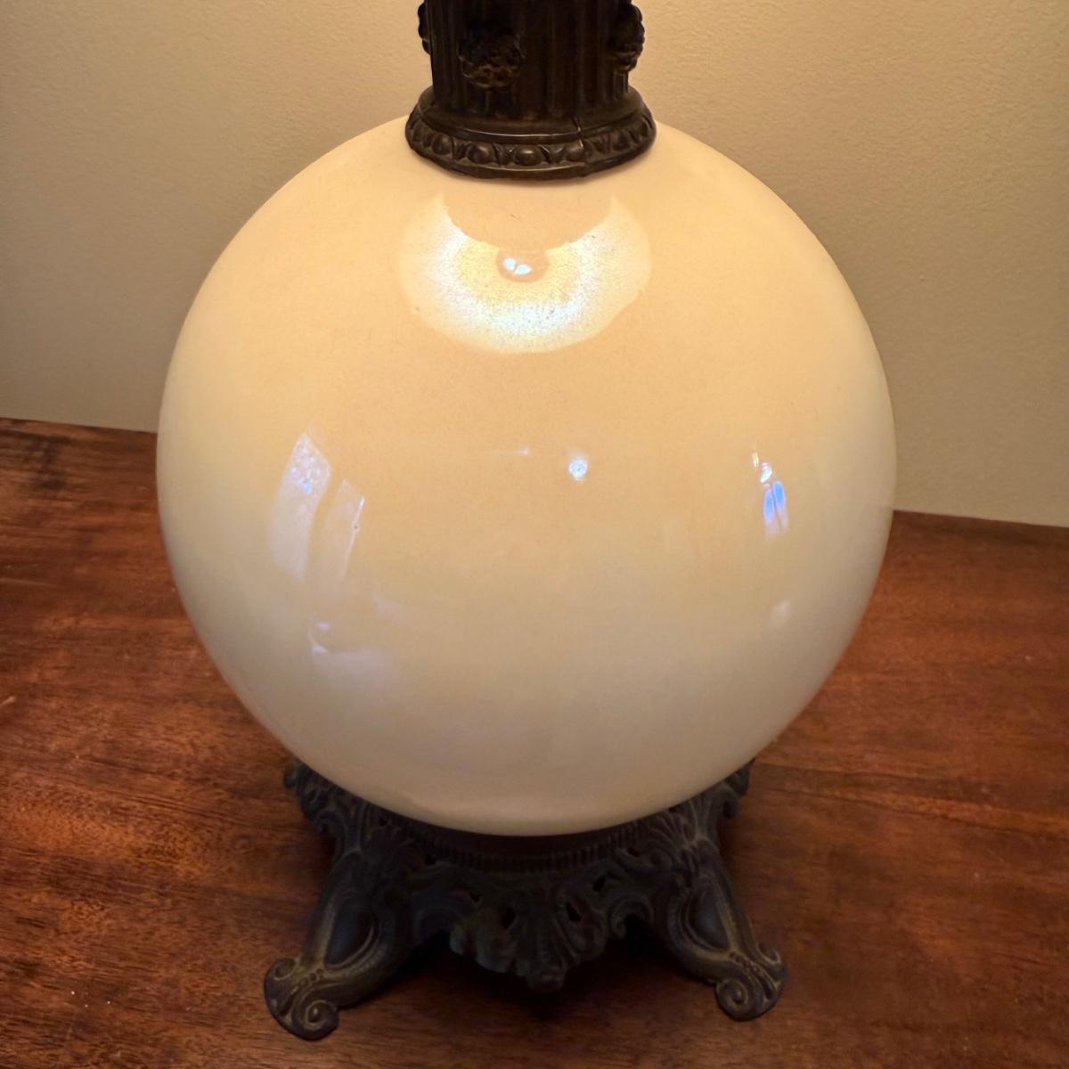 In this lot we have a stunning what appears to be brass table lamp with a stunning iridescent white globe base. This lamp measures 7” x 7” at the base and stands approximately 33”H. This is a one way lamp and is included with a corrugated lampshade. It does turn on. Shipping available. Shipping can be costly. We suggest contacting our preferred local shipping provider, Postage Express, with dimensions and getting an estimate before bidding: (828) 255-9250 or shipping@postageexpressnc.com.
