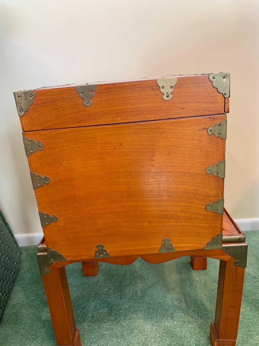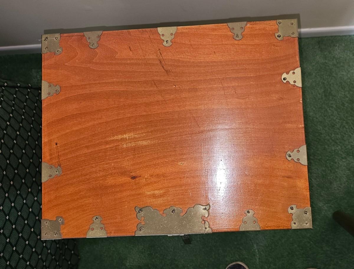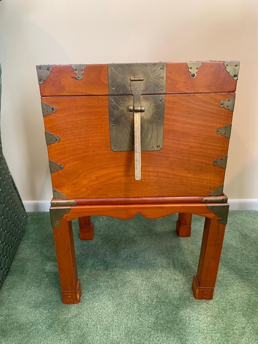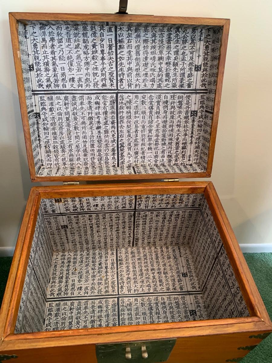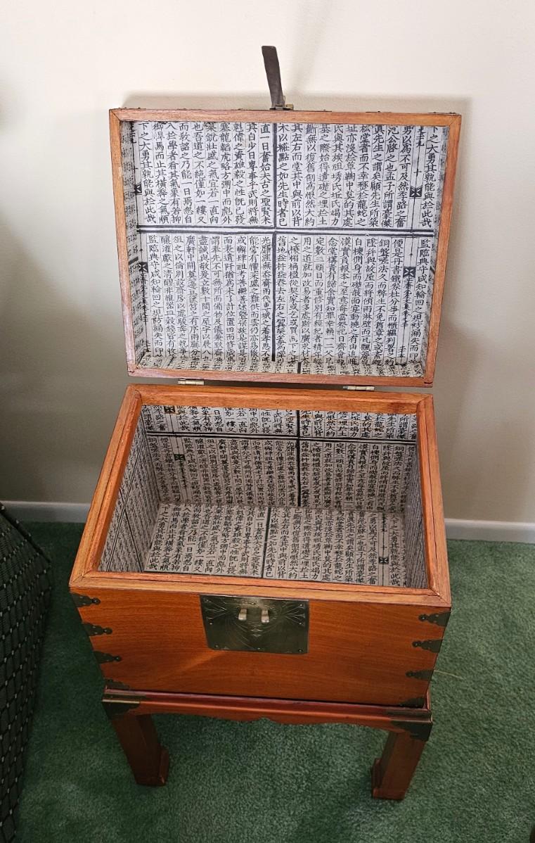 Brass and wood Asian box or Trunk on stand , lined with paper with writing on it