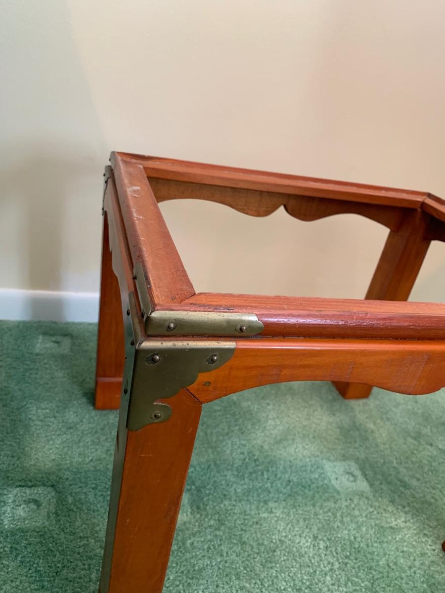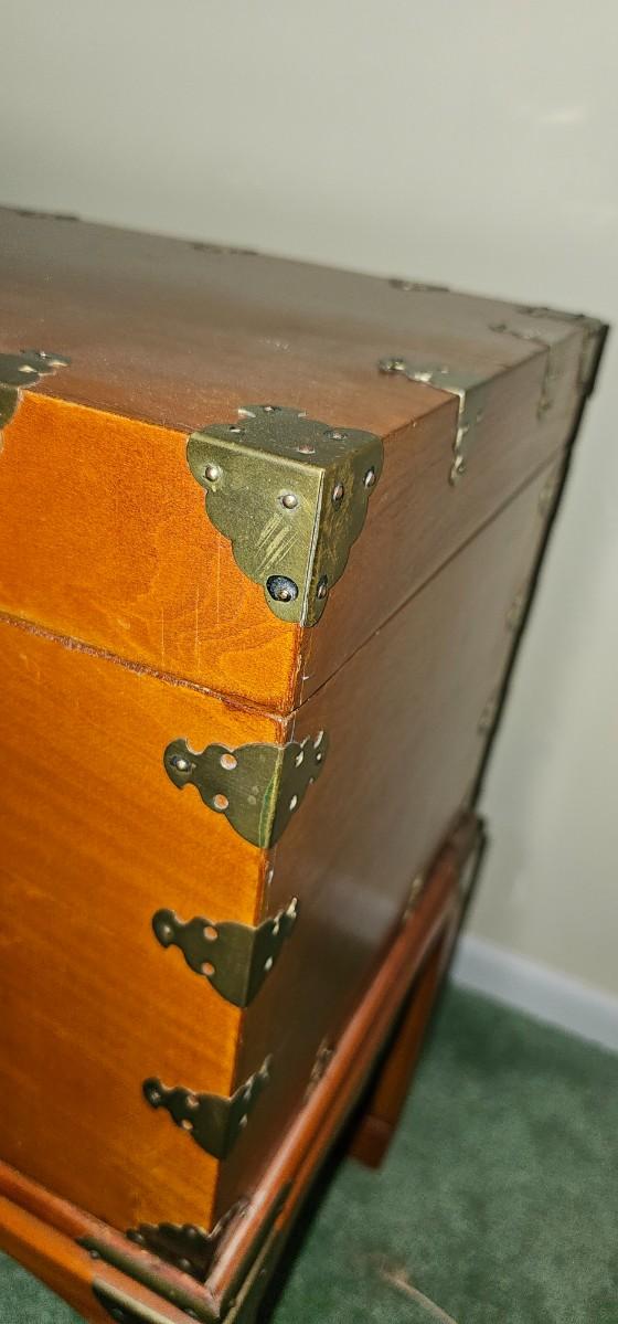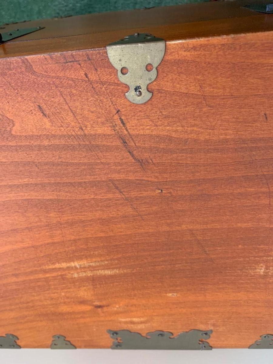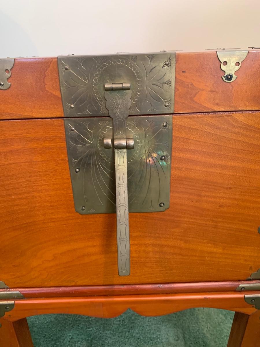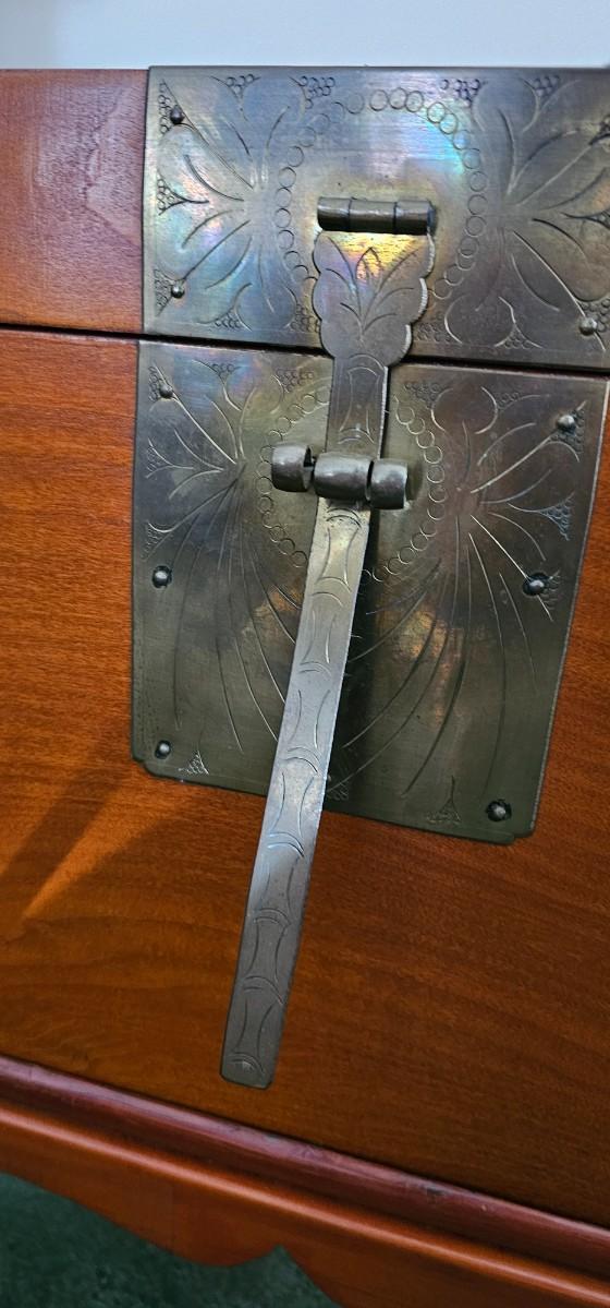 Brass and wood Asian box or Trunk on stand , lined with paper with writing on it