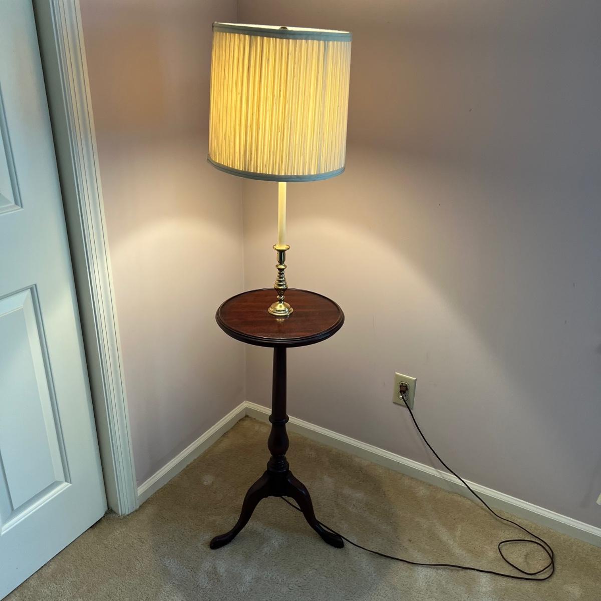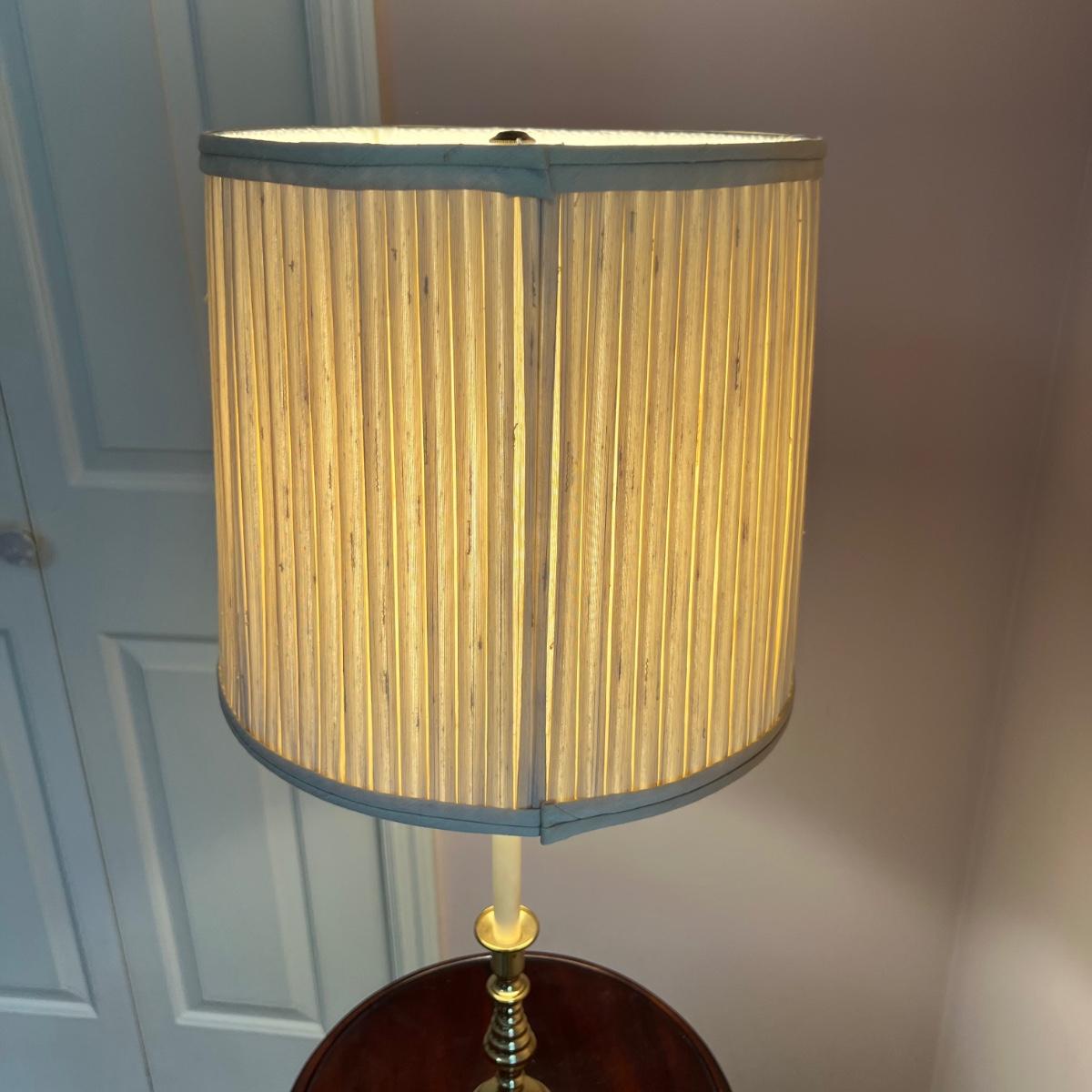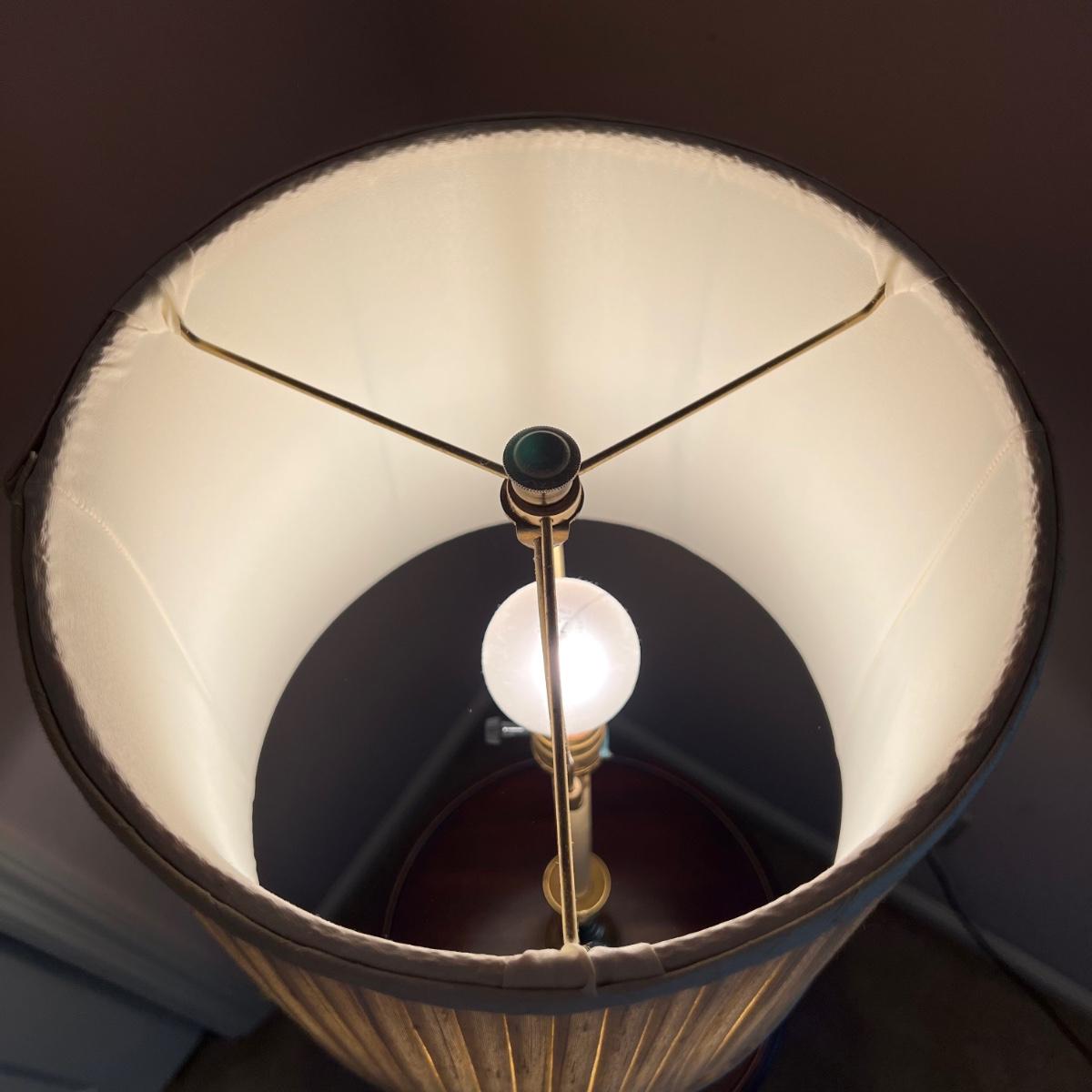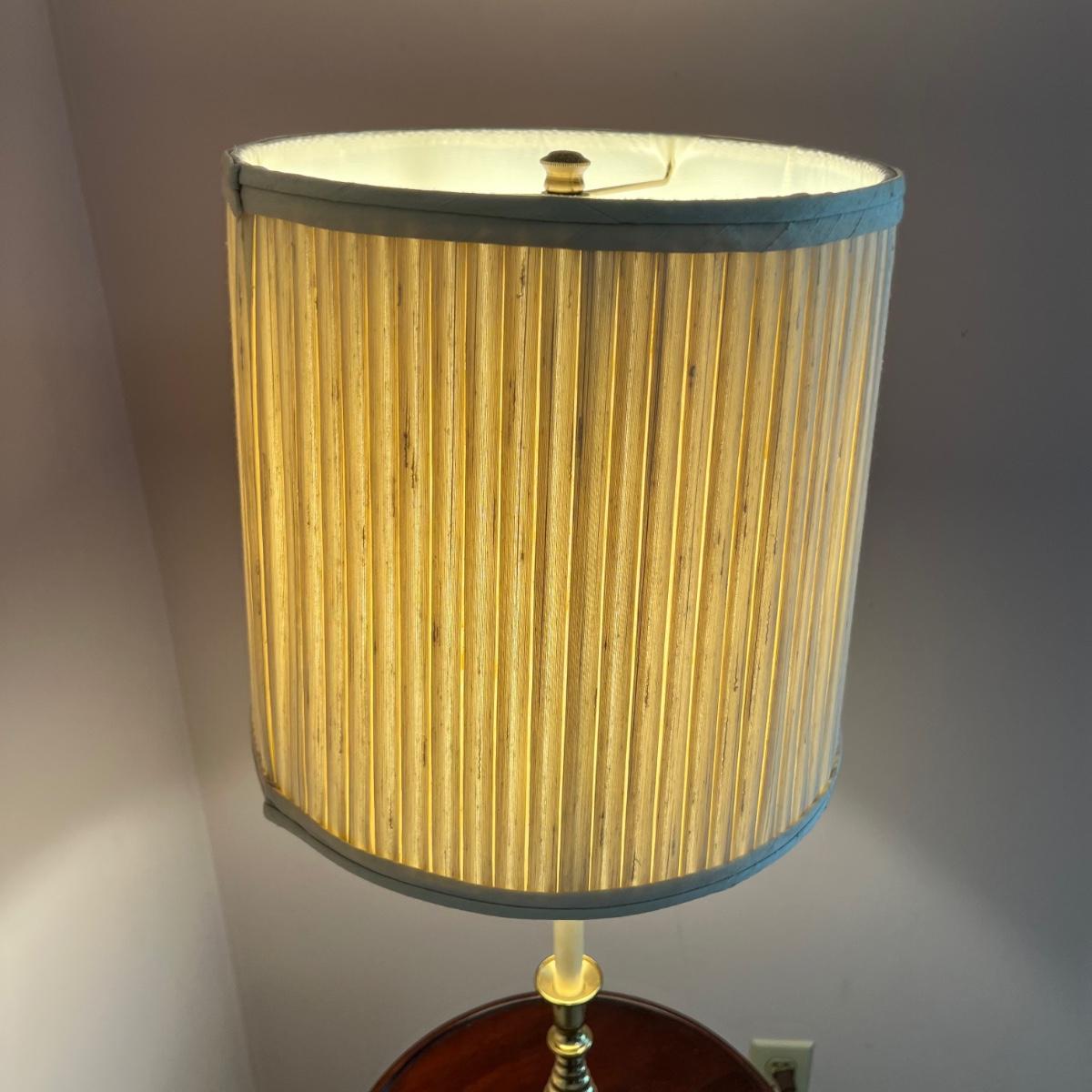 Mahogany-like wood, brass finish and fabric table lamp. Table lamp measures 54”H x 13.5”W and features one brightness setting. Cream fabric shade measures 11”W x 11”T. Note small tear in silk lining on interior of shade (see photo)