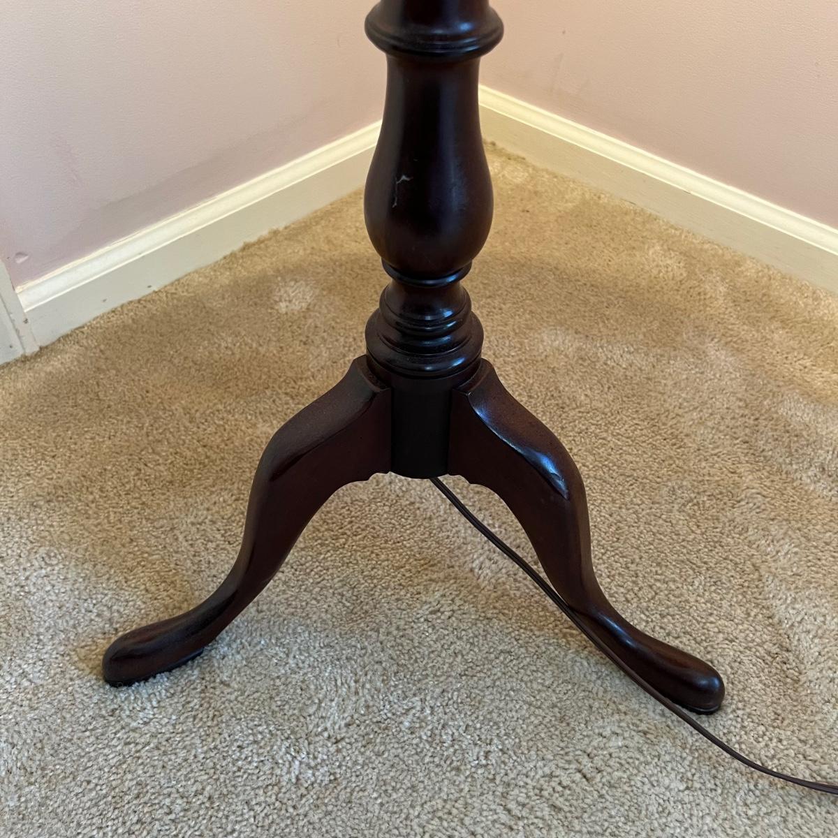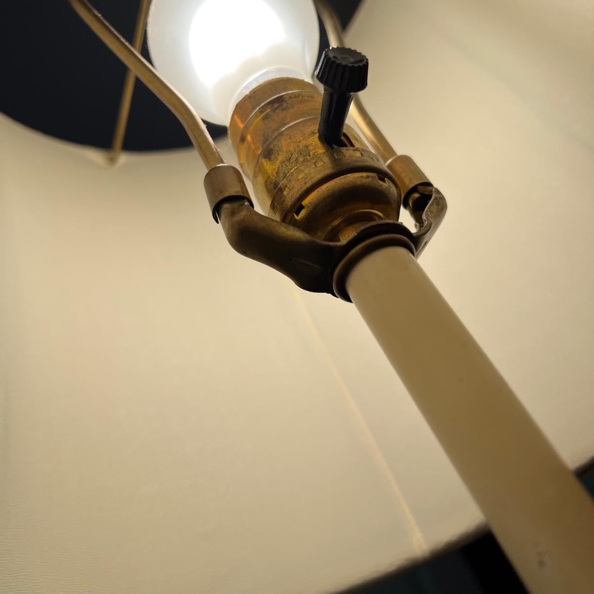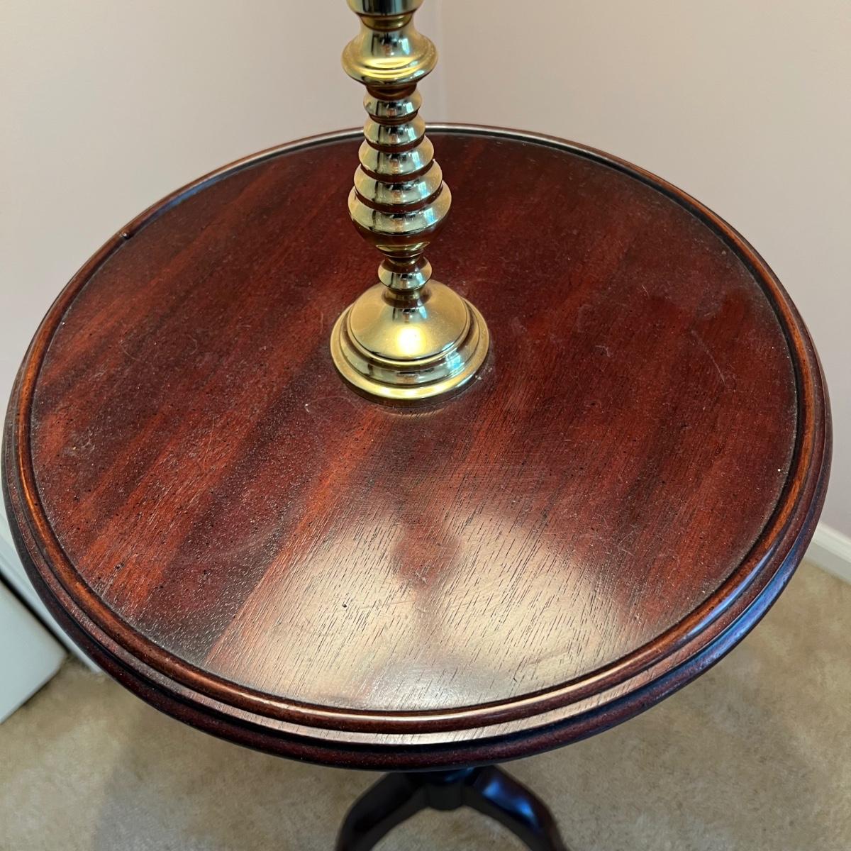 Mahogany-like wood, brass finish and fabric table lamp. Table lamp measures 54”H x 13.5”W and features one brightness setting. Cream fabric shade measures 11”W x 11”T. Note small tear in silk lining on interior of shade (see photo)