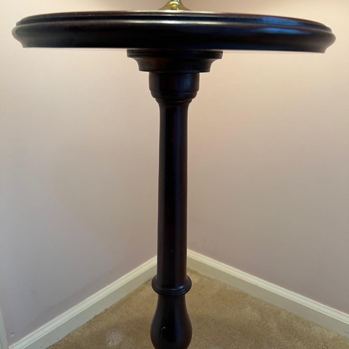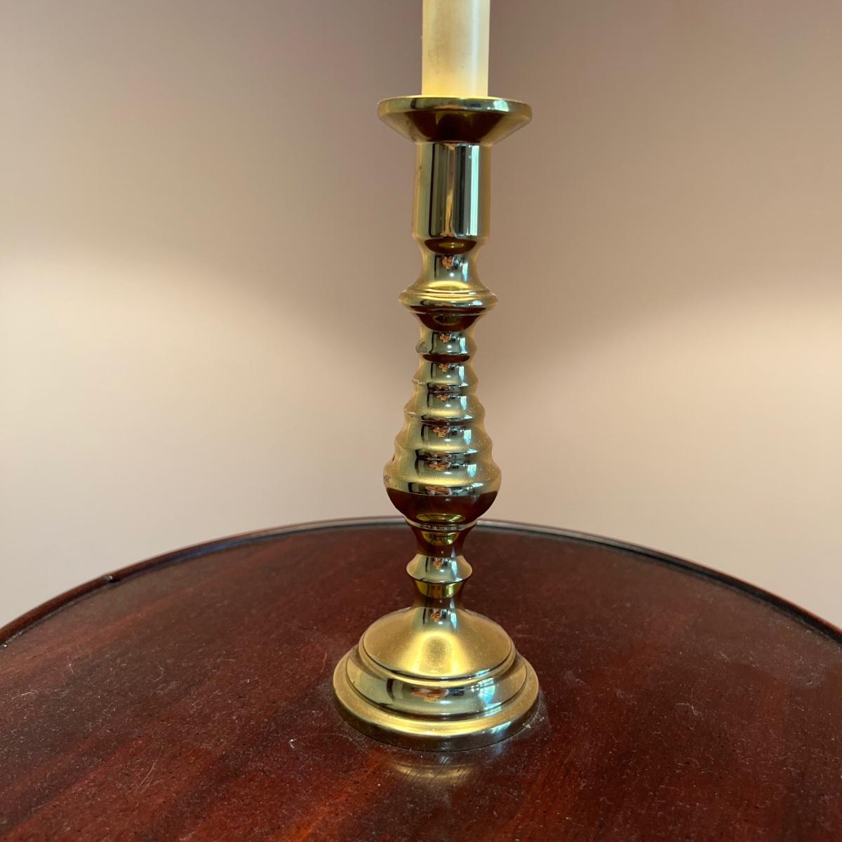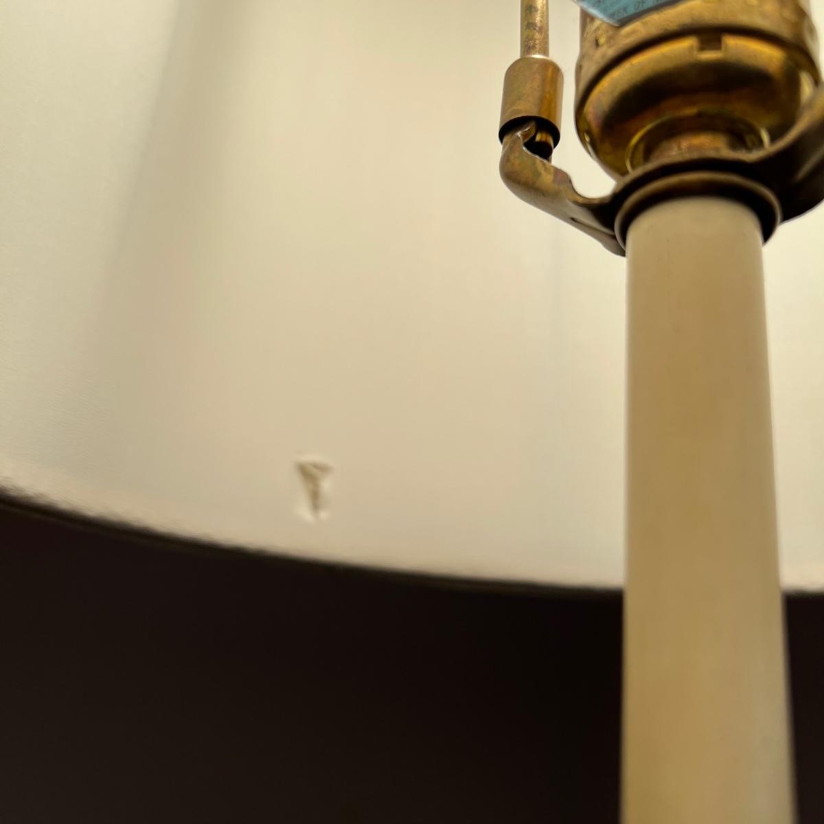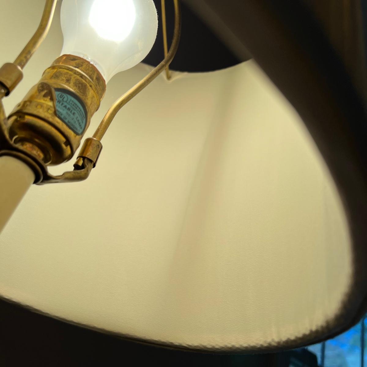 Mahogany-like wood, brass finish and fabric table lamp. Table lamp measures 54”H x 13.5”W and features one brightness setting. Cream fabric shade measures 11”W x 11”T. Note small tear in silk lining on interior of shade (see photo)